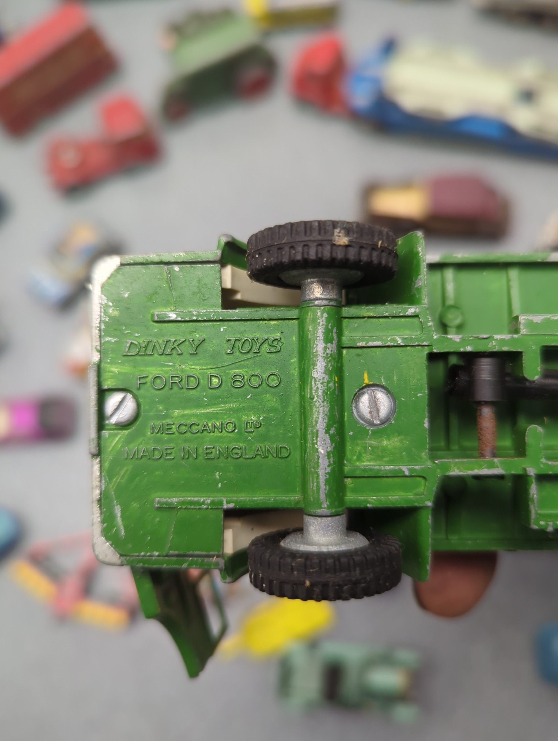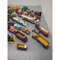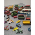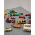 This lot includes a selection of Dinky Toys diecast vehicles, featuring a variety of models such as cars, trucks, and construction vehicles. The vehicles are intricately detailed with some branding visible, including "Meccano Ltd" and specific models like "Ford D800" and "Ford Transit Van". The collection showcases a mix of colours and vehicle types, ideal for any diecast enthusiast or collector.