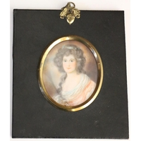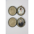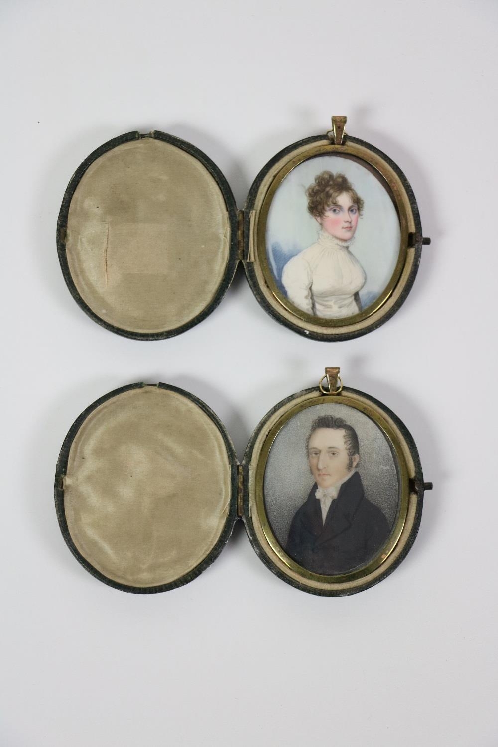 A. Buck, 18th Century Irish SchoolMiniatures: Good half length "Portrait of a Young Woman in white lace dress," and its companion, "Young Man with white bow tie and black coat," each approx. 6.5cms x 5.5cms (2 1/2" x 2 1/4") in oval brass frames, and matching leather cases. (2)
