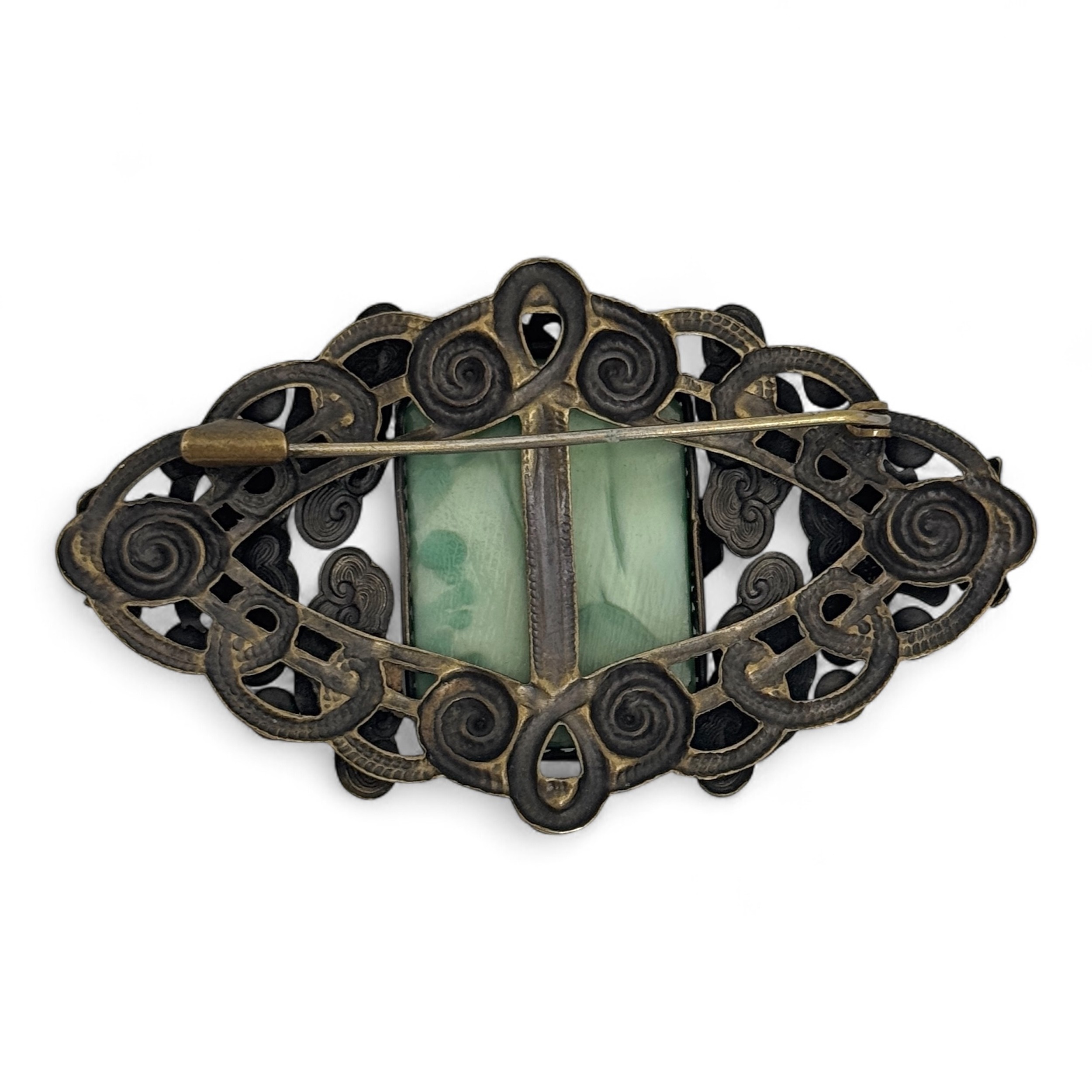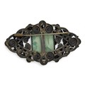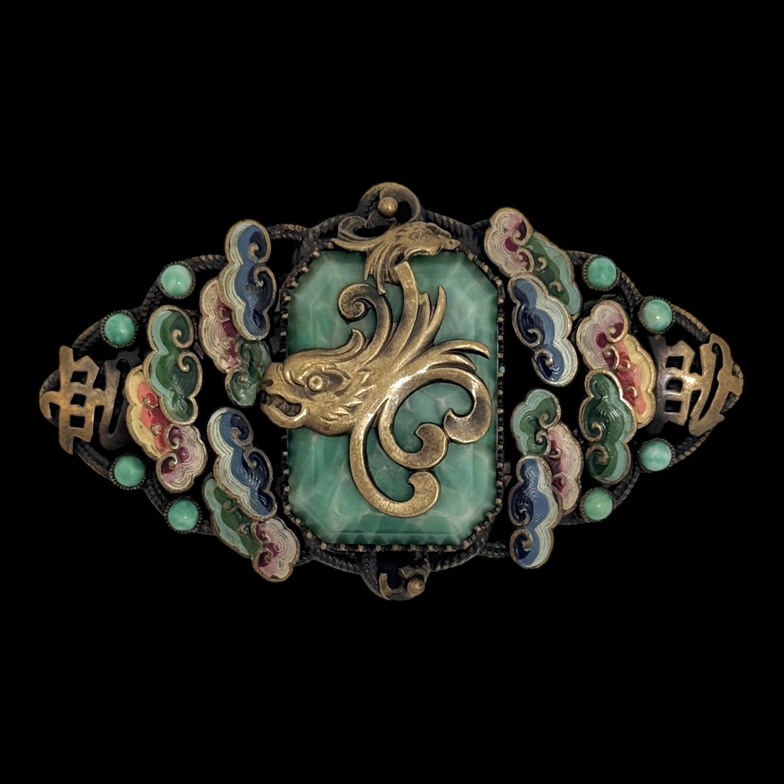 A 1930s Max Neiger Imperial Chinese Revival brooch. Lozenge form brooch decorated with gold coloured Chinese characters with polychrome enamel clouds around a faceted Peking glass centre with gold coloured dragon's head, 7cm length, 4.2cm width. (LDC13223)