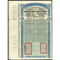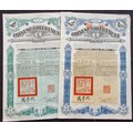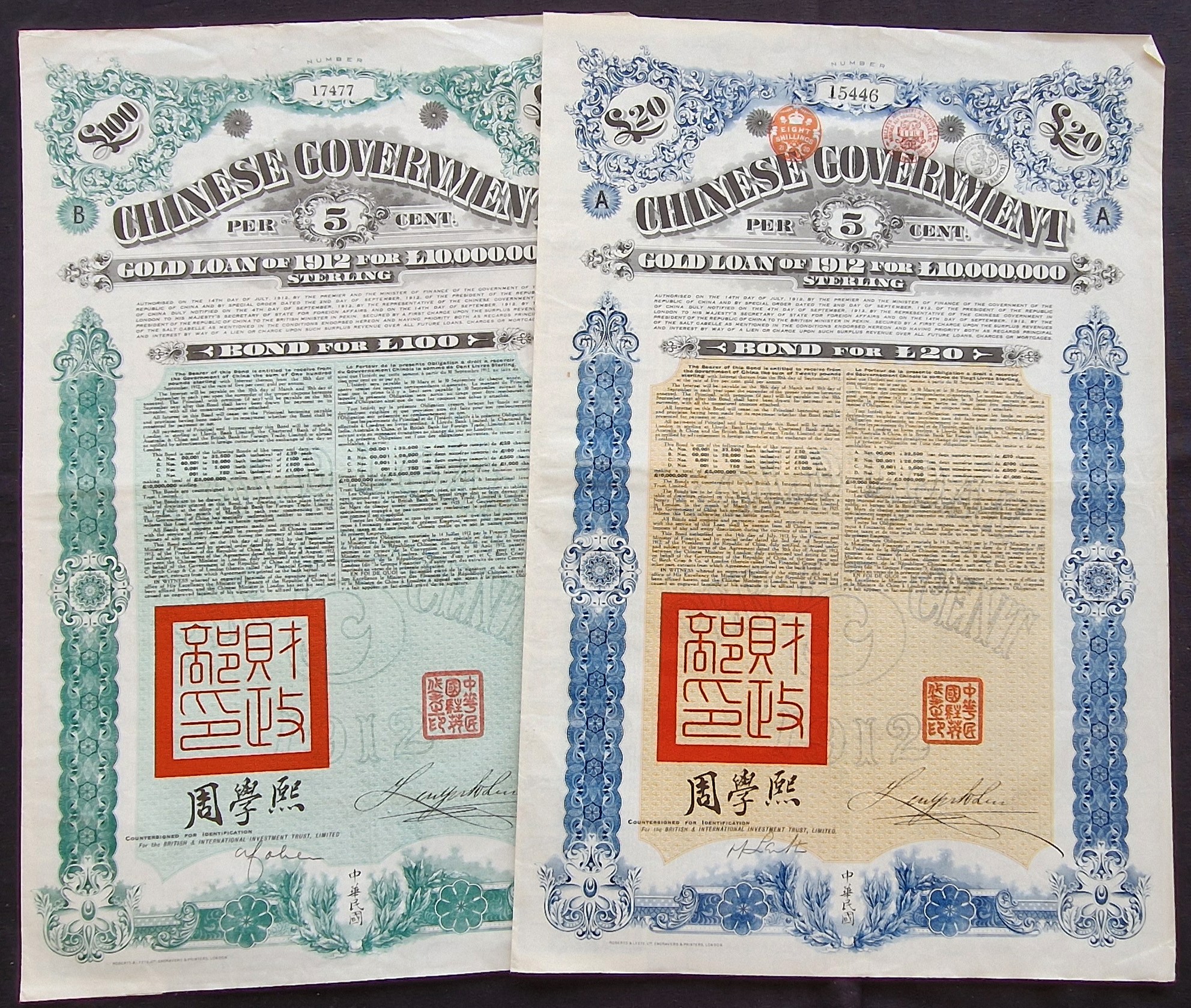 China: 1912 5% Gold 'Crisp' Loan, bonds for £20 and £100, blue with yellow underprint and turquoise respectively, with coupons. VF or better (2).