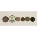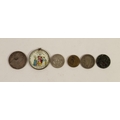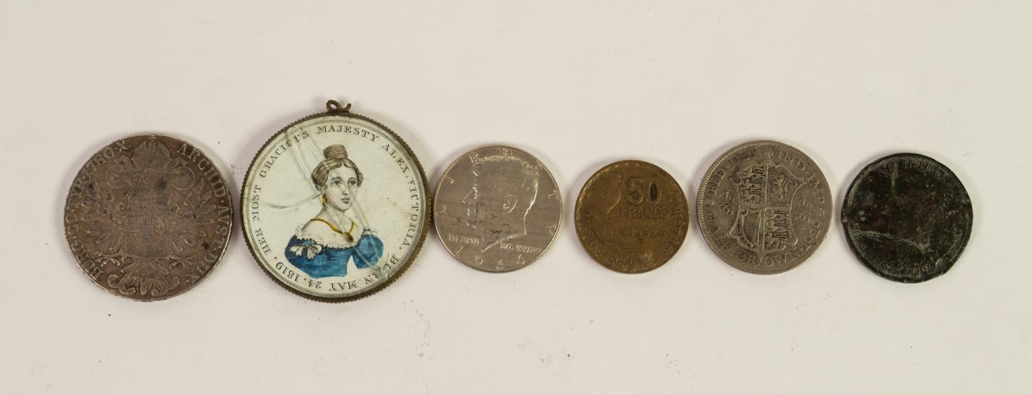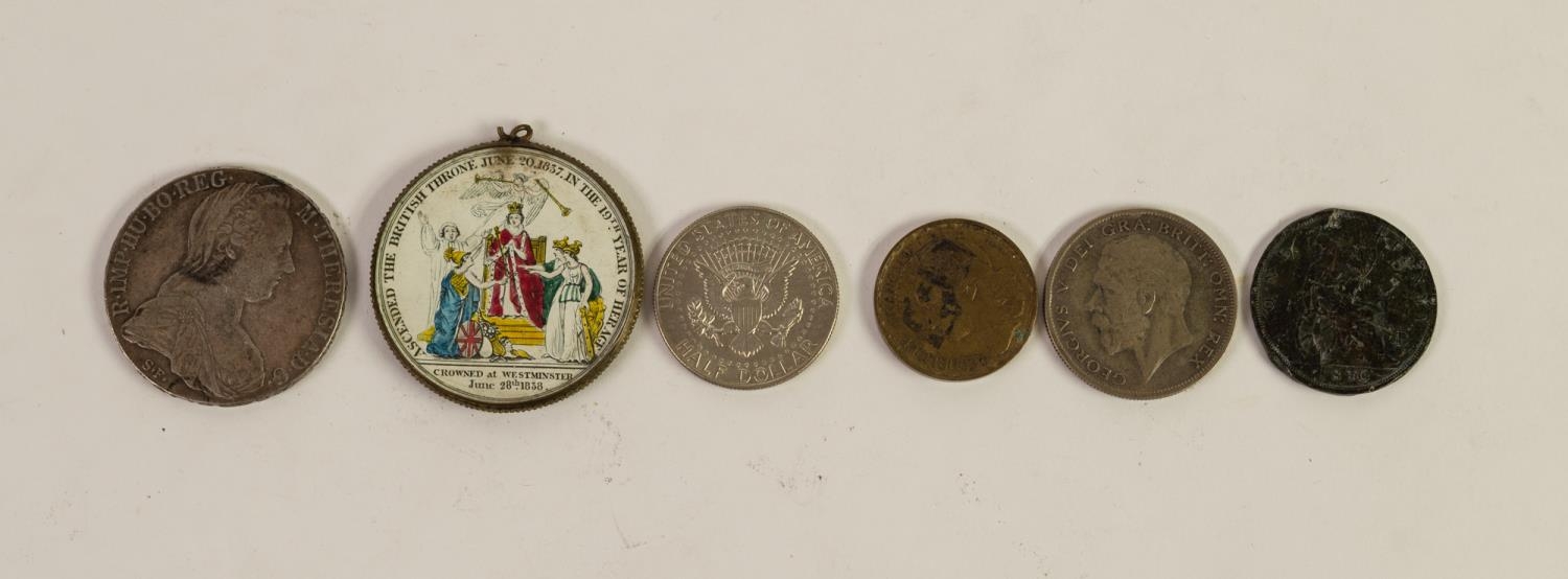 PRINTED AND PAINTED ENAMEL (?) CIRCULAR COMMEMORATIVE MEDALLION OR PENDANT, CORONATION OF QUEEN VICTORIA 1837, in the 19th year of her age, one side showing Victoria on throne and dais with Britannia and angels, young bust to the reverse, gilt metal mount and glazed, 1 3/4in (4.5cm) diameter, one glass cracked, together with a MARIA THERESA SILVER THALER (F); GEORGE V HALF CROWN 1927 (F) AND THREE OTHER COINS (6)