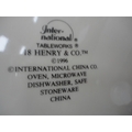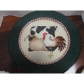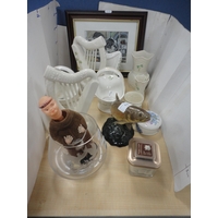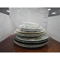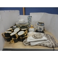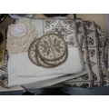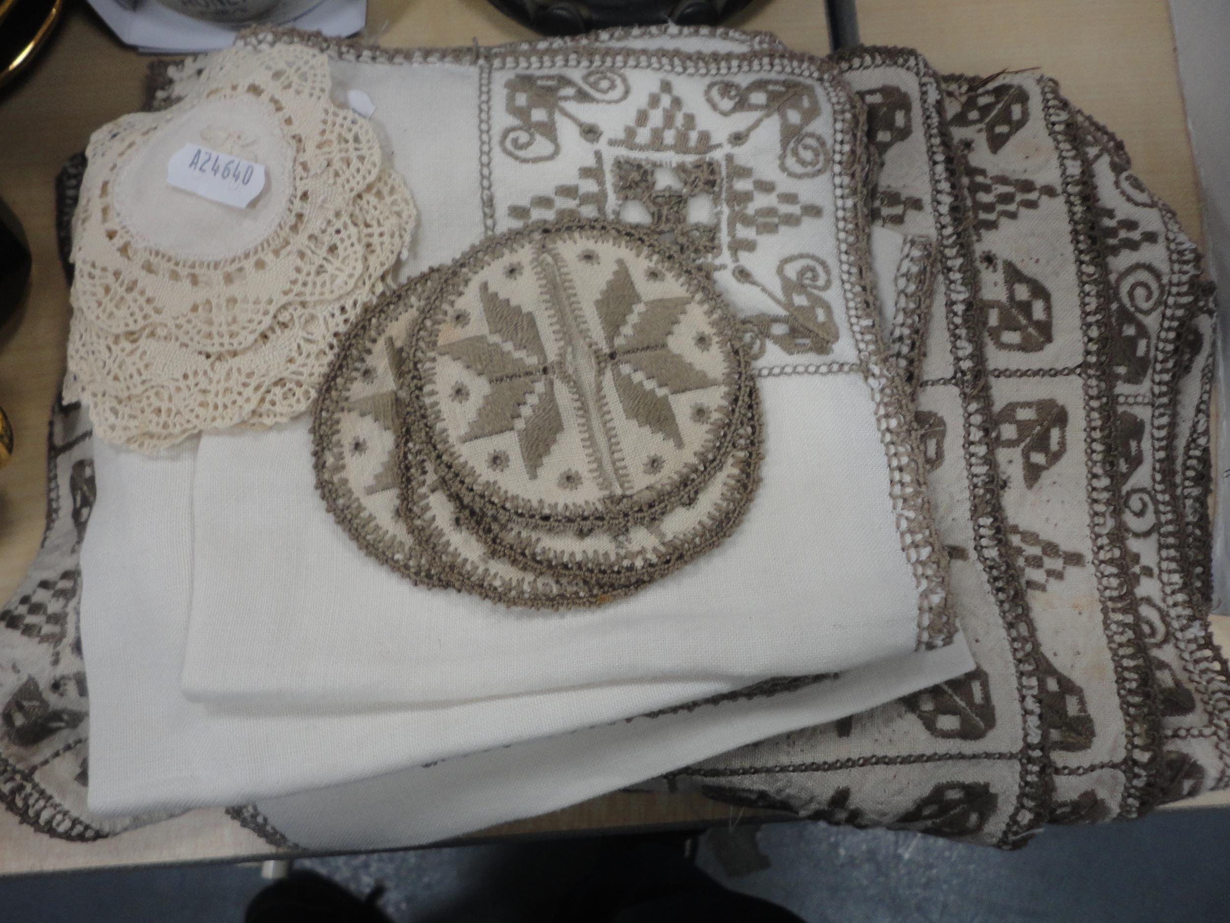 Assorted porcelain to include biscuit plates, French green glazed coffee set, Losol Ware toothbrush holder, also table linen, Oriental hardwood stand, glassware etc.