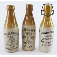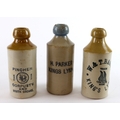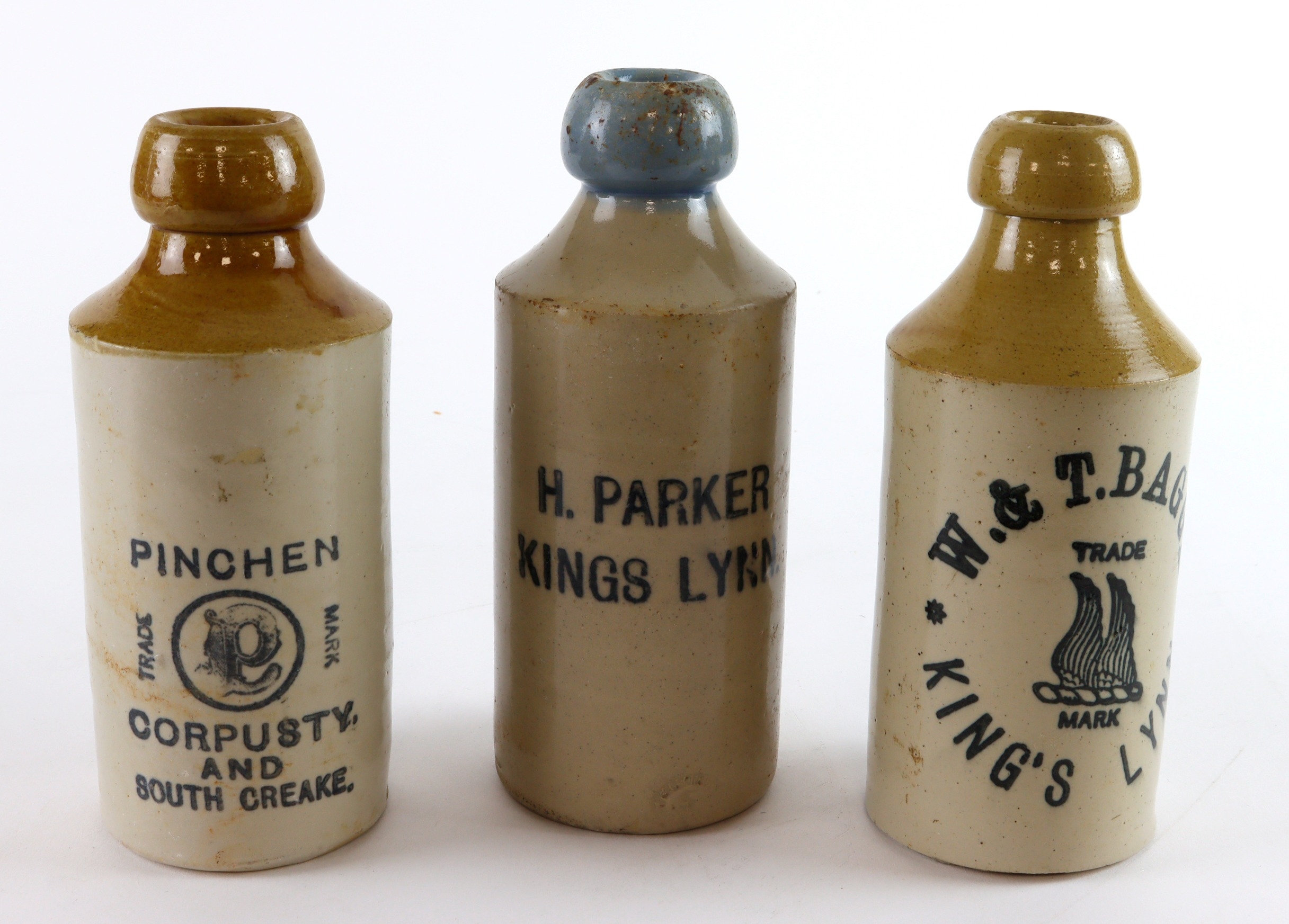 Stoneware Pottery Ginger Beer Bottles (3), comprising two for King's Lynn, the blue top for H. Parker and the other for W & T Bagge, along with one for Pinchen, Corpusty and South Creake, two made by Bourne of Derby and one possibly made by Gibson & Co