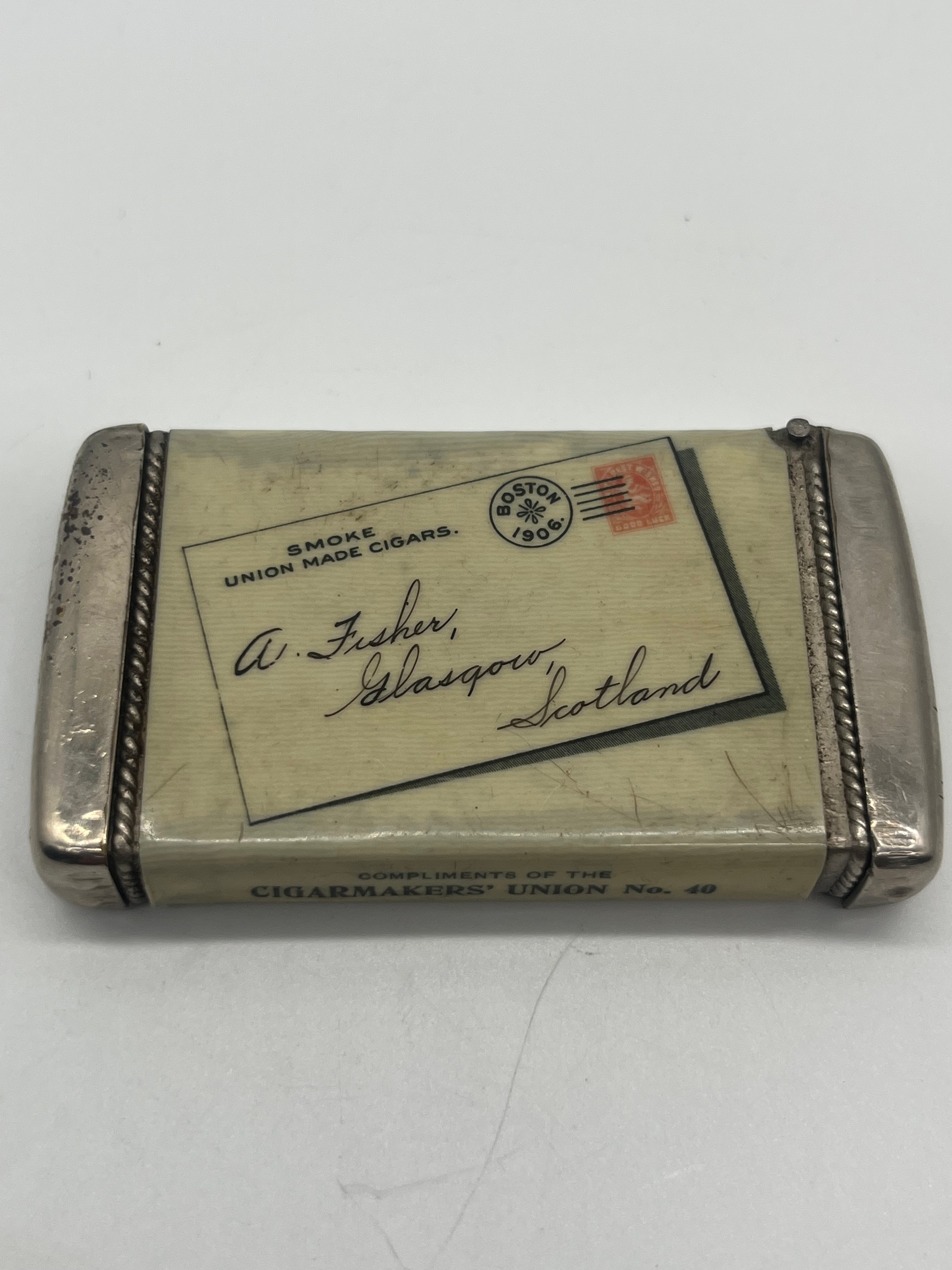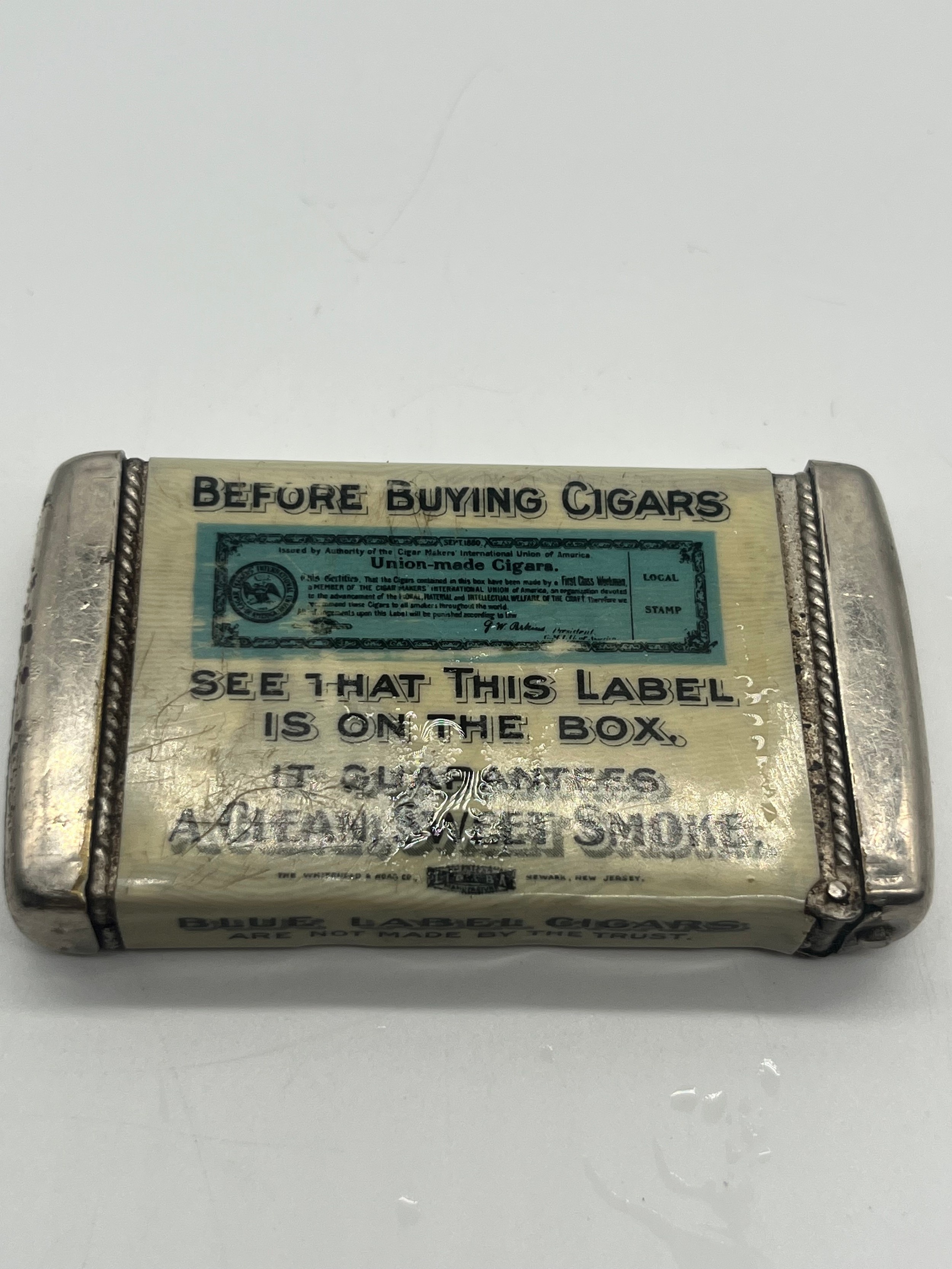 Vintage white metal celluloid wrap vesta case for cigar makers union, 2.75"