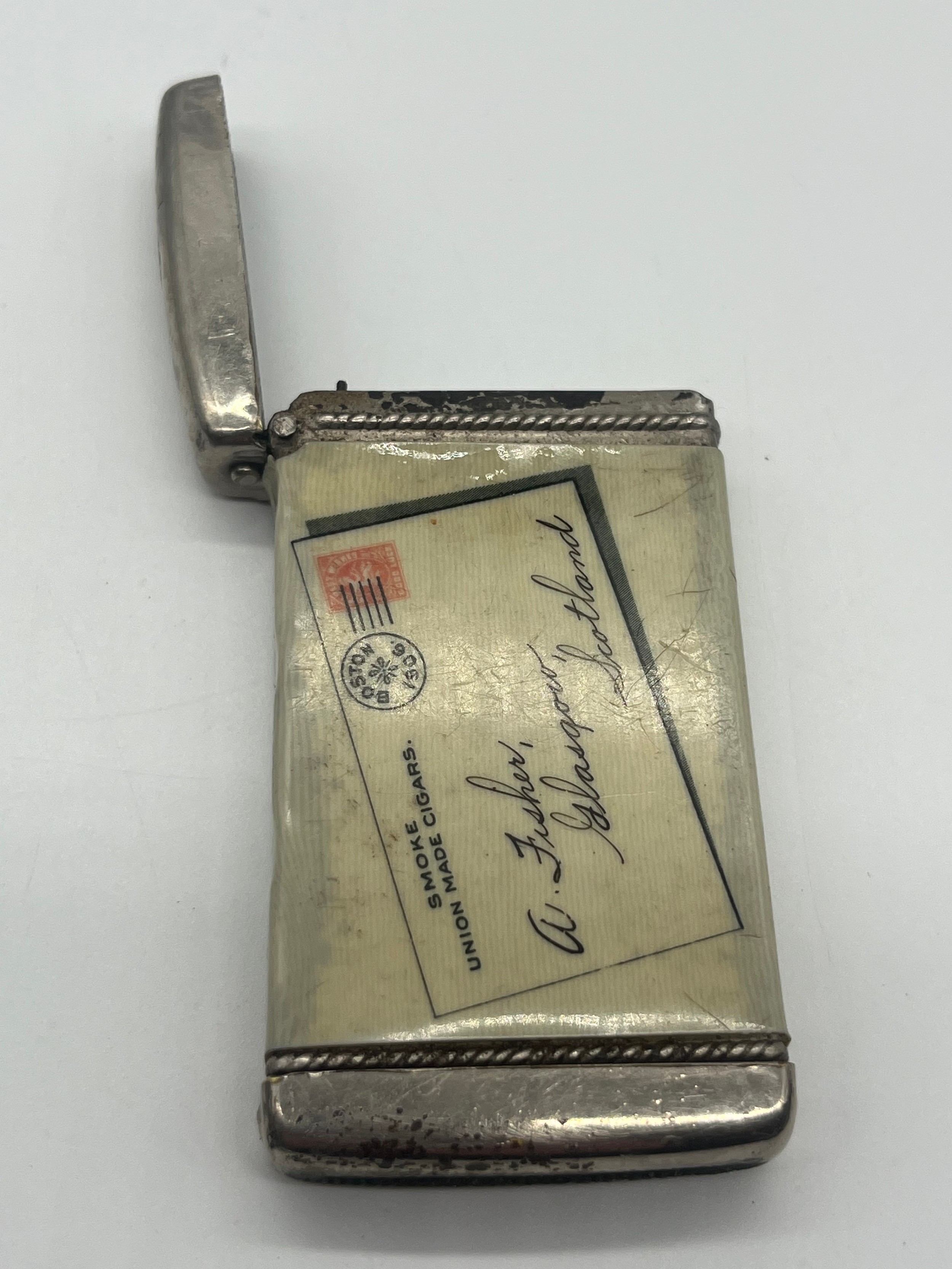 Vintage white metal celluloid wrap vesta case for cigar make...