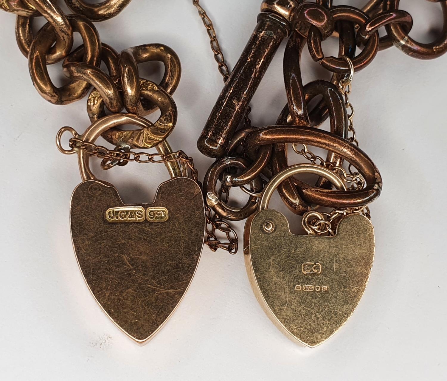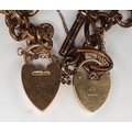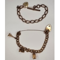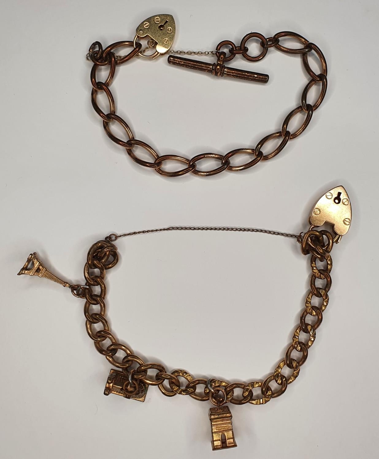 Two metal bracelet chains, one with a few metal charms but both with marked 9ct gold locks (2),