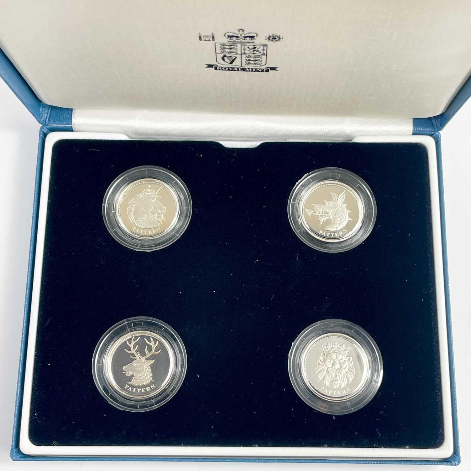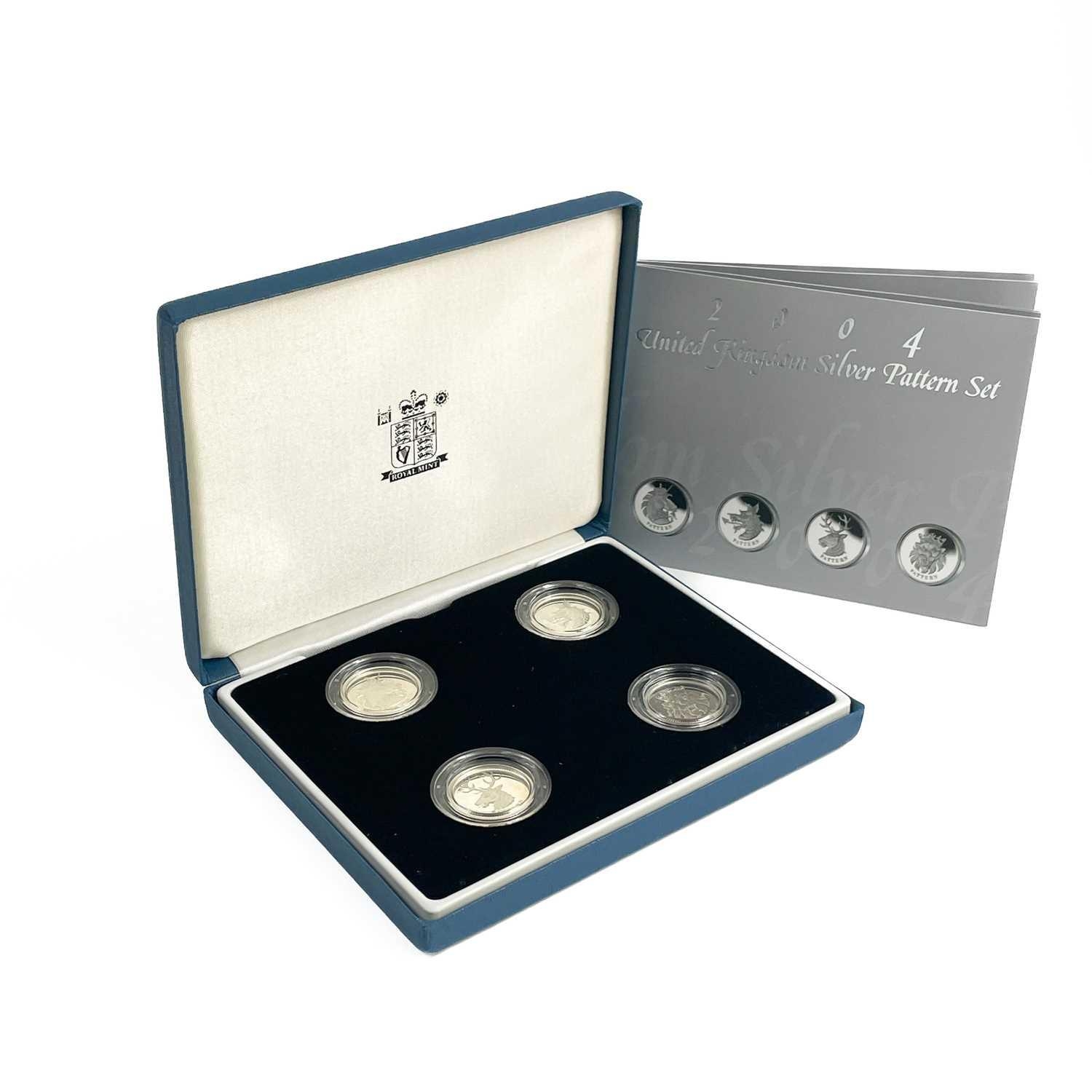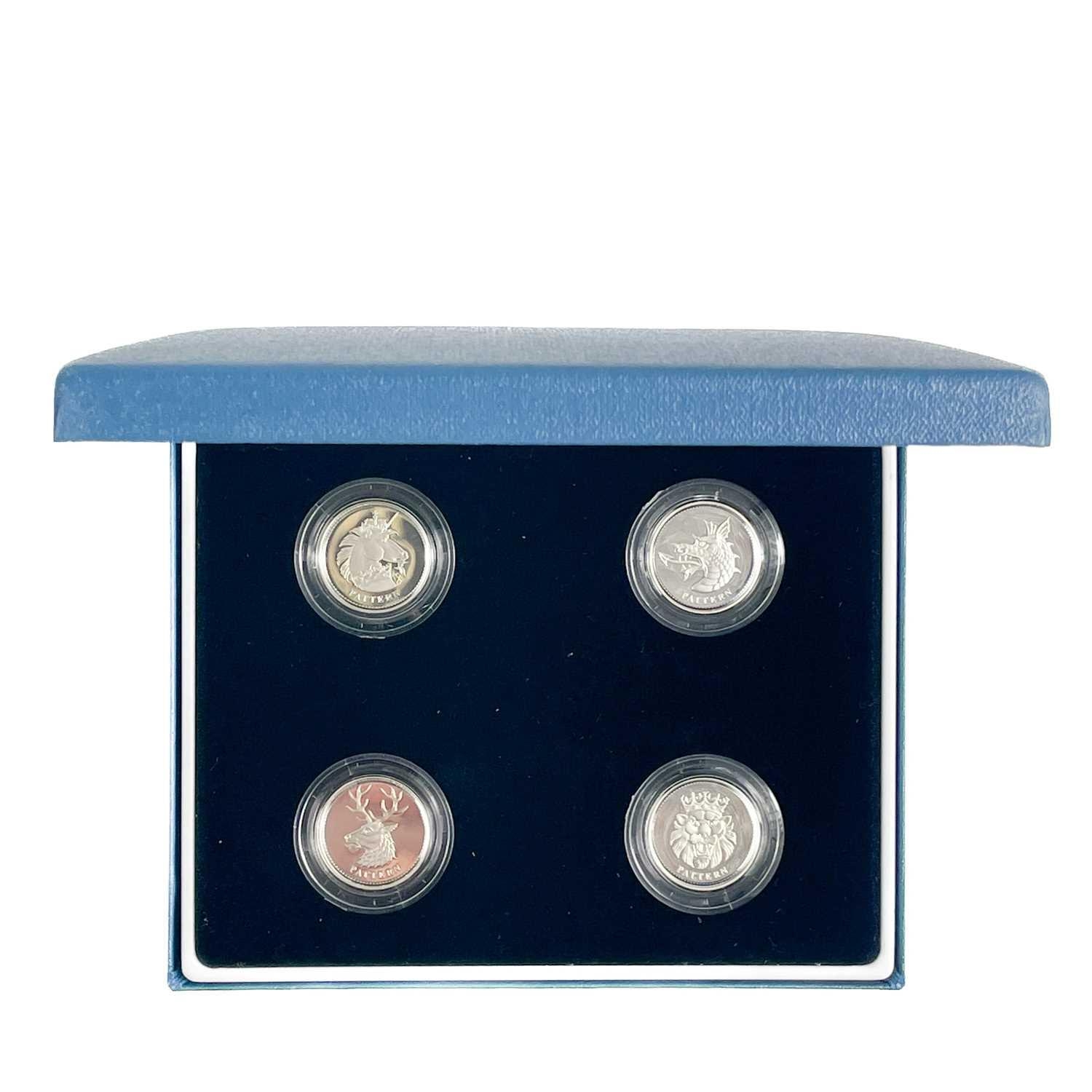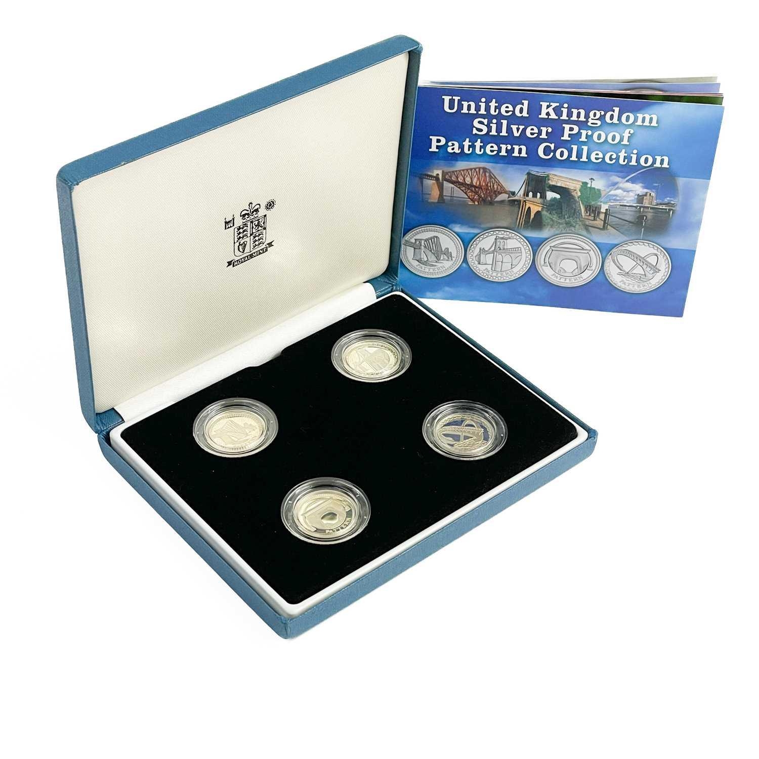 UK Silver Proof '£1 Size' Pattern Coins for 2003 and 2004 in Royal Mint Boxes. Comprising: 1: 2003 4 coin bridges of the UK Nations boxed set. 2: 2004 4 coin (unicorn, dragon, white hart & lion) boxed set. Total of 8 coins. All have certificates of authenticity.