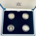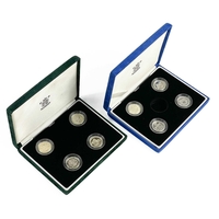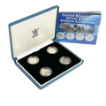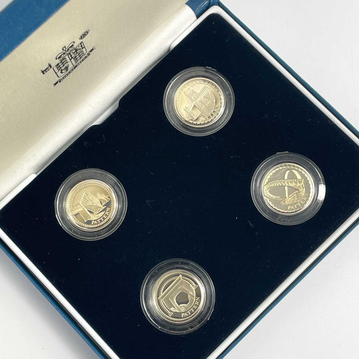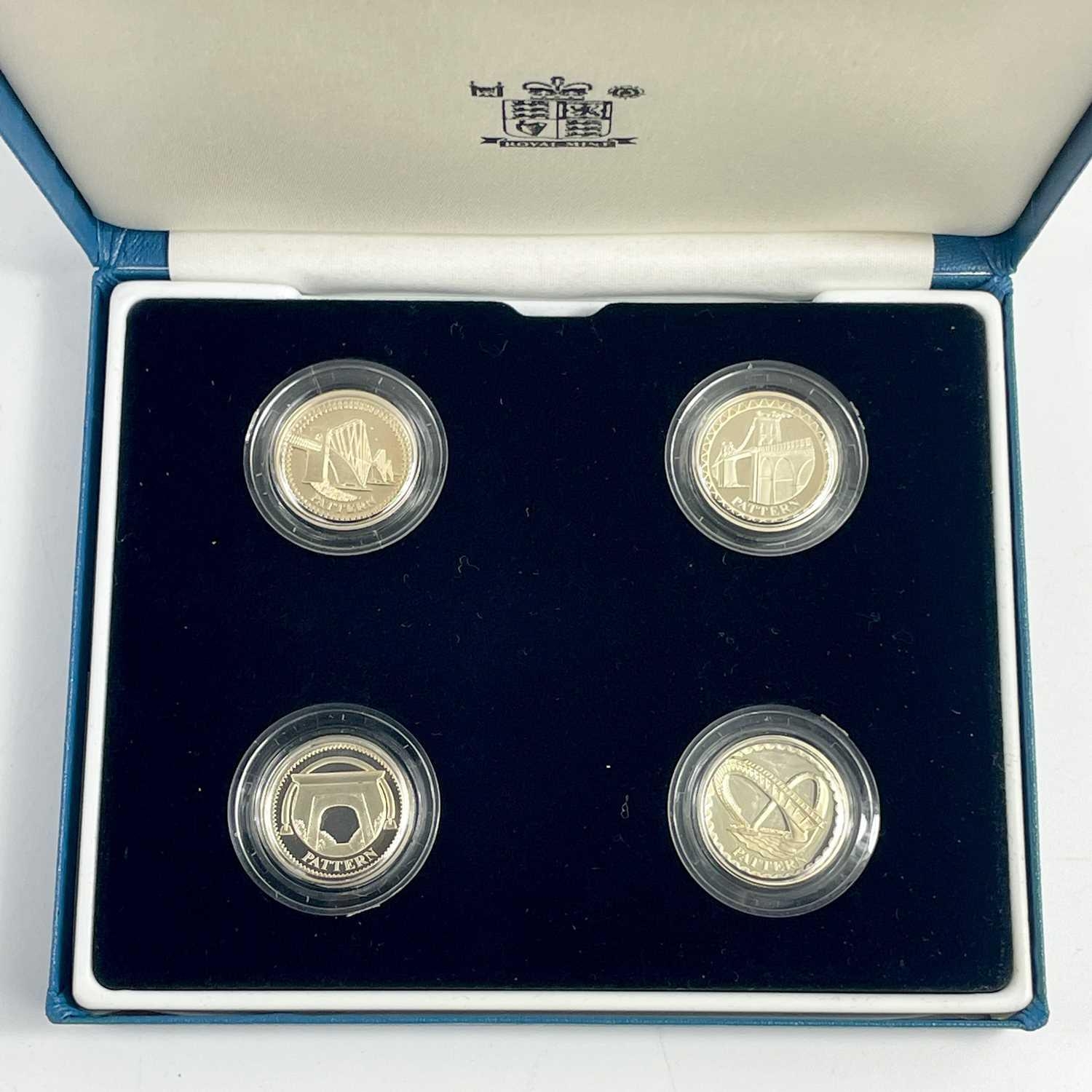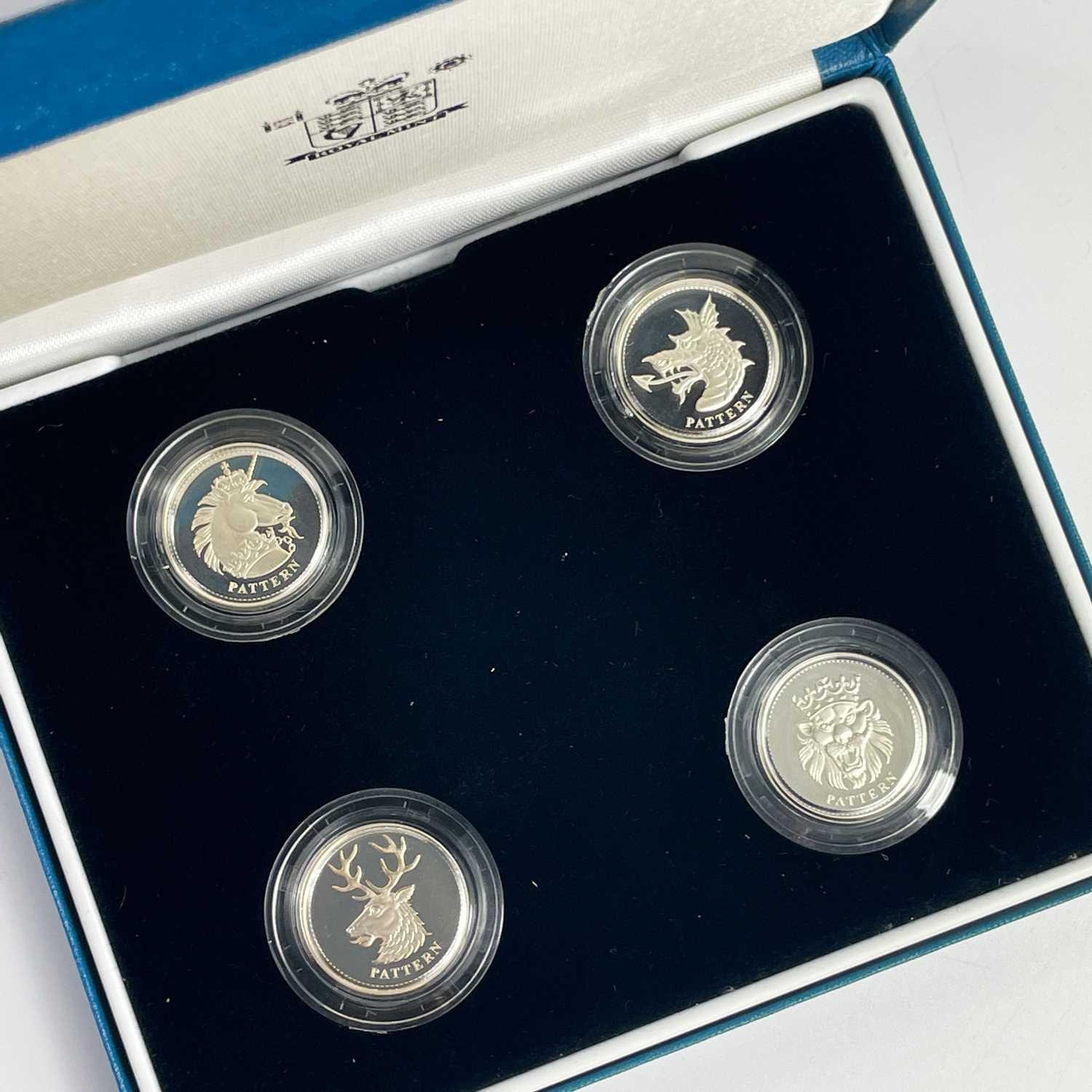 UK Silver Proof '£1 Size' Pattern Coins for 2003 and 2004 in Royal Mint Boxes. Comprising: 1: 2003 4 coin bridges of the UK Nations boxed set. 2: 2004 4 coin (unicorn, dragon, white hart & lion) boxed set. Total of 8 coins. All have certificates of authenticity.