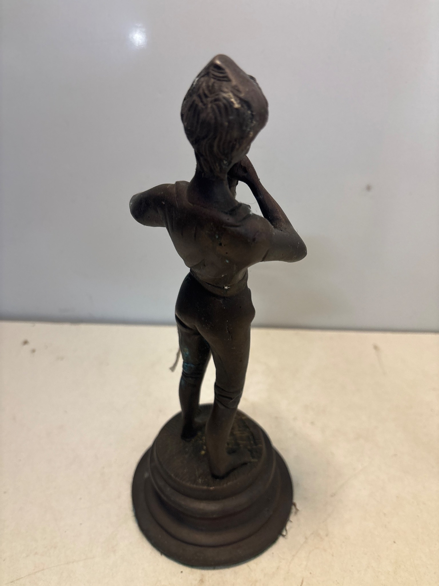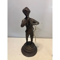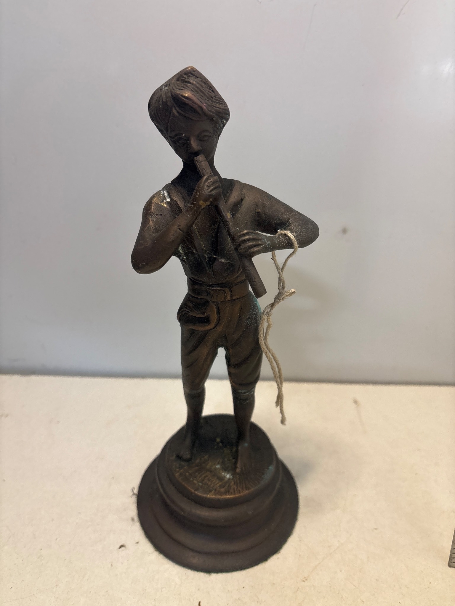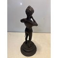 Bronze figurine depicting a flute player with detailed features, standing on a round pedestal base. Measures approximately 8 inches tall.