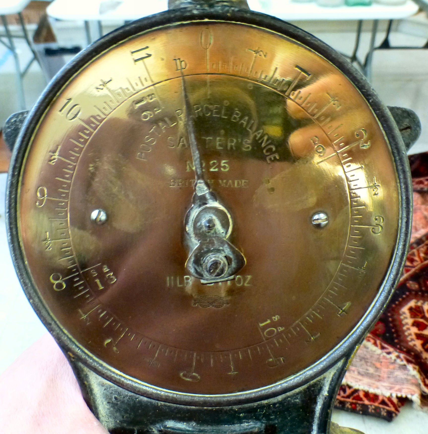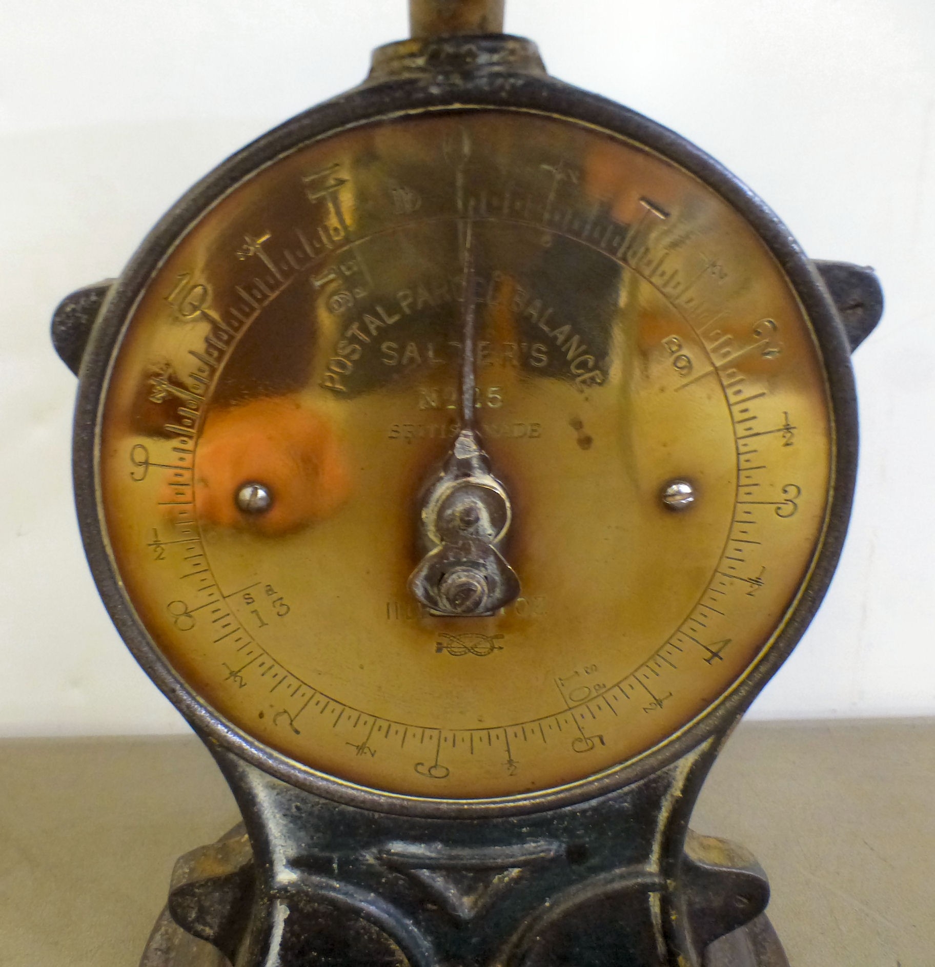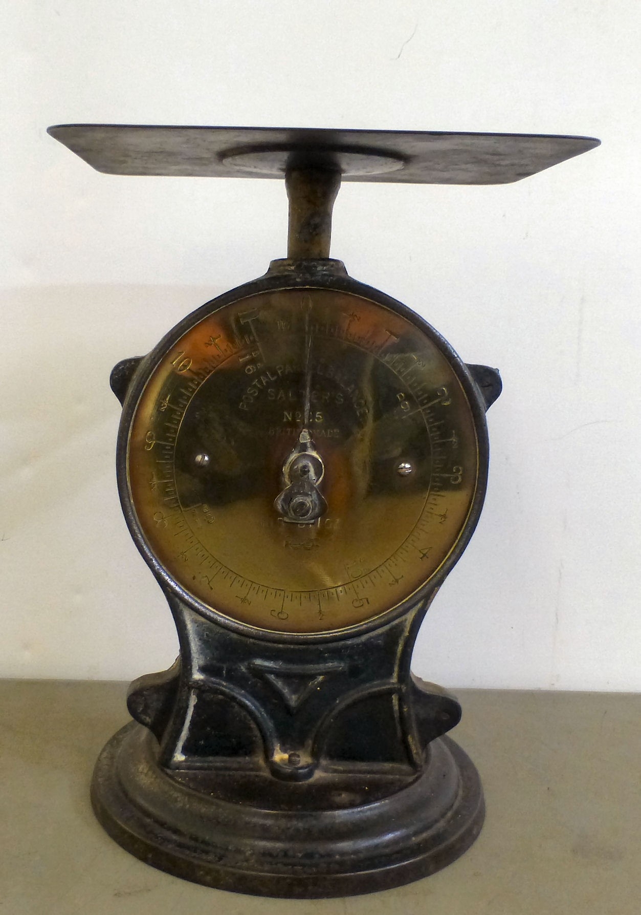 A set of vintage cast iron Salters postal parcel balance scales model no.25 9"h