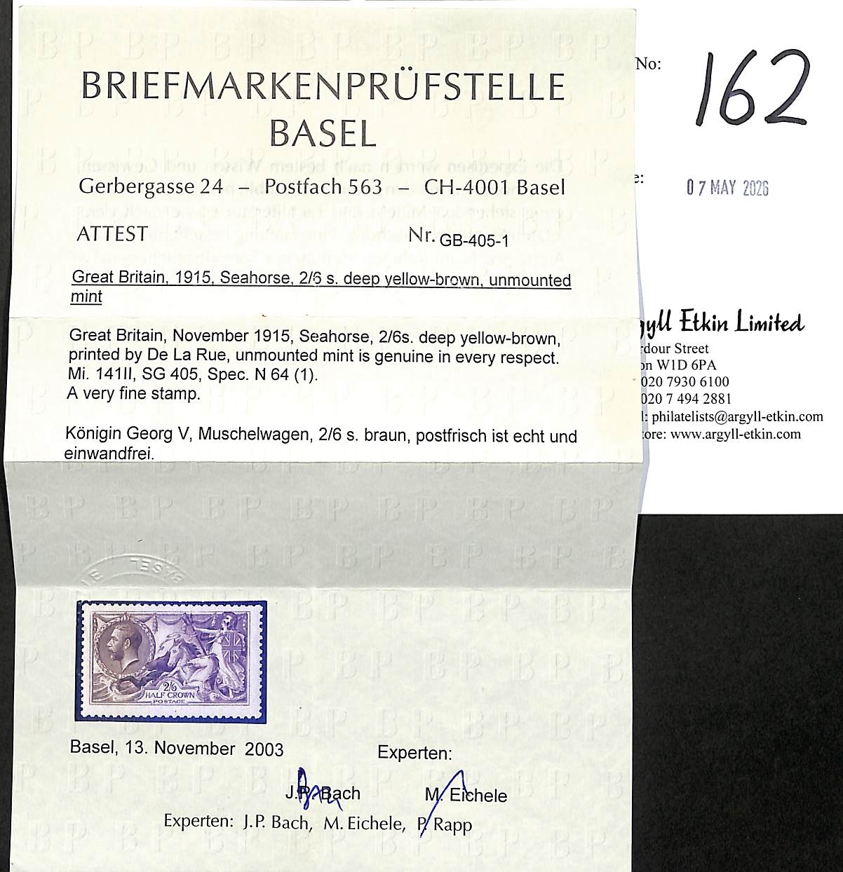 1915 De la Rue 2/6 sepia (seal brown), two unmounted mint singles, a darker shade centred slightly high, lighter shade with a few clipped perf ends but showing an unusual kiss print effect with clear doubling at right. The darker shade with 2003 Basel Certificate as S.G. 405. S.G. 408, £1,200 (2). Photo on Page 24.