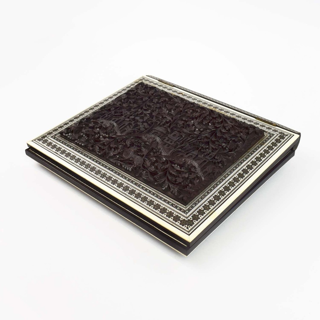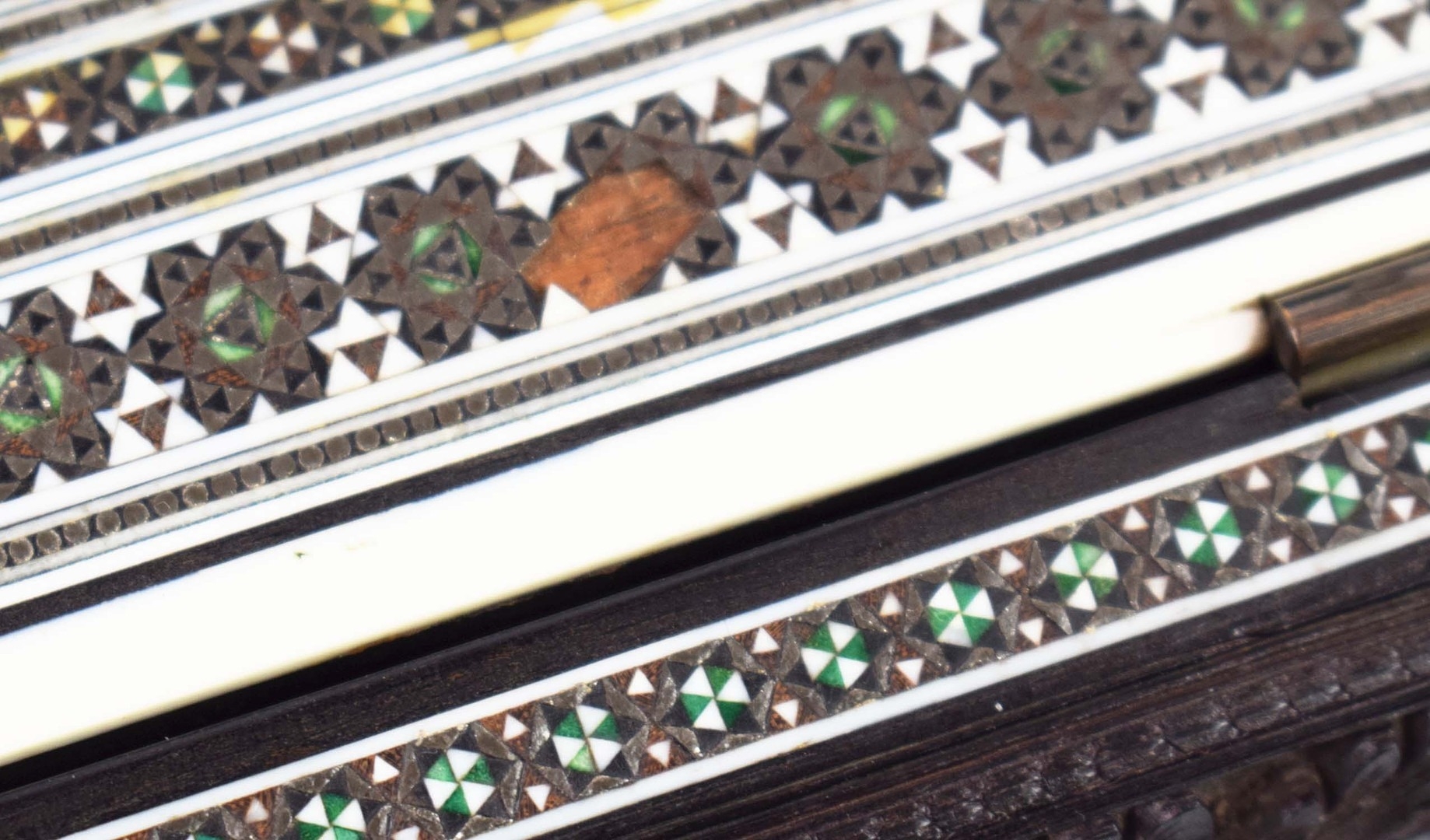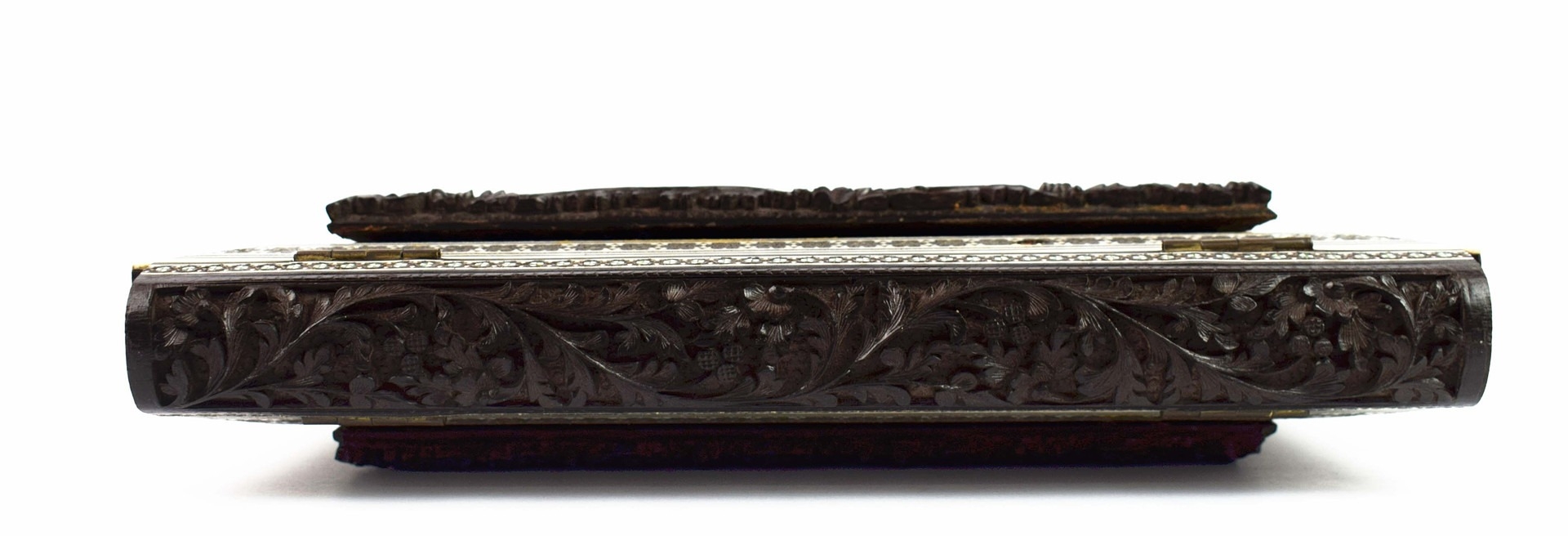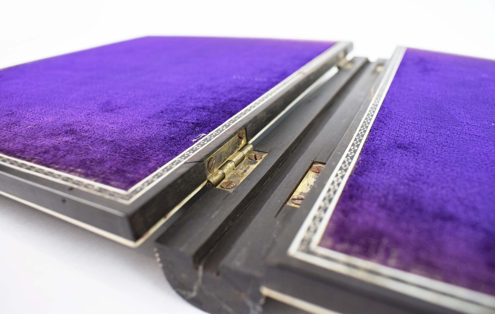 19TH CENTURY ANGLO INDIAN WRITING SLOPE. ebony and micro mosaic of book form with purple velvet lining, 24cm x 27cm, 47cm open.