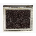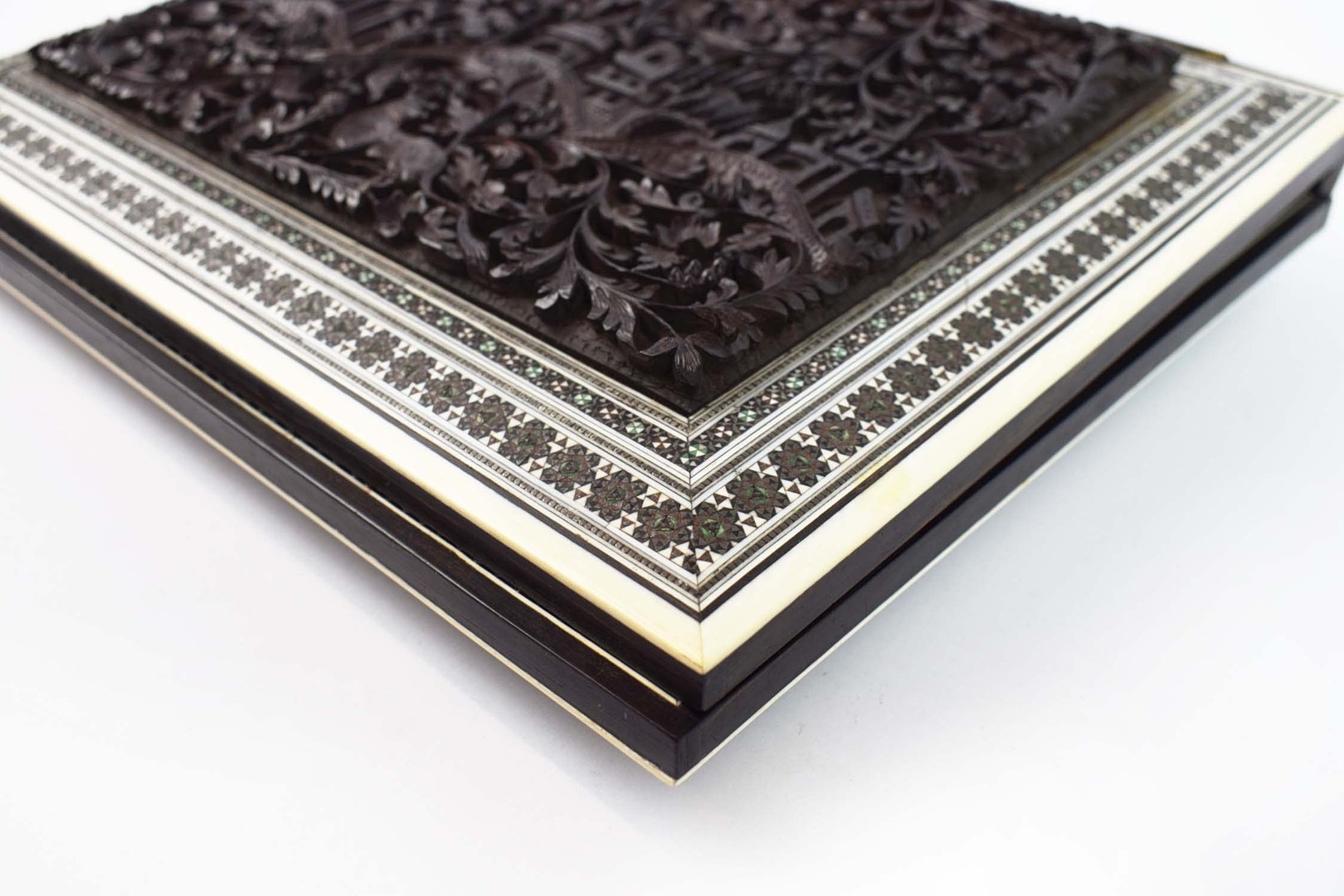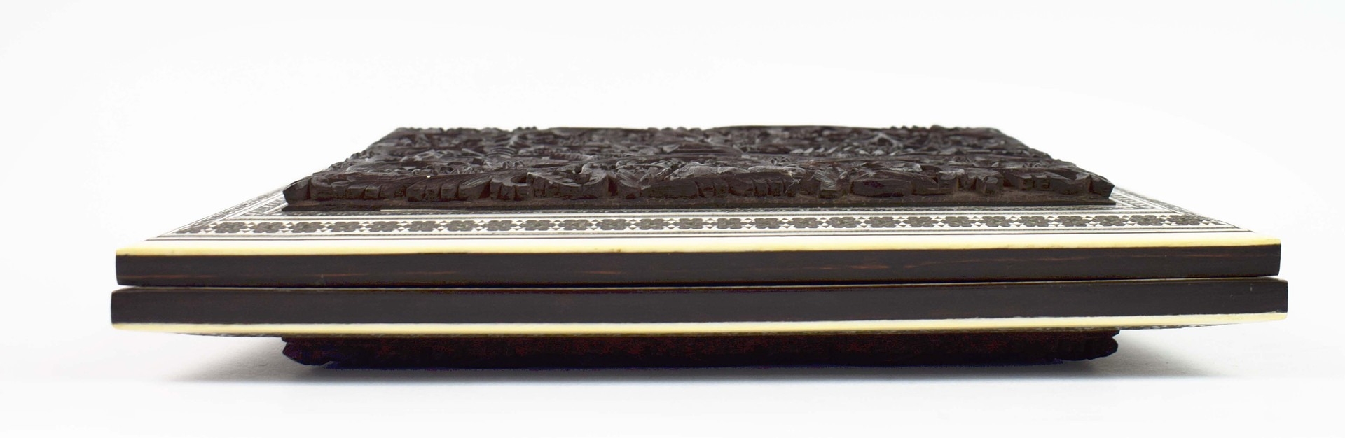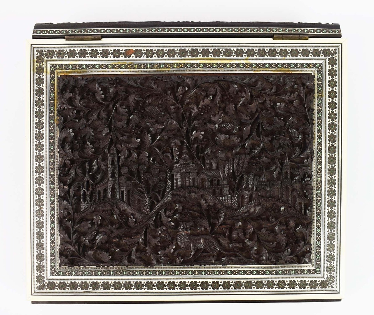 19TH CENTURY ANGLO INDIAN WRITING SLOPE. ebony and micro mosaic of book form with purple velvet lining, 24cm x 27cm, 47cm open.