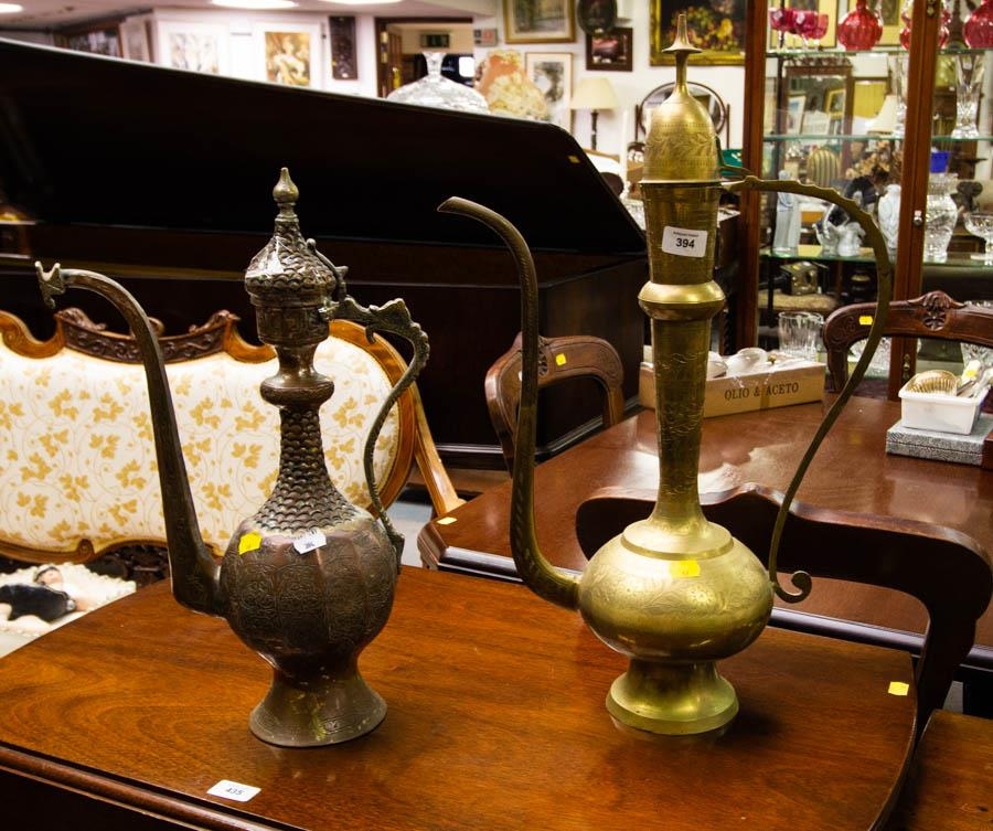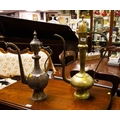 2 TALL EASTERN BRASS + COPPER TEA POTS + 2 COPPER EASTERN WA...
