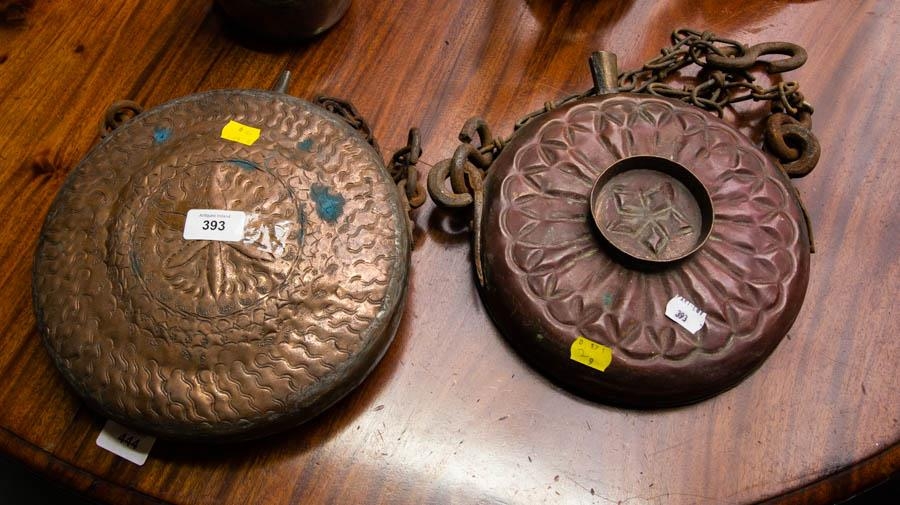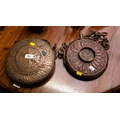 2 TALL EASTERN BRASS + COPPER TEA POTS + 2 COPPER EASTERN WATER CANTEENS