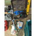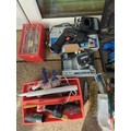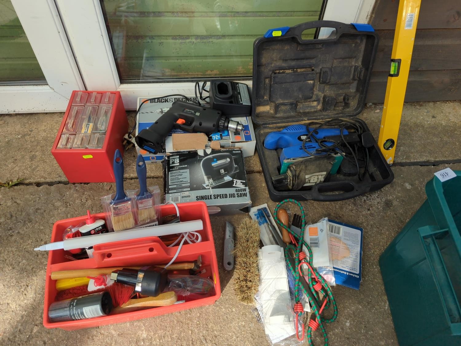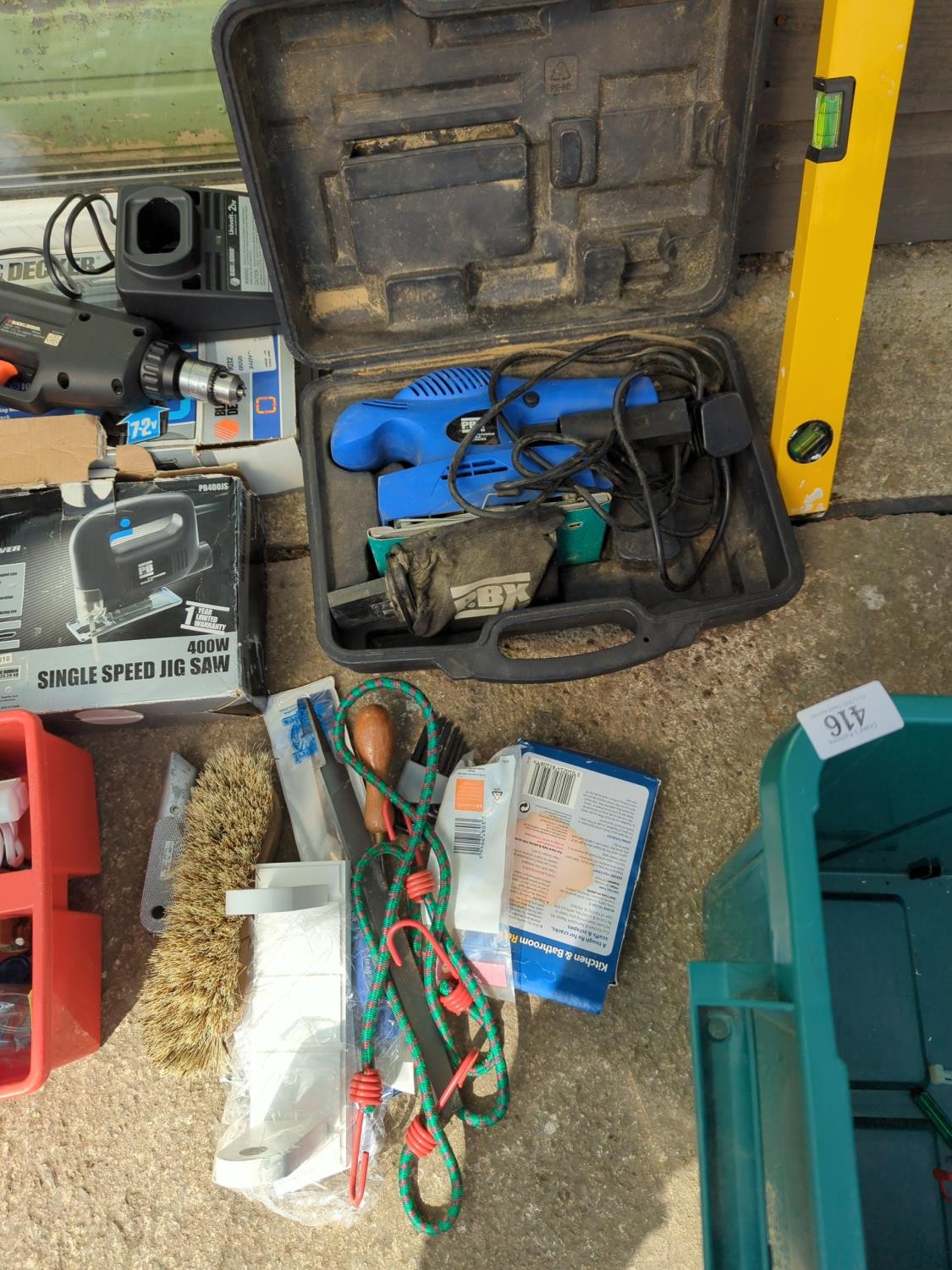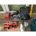 green recycling tub with tool contents, Inc Black & decker cordless hammer drill, Powerbase jigsaw, small 9 drawer unit Etc..