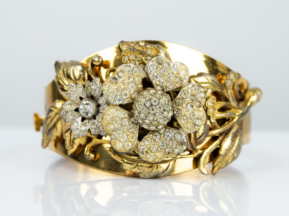 VINTAGE GOLD PLATED BROAD HINGE OPENING BANGLE, the broadening top overlaid in free relief with a large floral spray, the blossoms pave set with paste