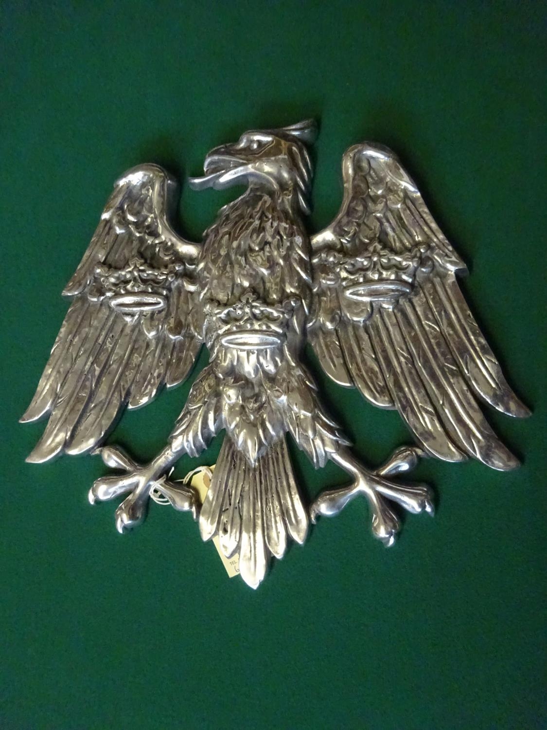 A polished cast aluminium heraldic spread eagle, with 3 crowns on its breast and wings, as used by Barclays Bank from the mid 1930’s, 13" x 12½", with 5 threaded mounting holes on the back. £40-60