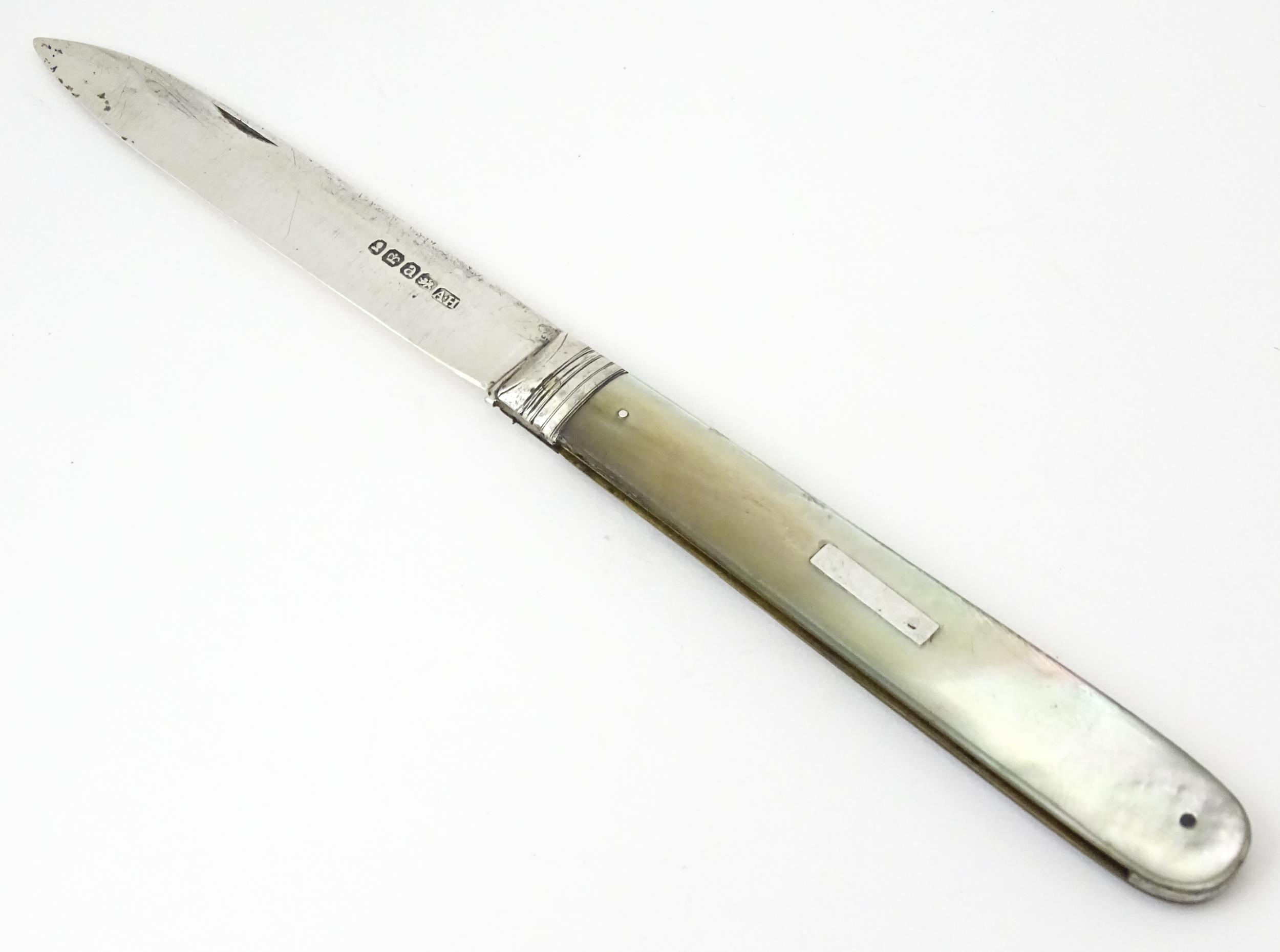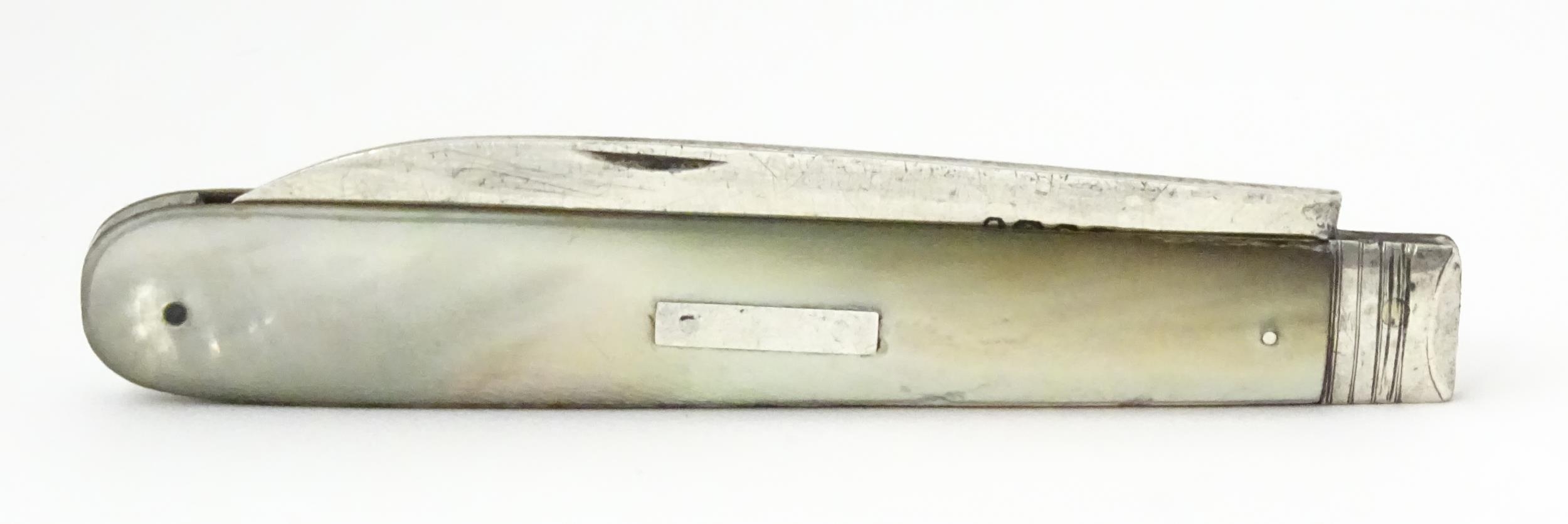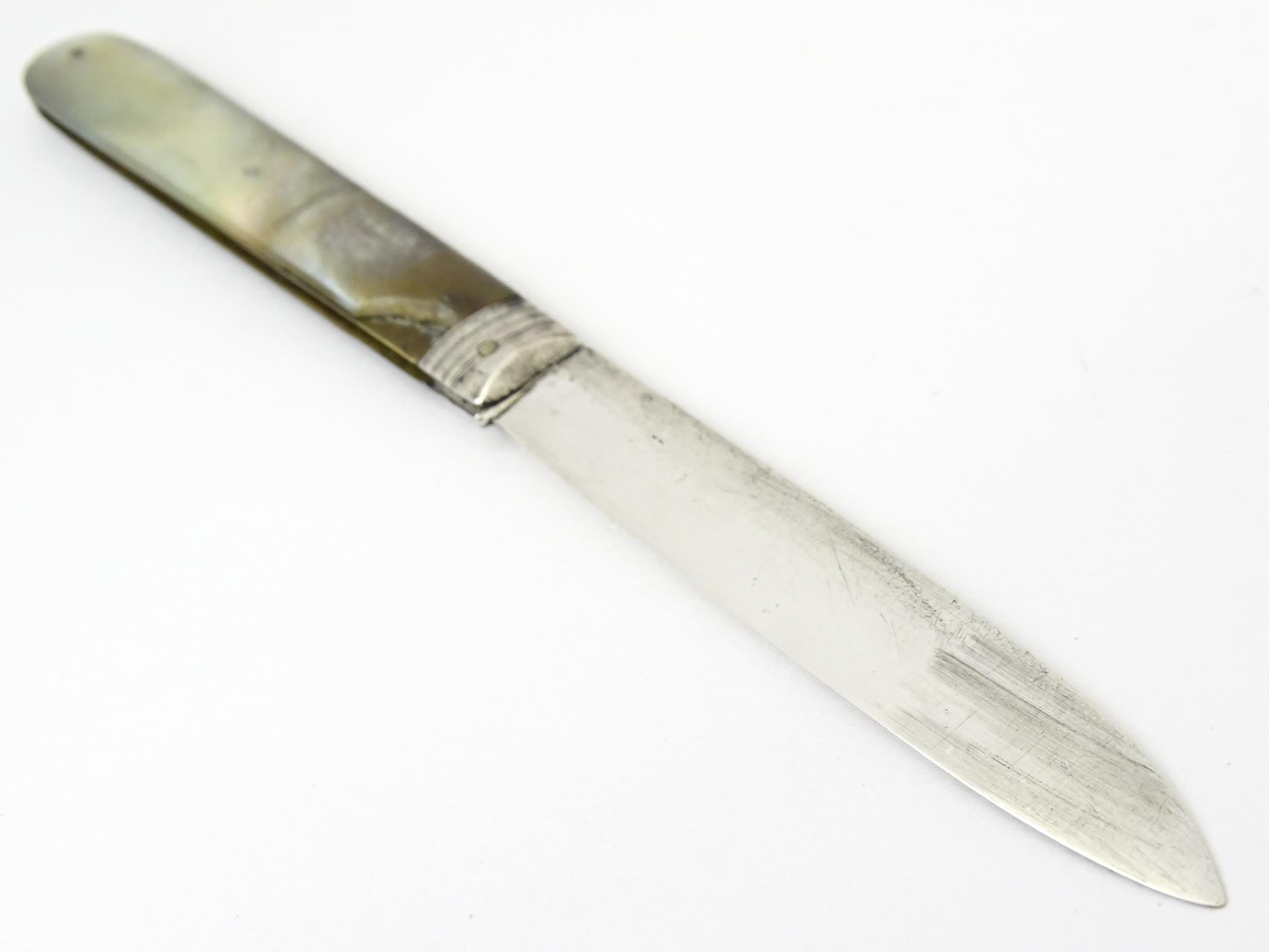 A George IV silver folding fruit knife with mother of pearl handle, hallmarked Sheffield 1824, maker Aaron Hadfield. Approx. 3 1/4" long (closed)