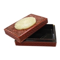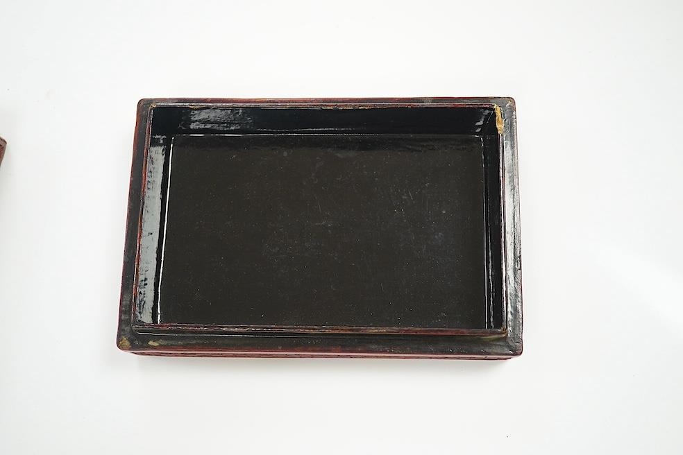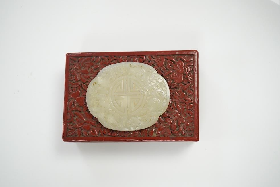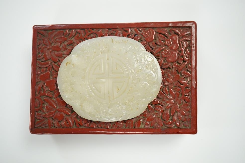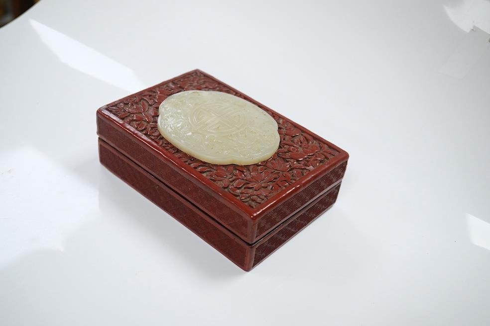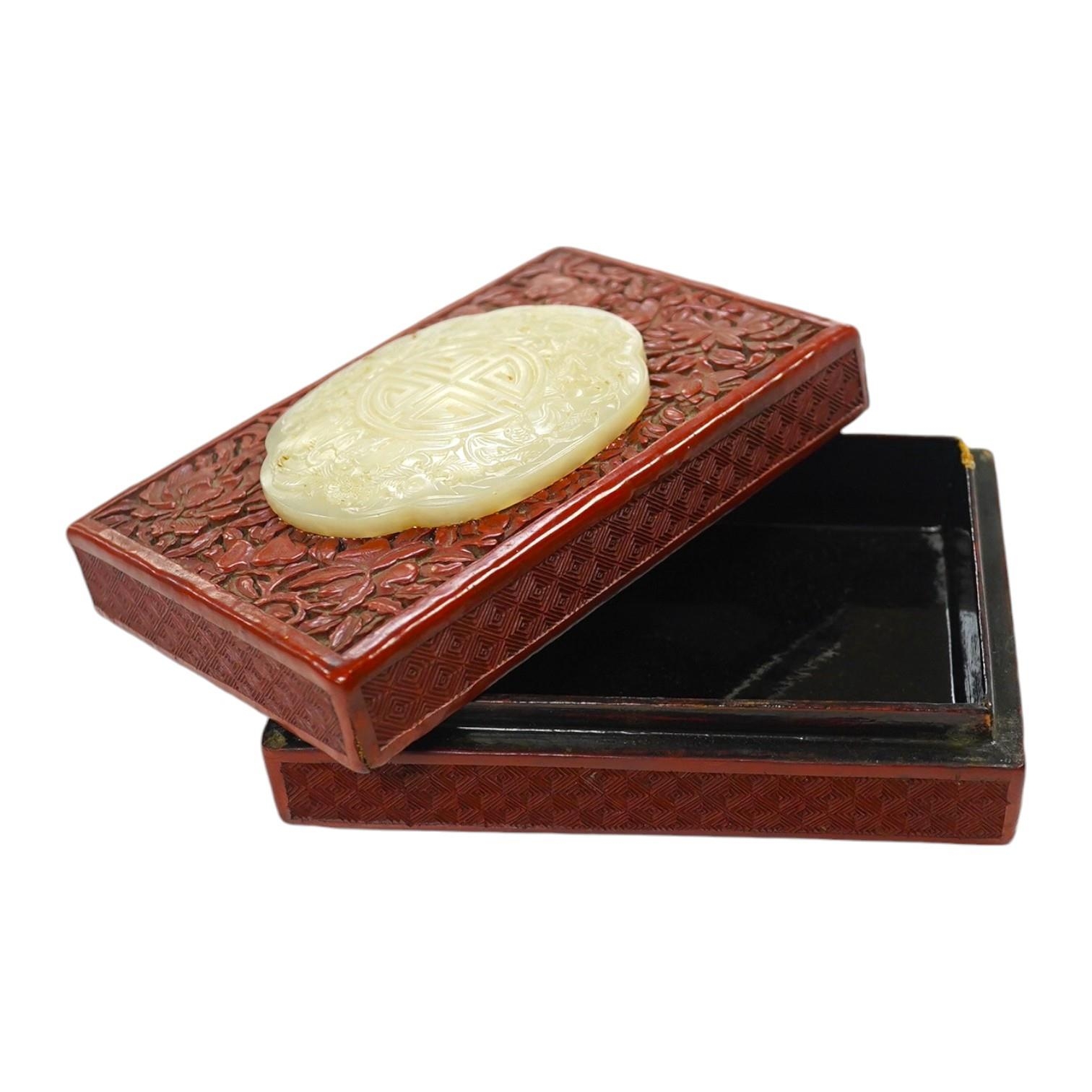 A Chinese carved jade mounted cinnabar lacquer box, 19th / 20th century, 14cm wide. Condition - fair, commensurate with age