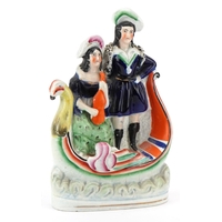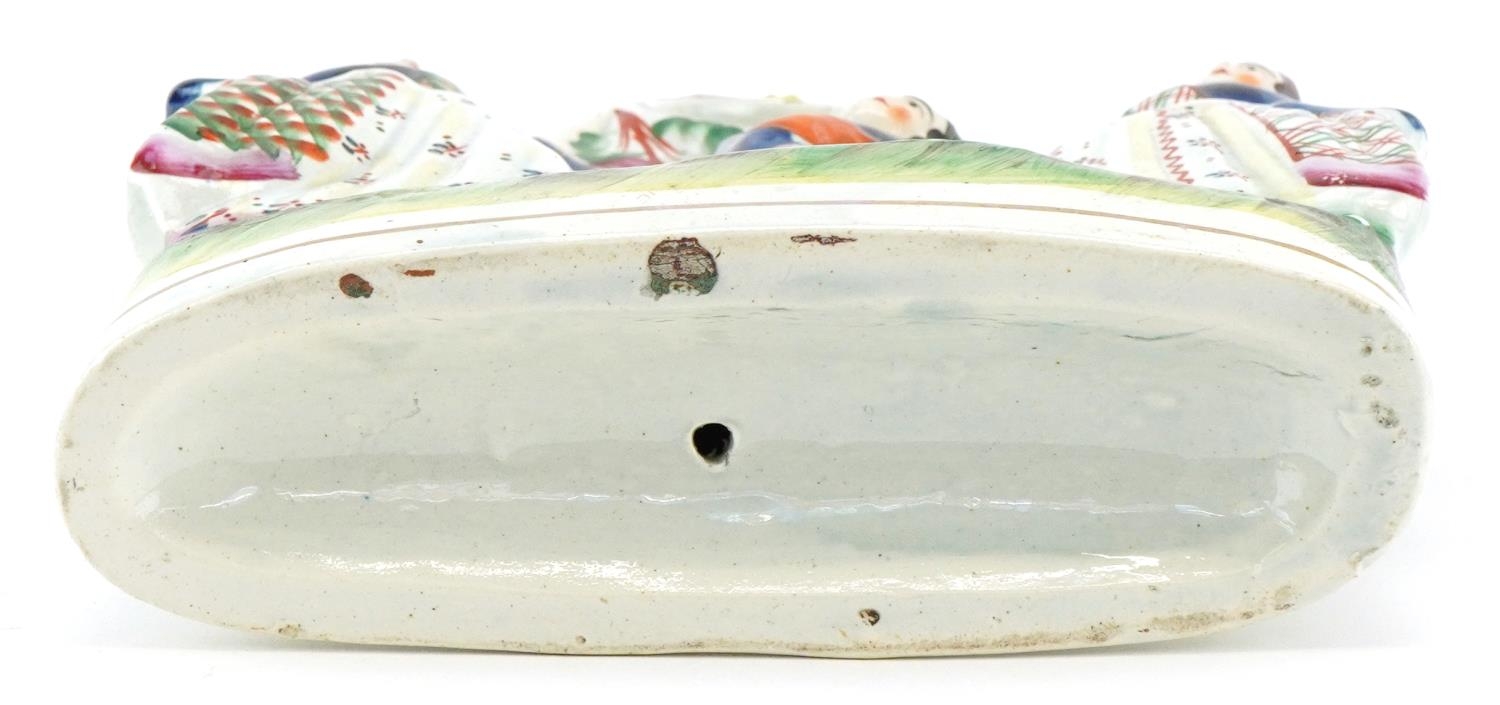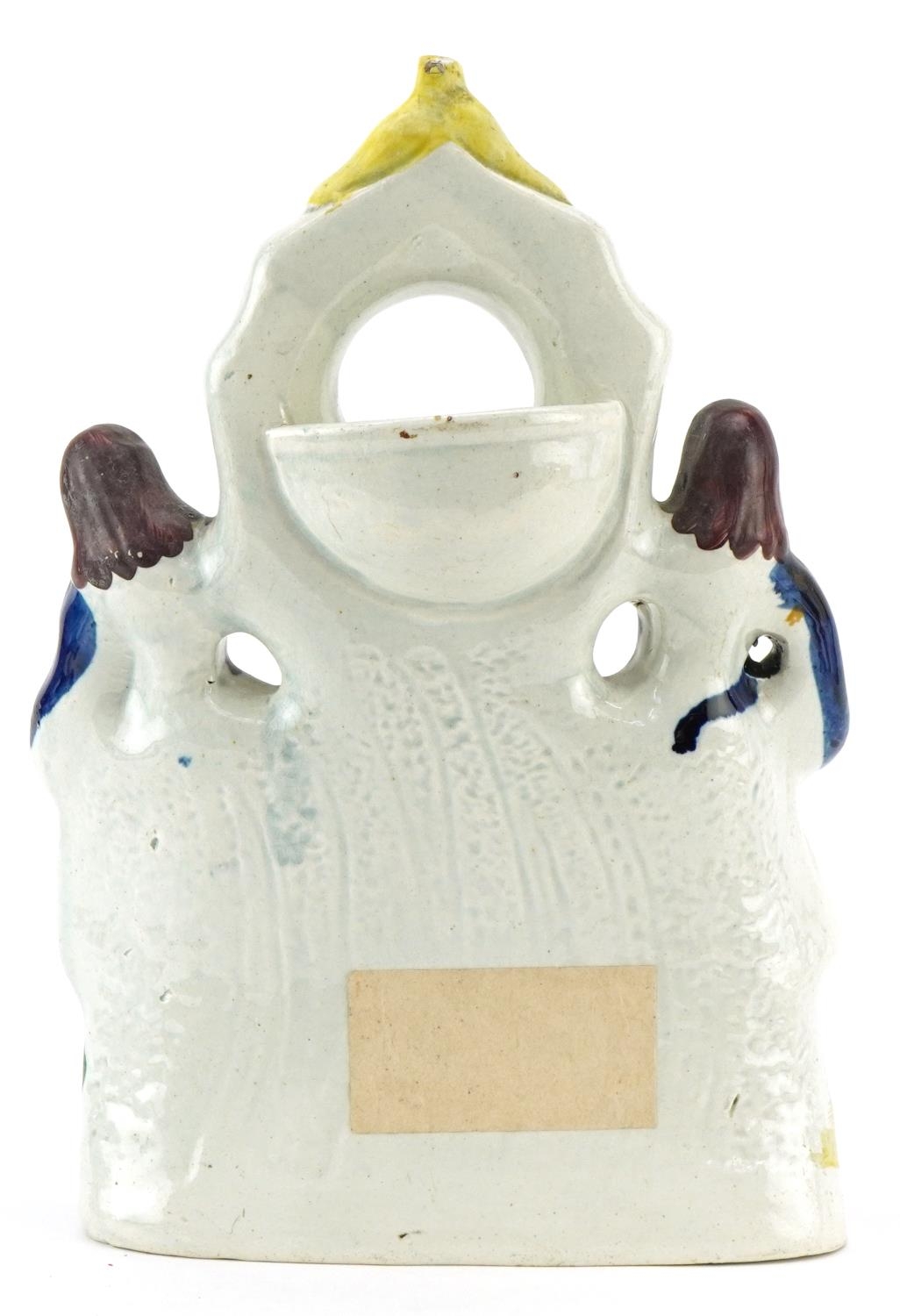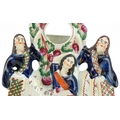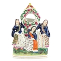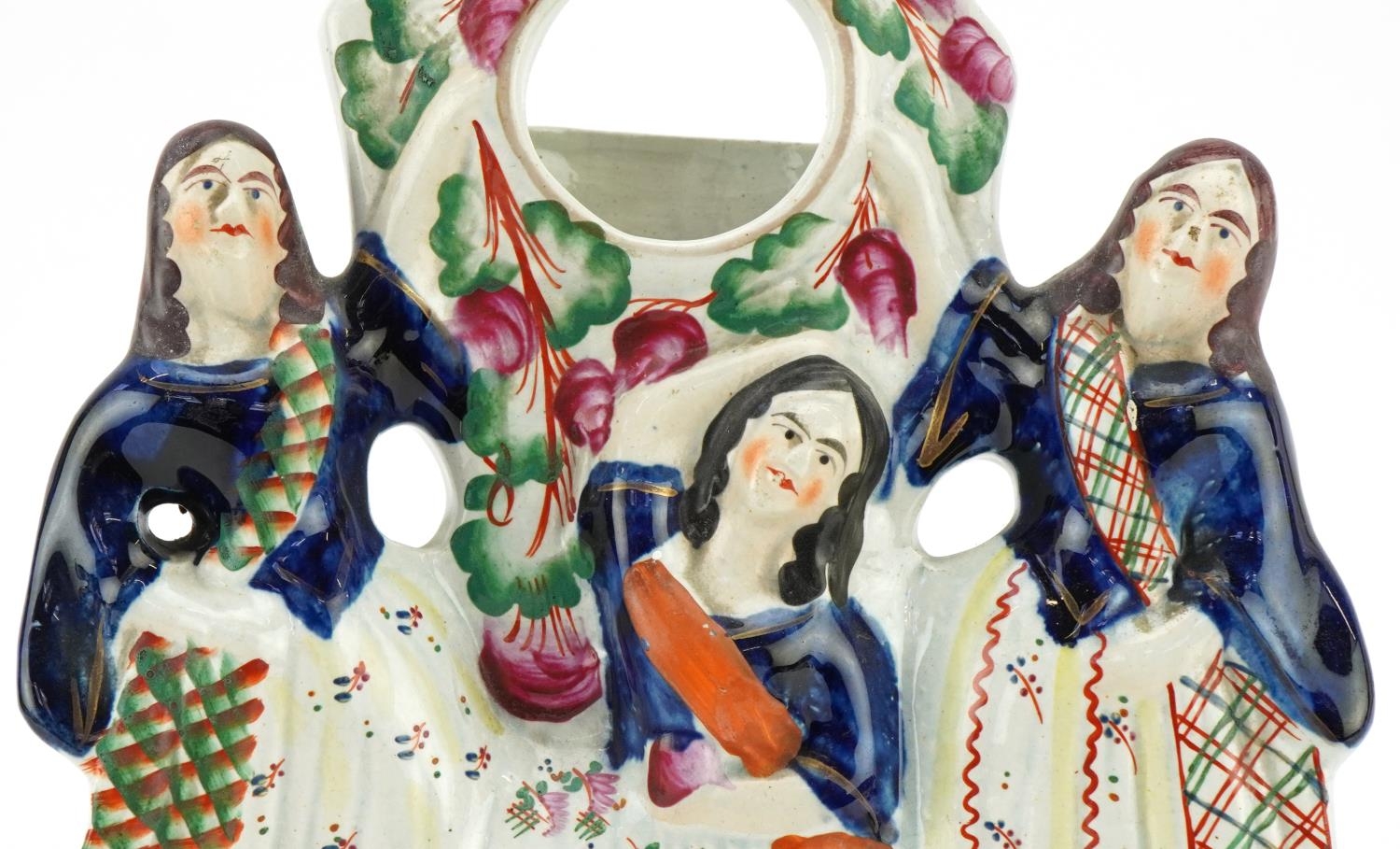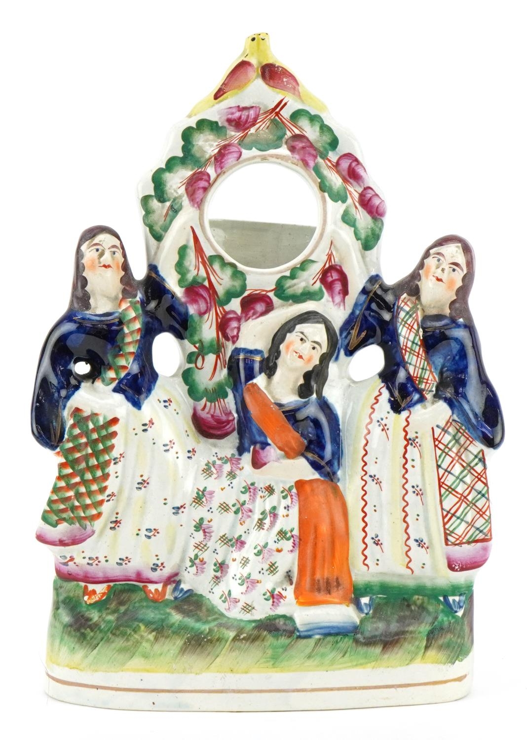 A Victorian Staffordshire pottery pocket watch stand in the form of three females, 27cm high.