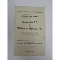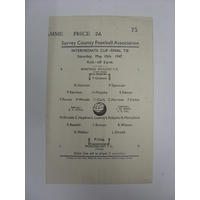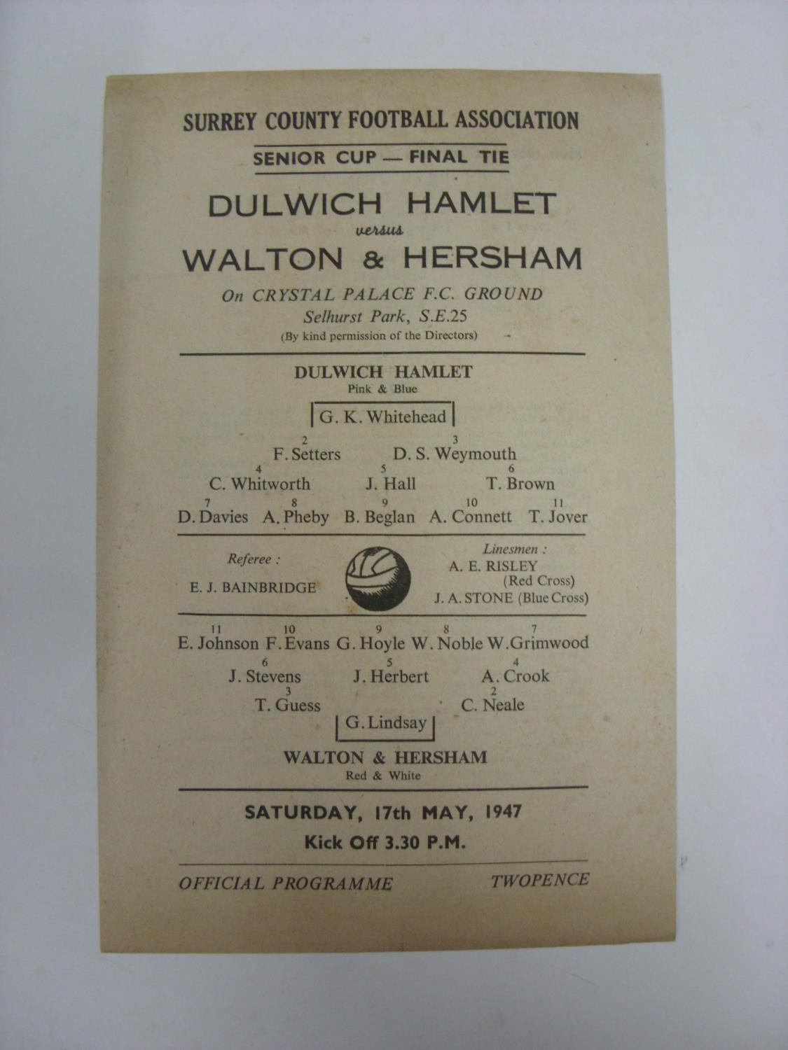 AT CRYSTAL PALACE, 1947, a football programme from the Surrey Senior Cup Final, Dulwich Hamlet versus Walton And Hersham, played on 17/05/1947 (single sheet, slight mark on back). Estimate: £20/£30 - Opening Bid: £18