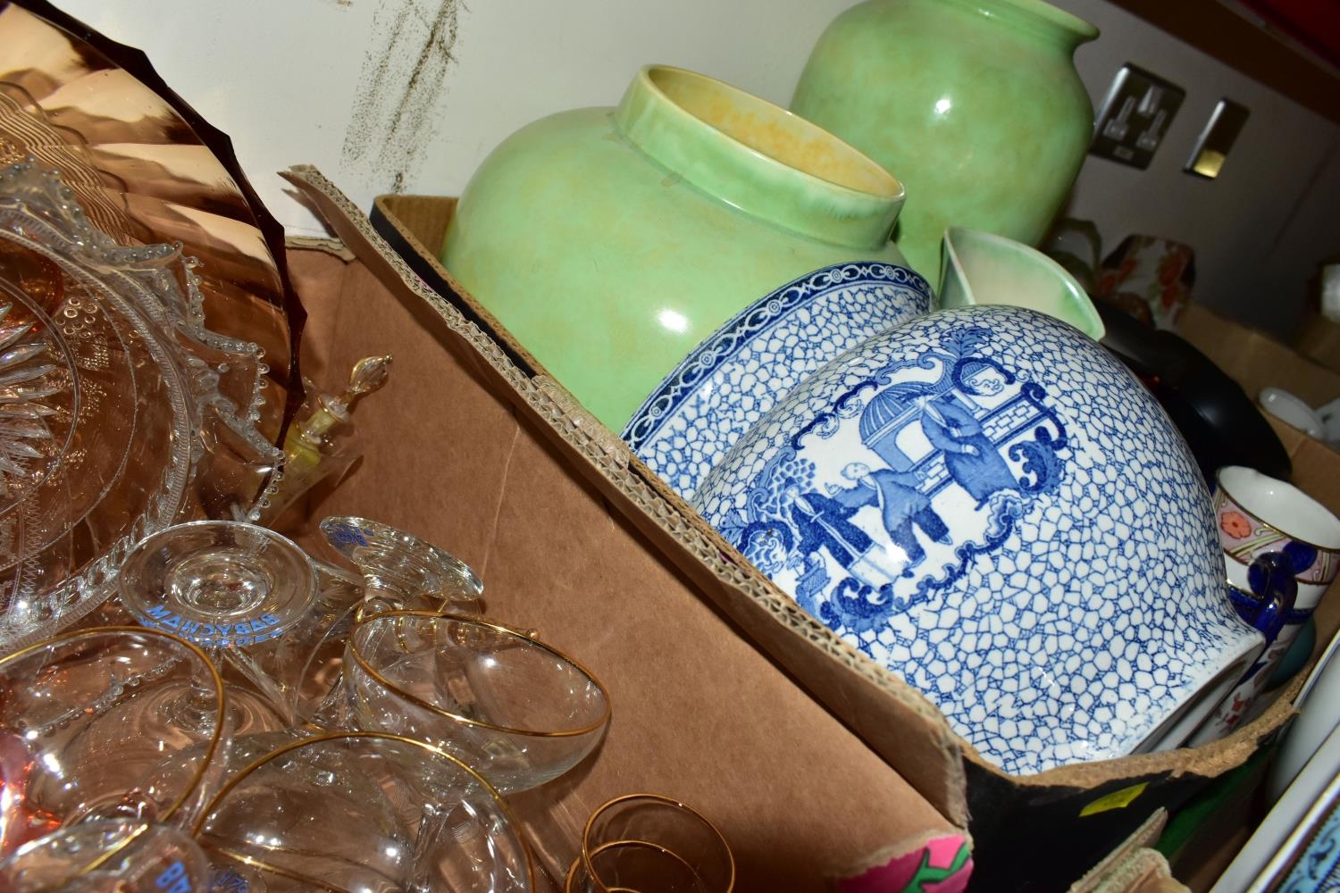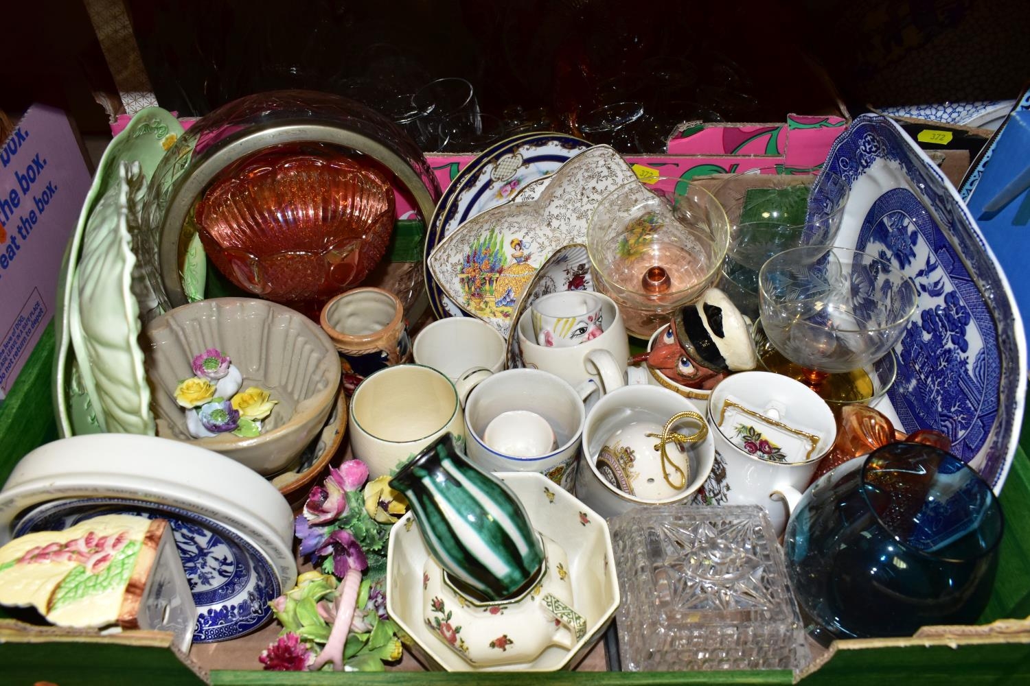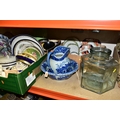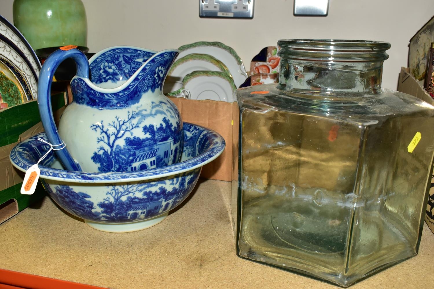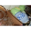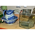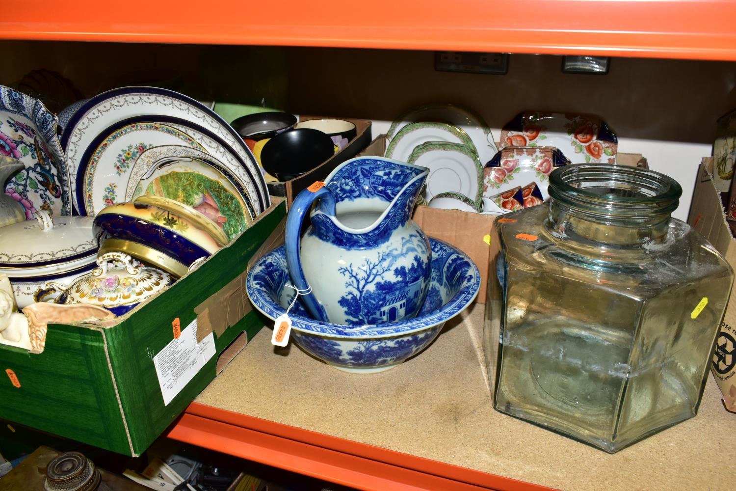 FIVE BOXES AND LOOSE CERAMICS AND GLASS WARES, to include a large hexagonal glass jar/terrarium? height 27cm x base corner to corner 27cm, a Victoria Ironstone wash jug and bowl, two Alfred Meakin Bleu de Roi tureens and two meat plates, a Sylvac 2103 Chrysanthemum jug, a Carlton Ware Foxglove toast rack, marigold carnival glass comports and jug, etc (5 boxes + loose) (sd)