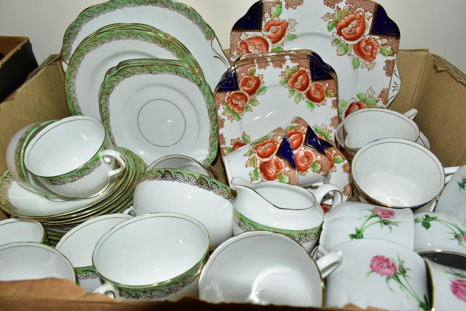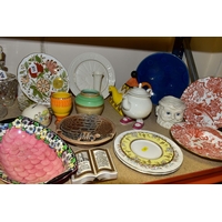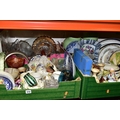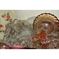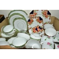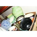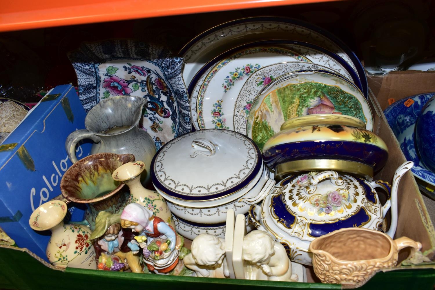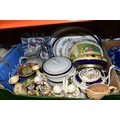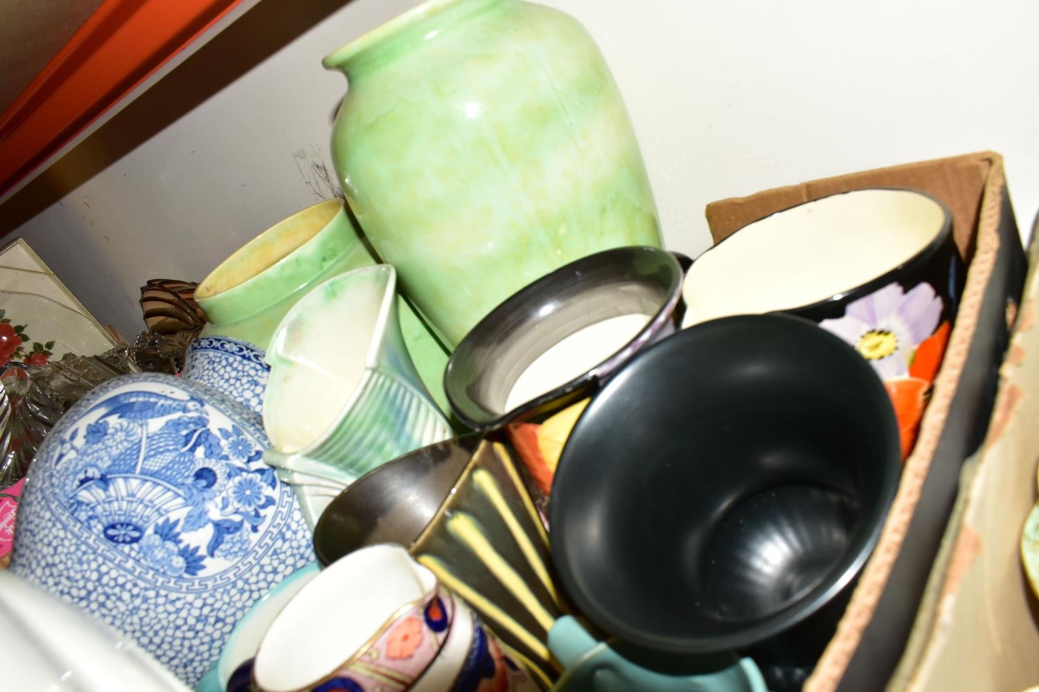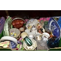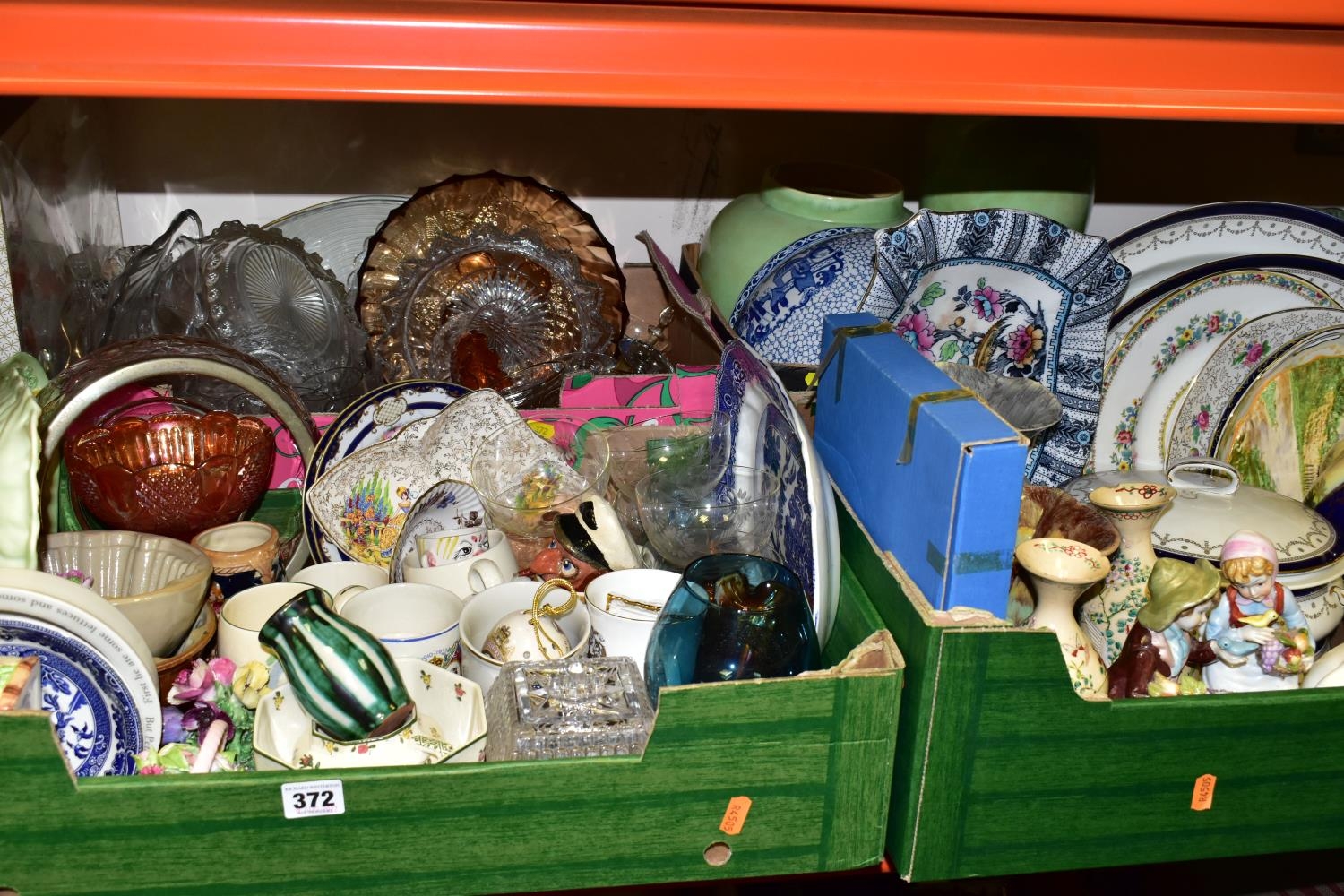 FIVE BOXES AND LOOSE CERAMICS AND GLASS WARES, to include a large hexagonal glass jar/terrarium? height 27cm x base corner to corner 27cm, a Victoria Ironstone wash jug and bowl, two Alfred Meakin Bleu de Roi tureens and two meat plates, a Sylvac 2103 Chrysanthemum jug, a Carlton Ware Foxglove toast rack, marigold carnival glass comports and jug, etc (5 boxes + loose) (sd)