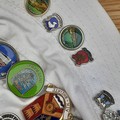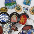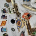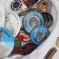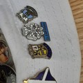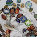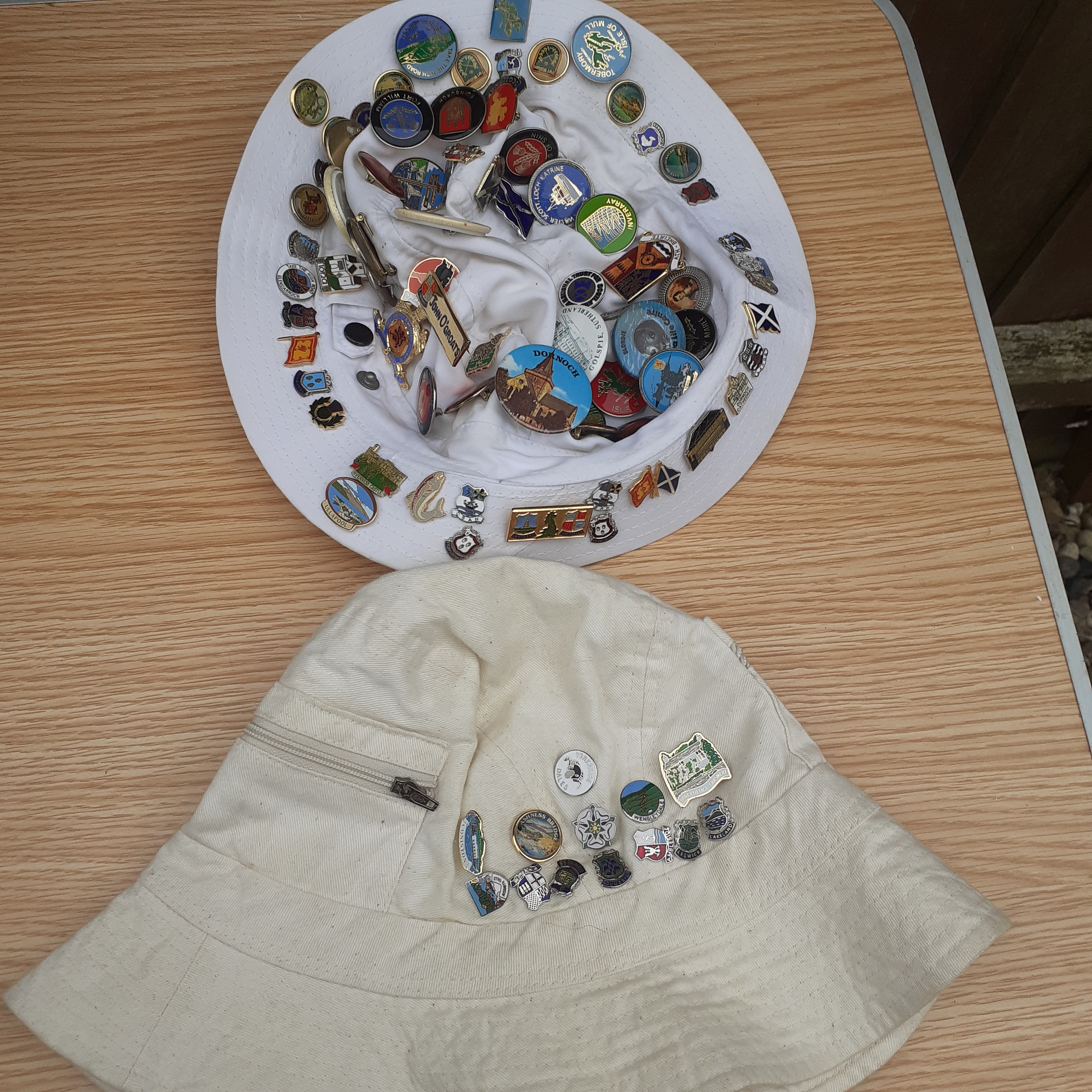 2 hats with one and a bit covered in various collections pin badges. Lots travel related in overall nice condition