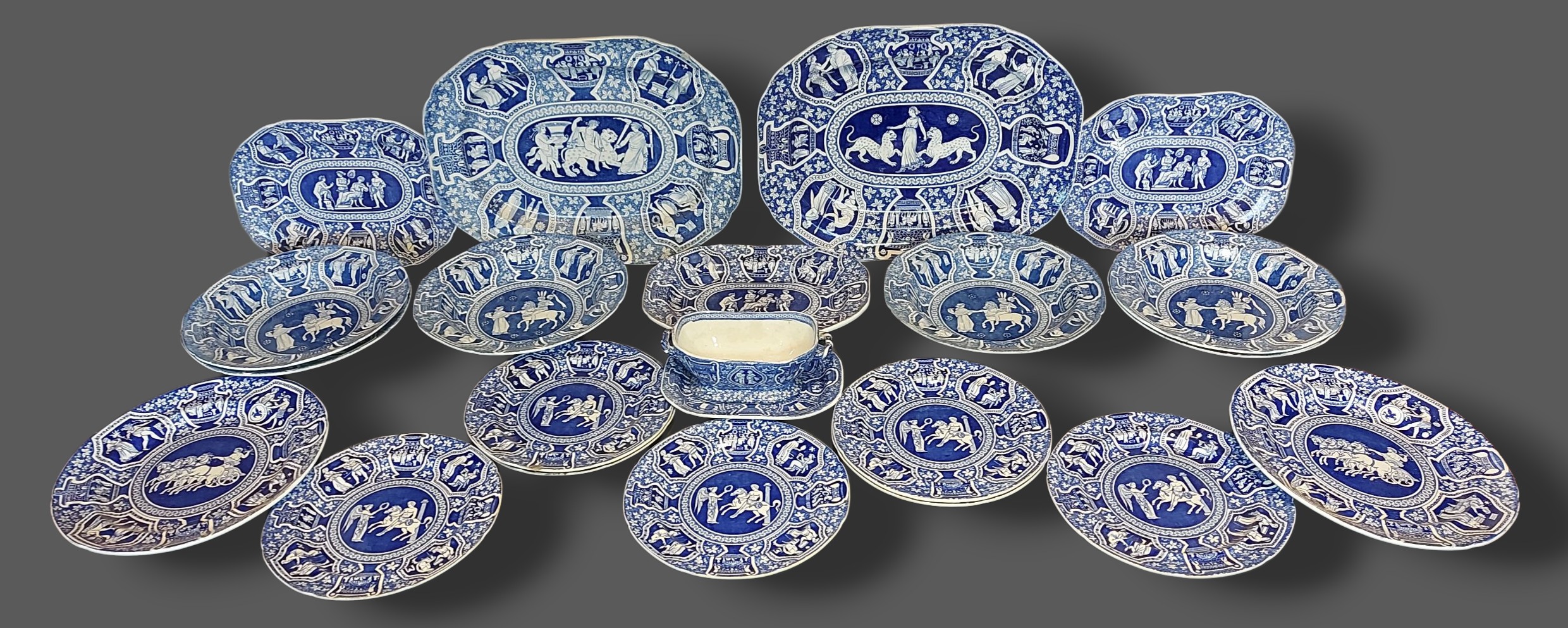 An early 19th Century Spode Greek Pattern service comprising five platters, nine plates, six bowls and a Tureen