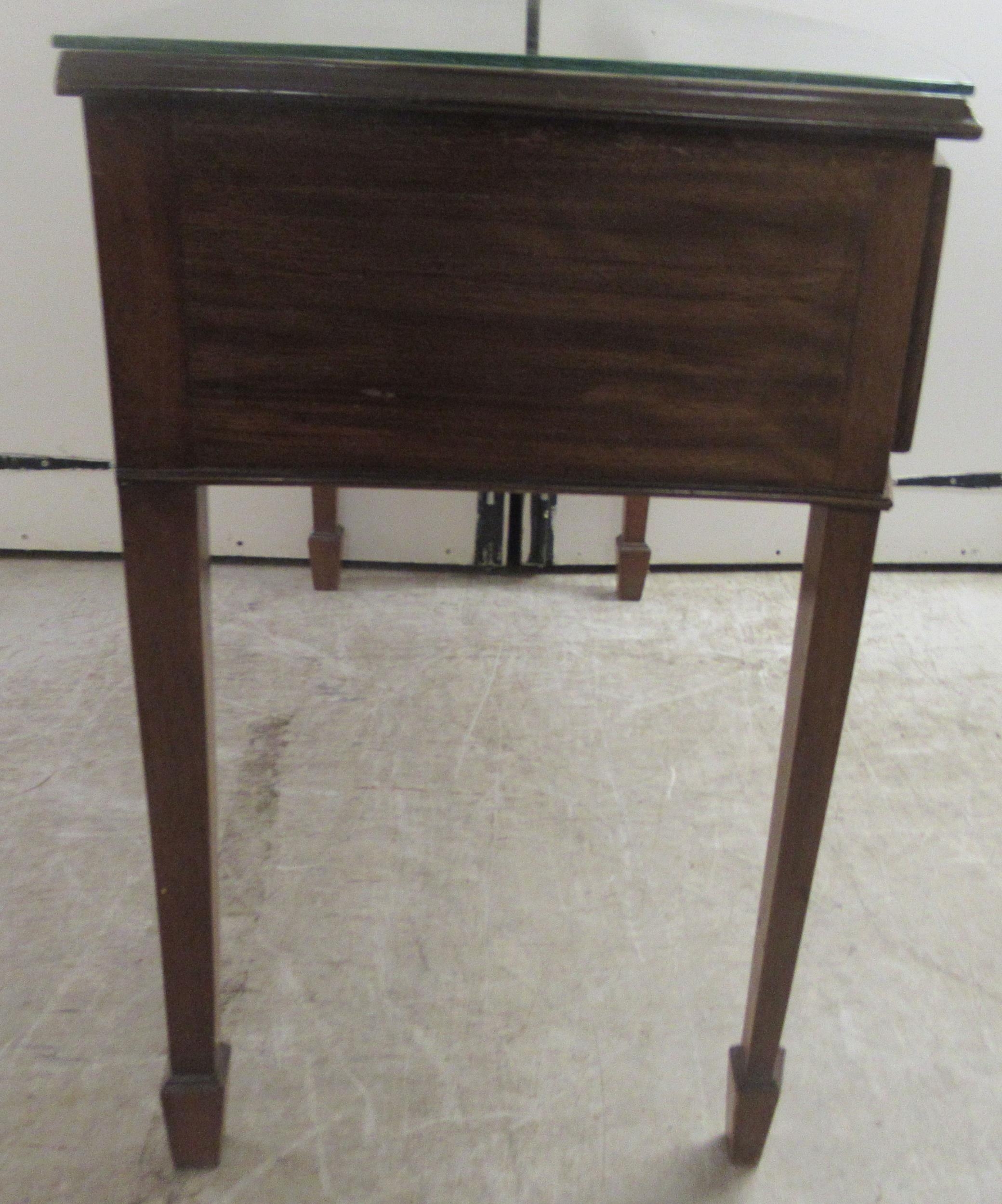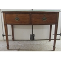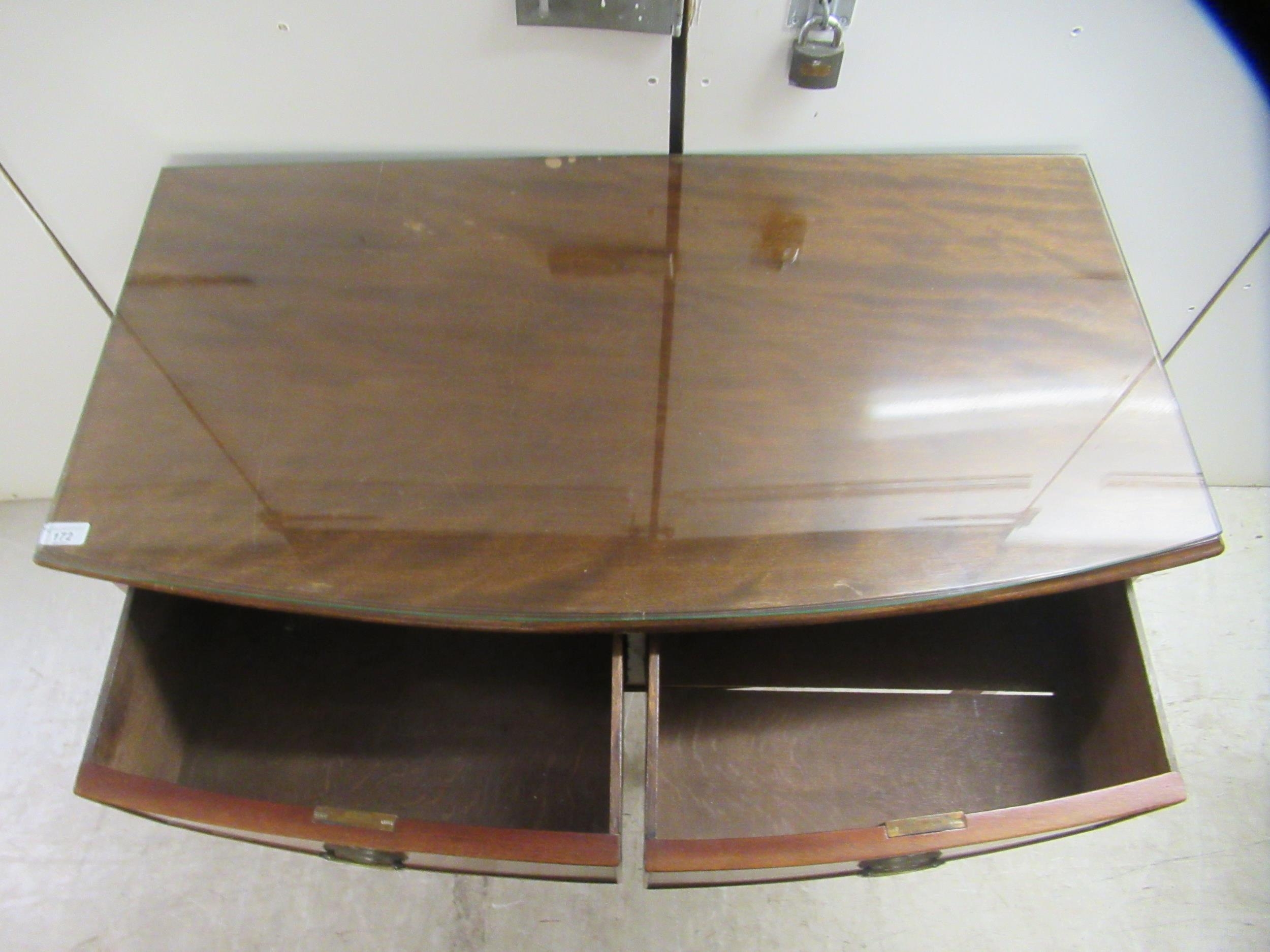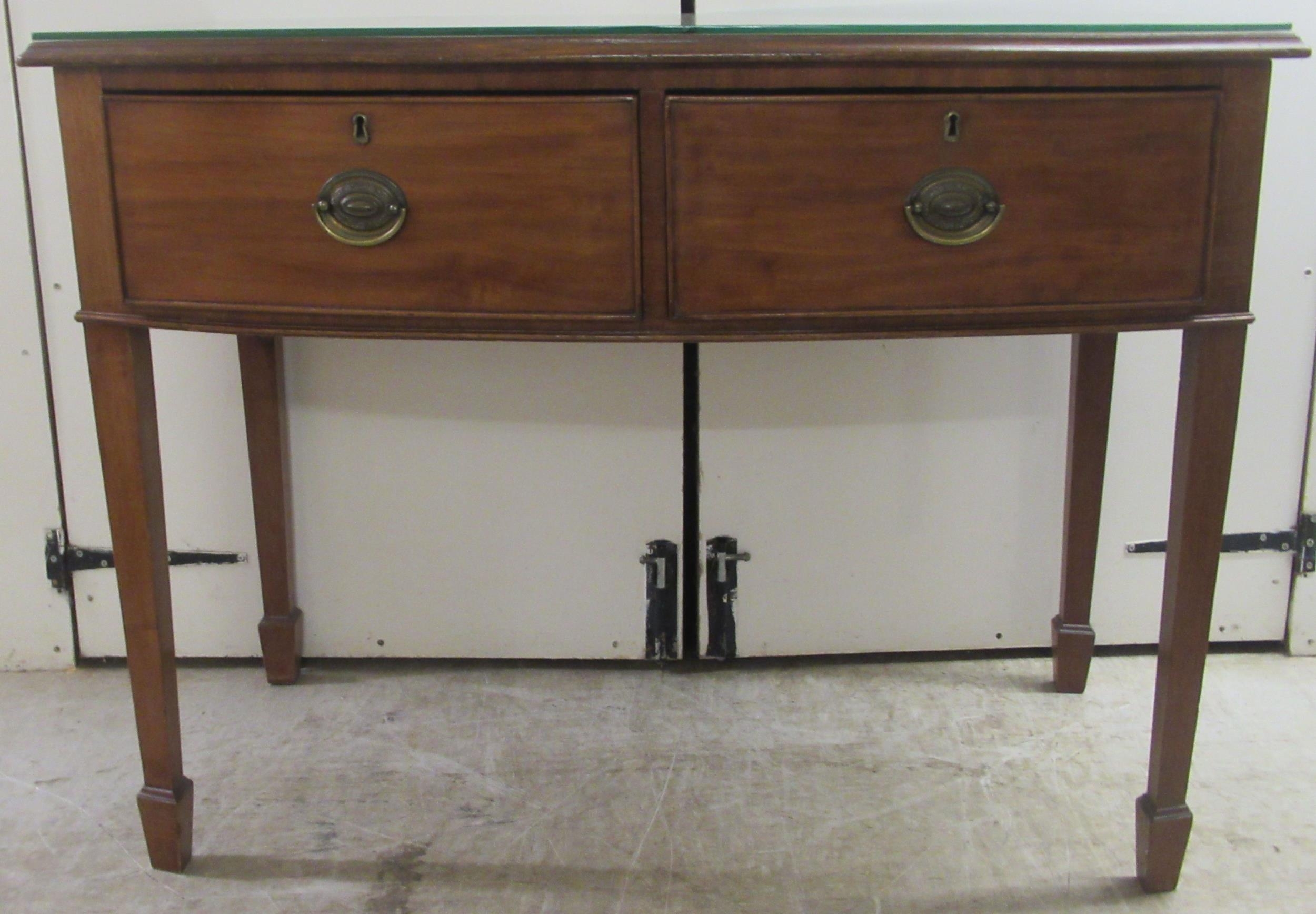 An early 20thC mahogany bow front, two drawer sideboard, raised on square, tapered legs and spade feet 30"h 42"w