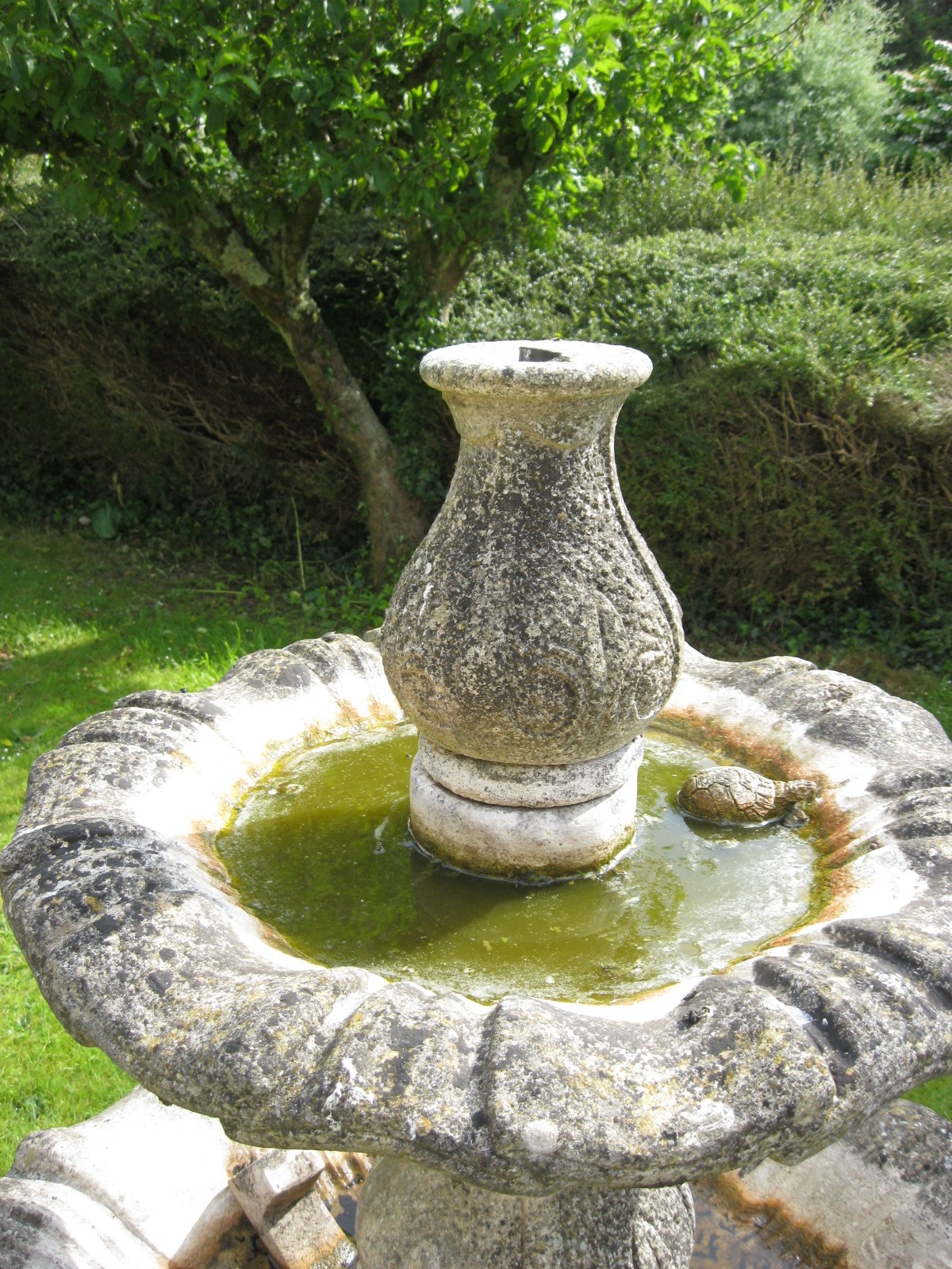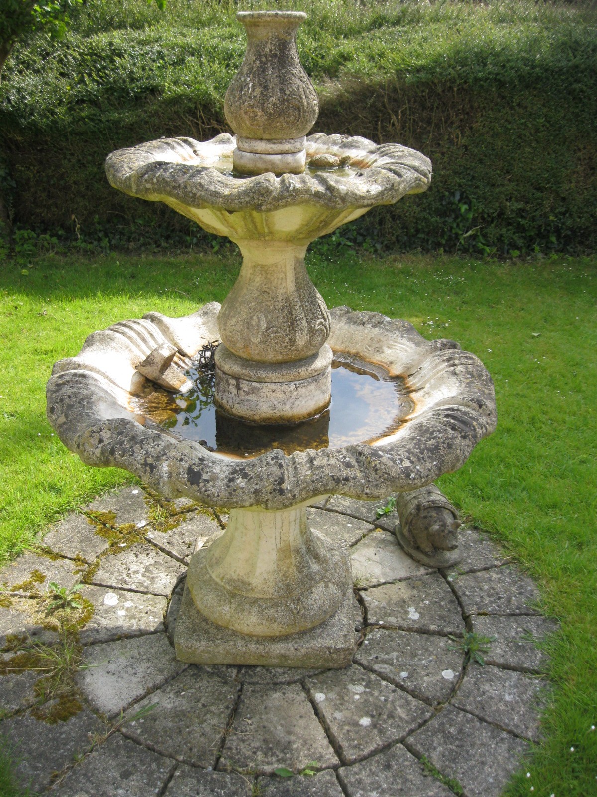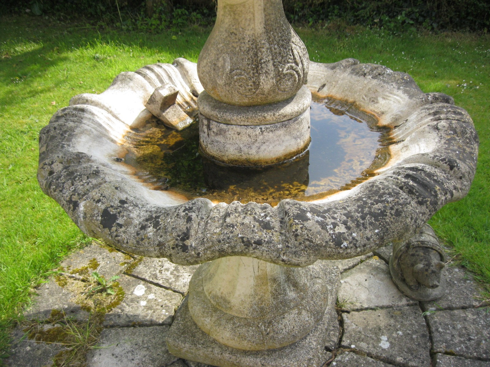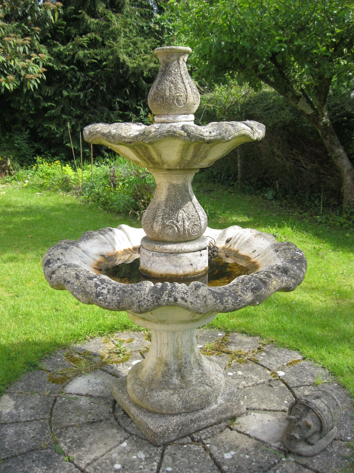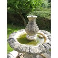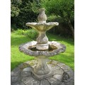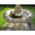 Two-tier stoneware garden fountain, baluster base, support and top with stylized foliage carving in low relief, the bowls with wavy rims, standing on a square plinth. (This lot is sold in situ) approx 6' tall, nicely weathered