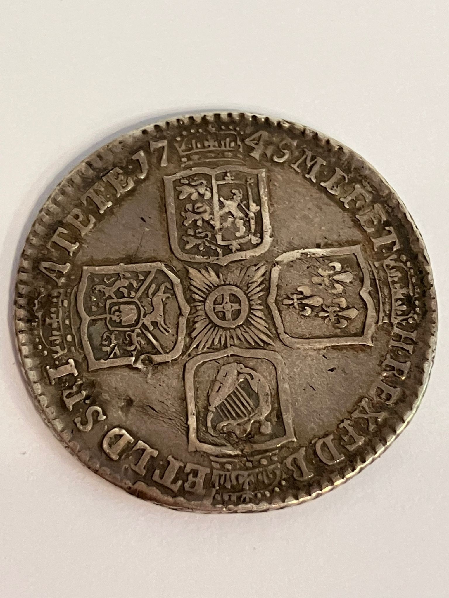 1745 SILVER GEORGE II LIMA SHILLING coin. Very fine condition. Slight indentation otherwise would have been EF. Excellent detail and definition. Nice early milled edge. Please see pictures.