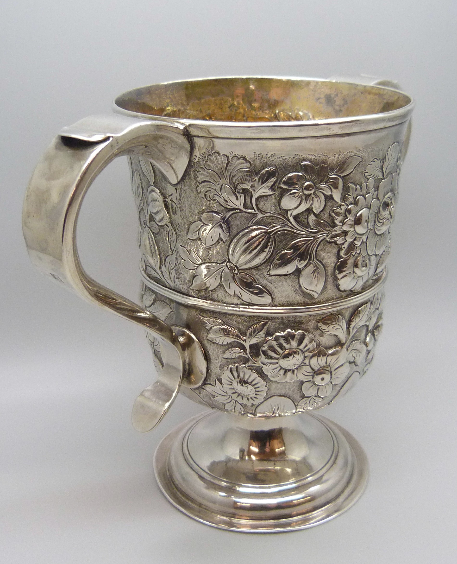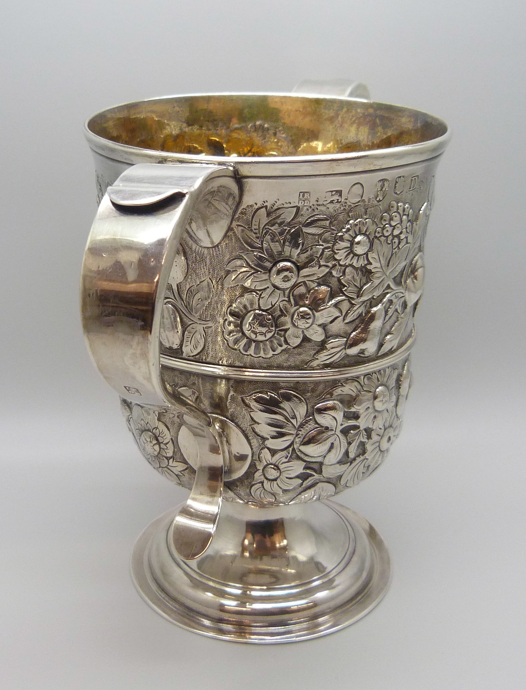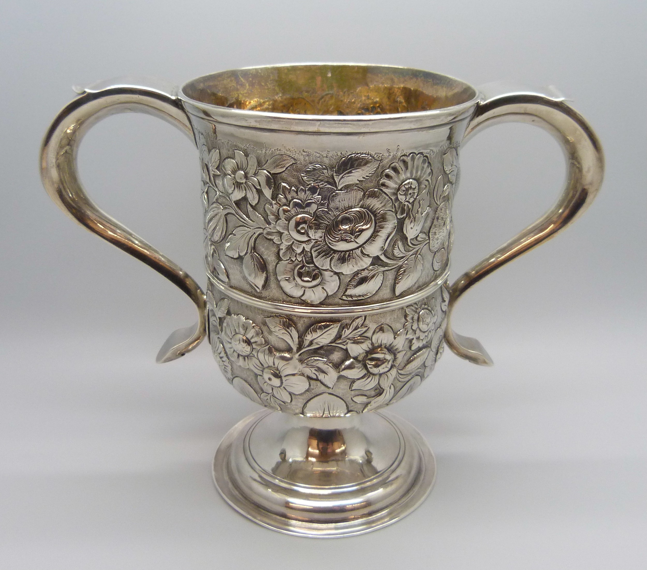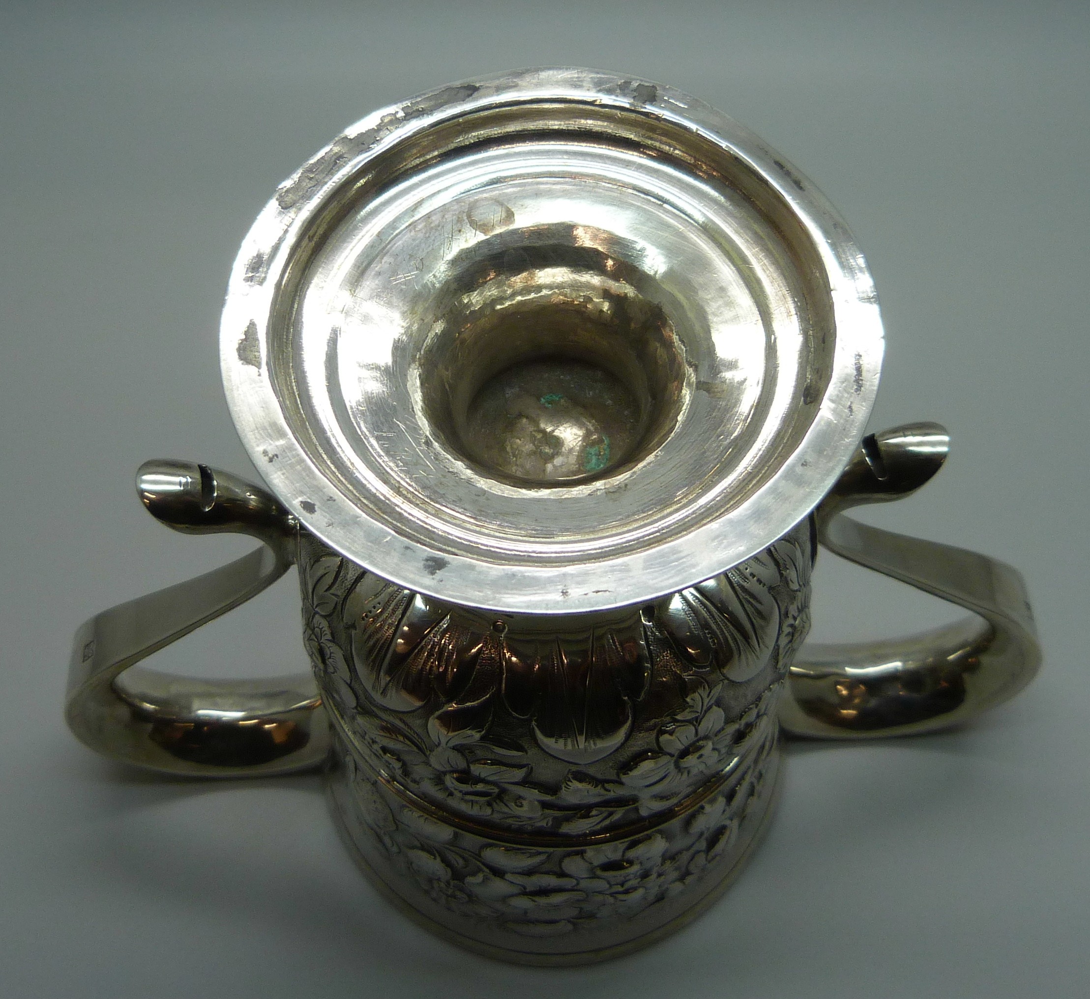 A George III silver two handled loving cup with embossed floral decoration, J Robertson & D Darling, Newcastle, 1794, 343g, 14.2cm tall