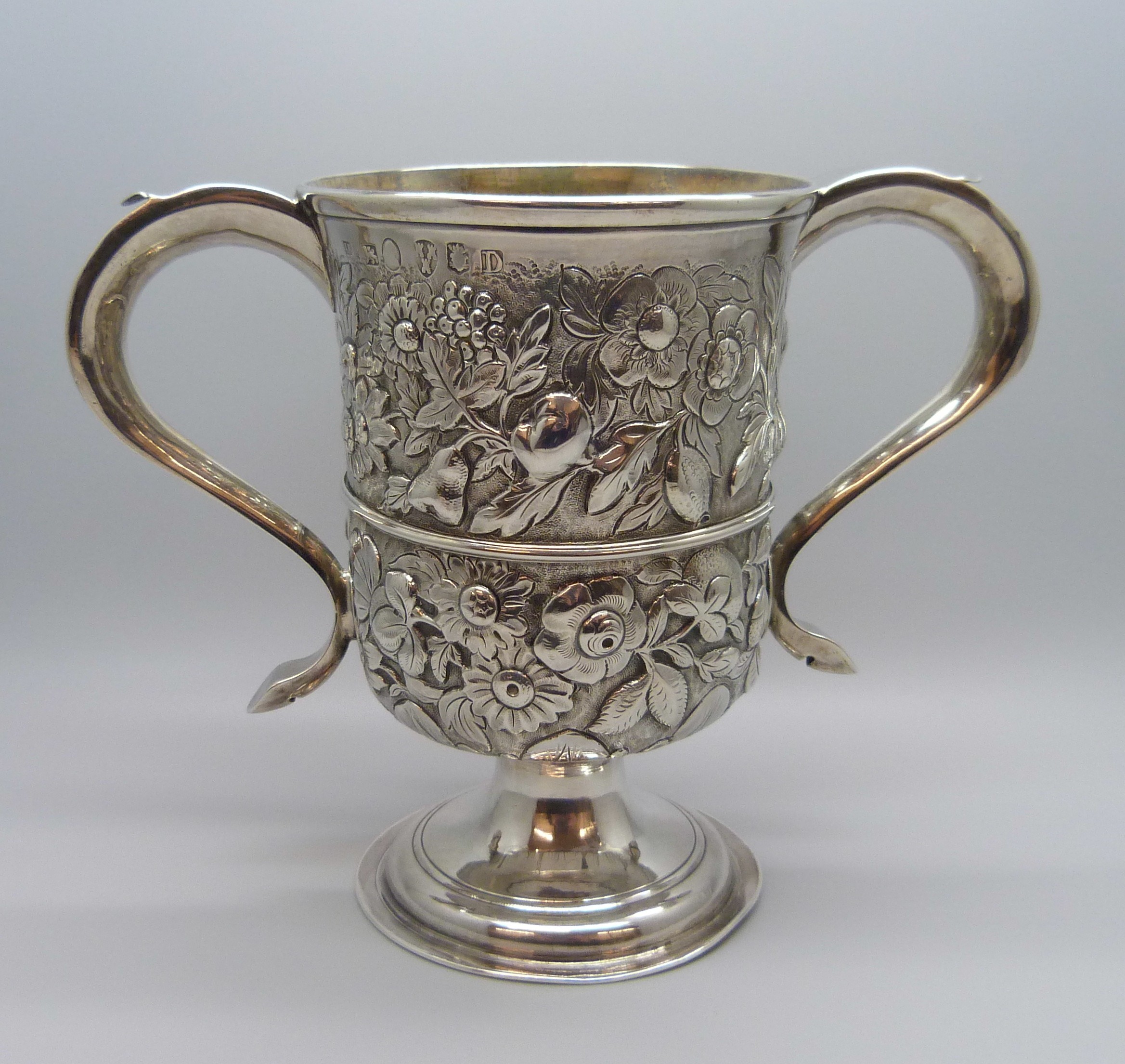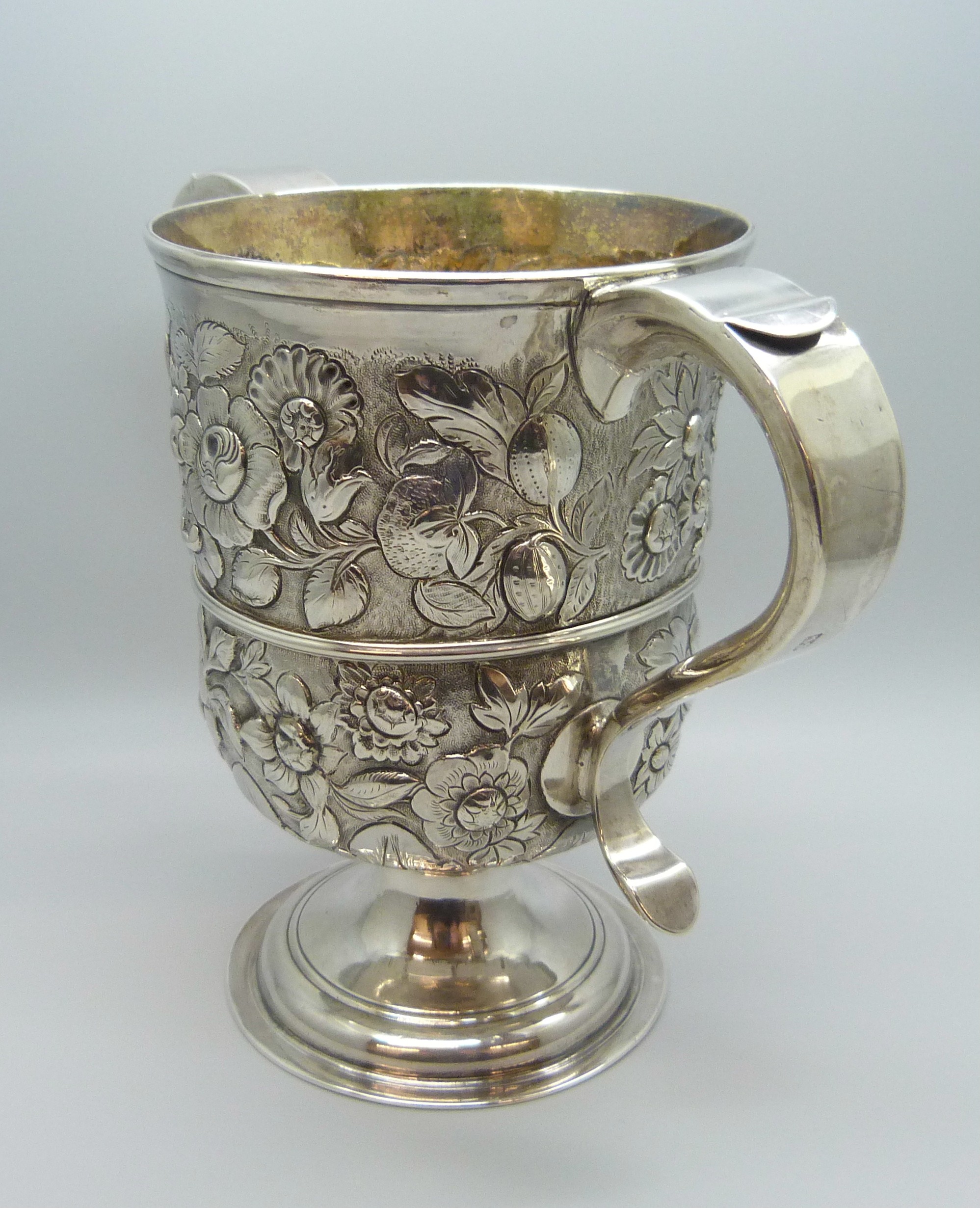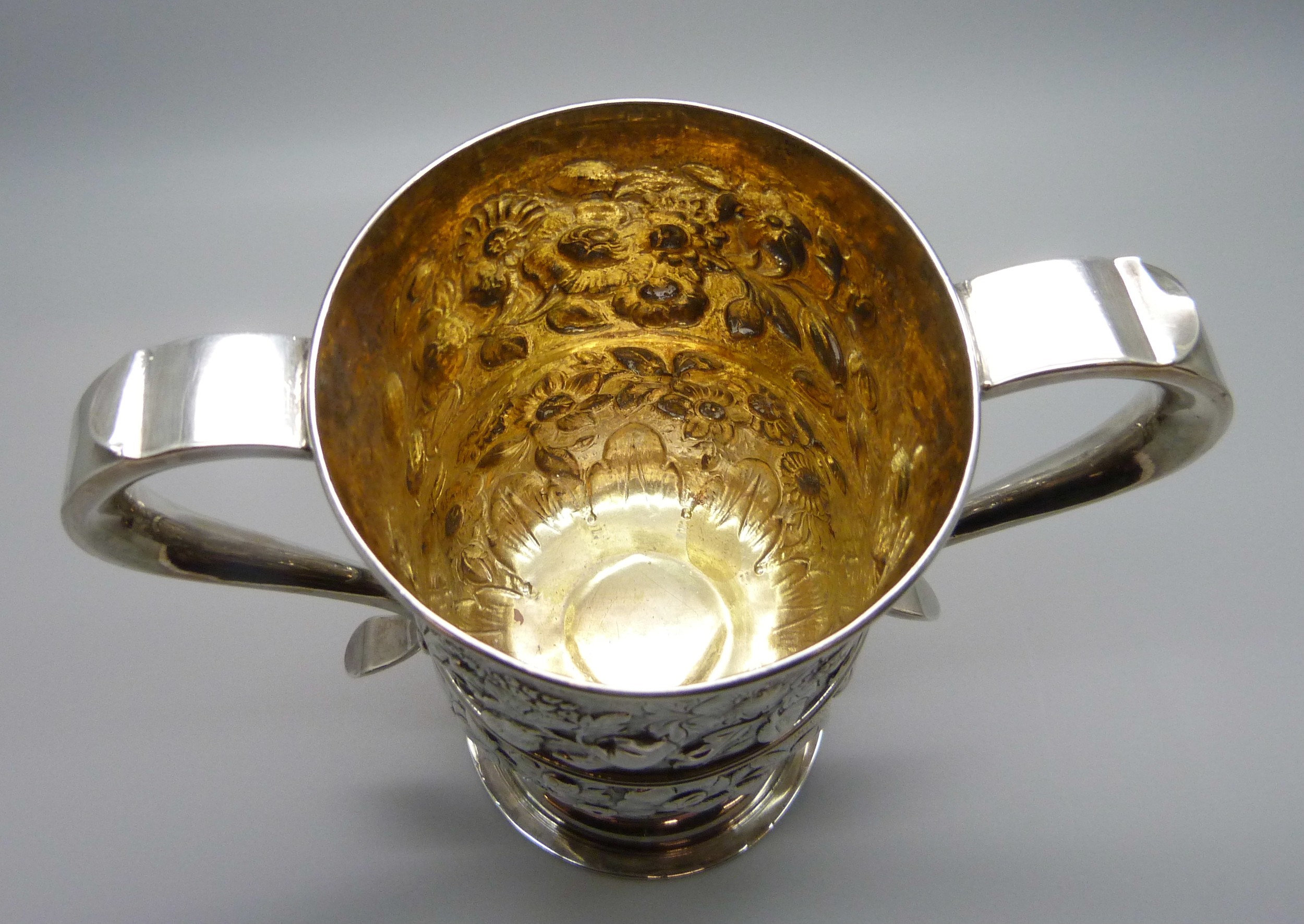 A George III silver two handled loving cup with embossed floral decoration, J Robertson & D Darling, Newcastle, 1794, 343g, 14.2cm tall
