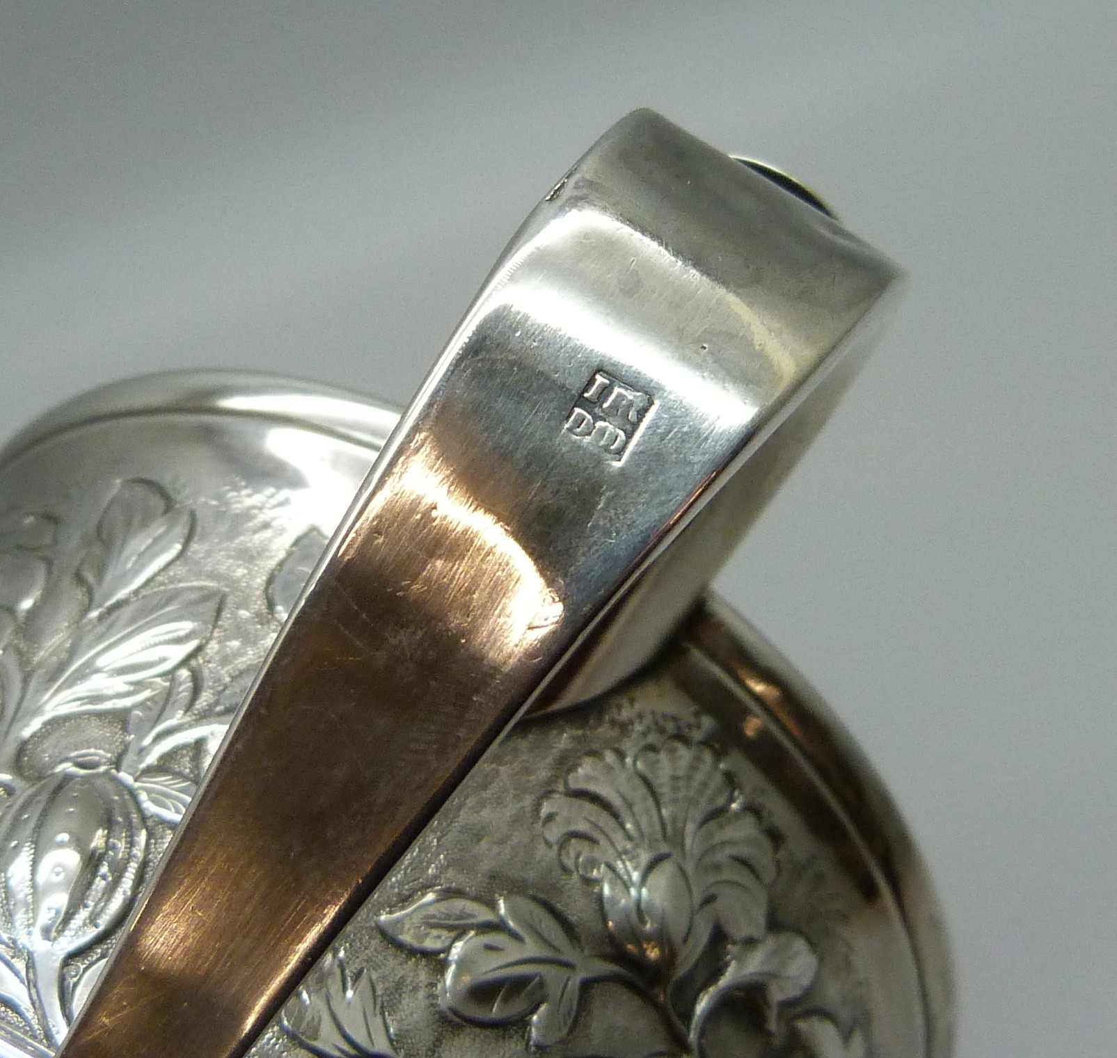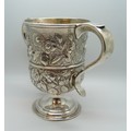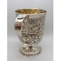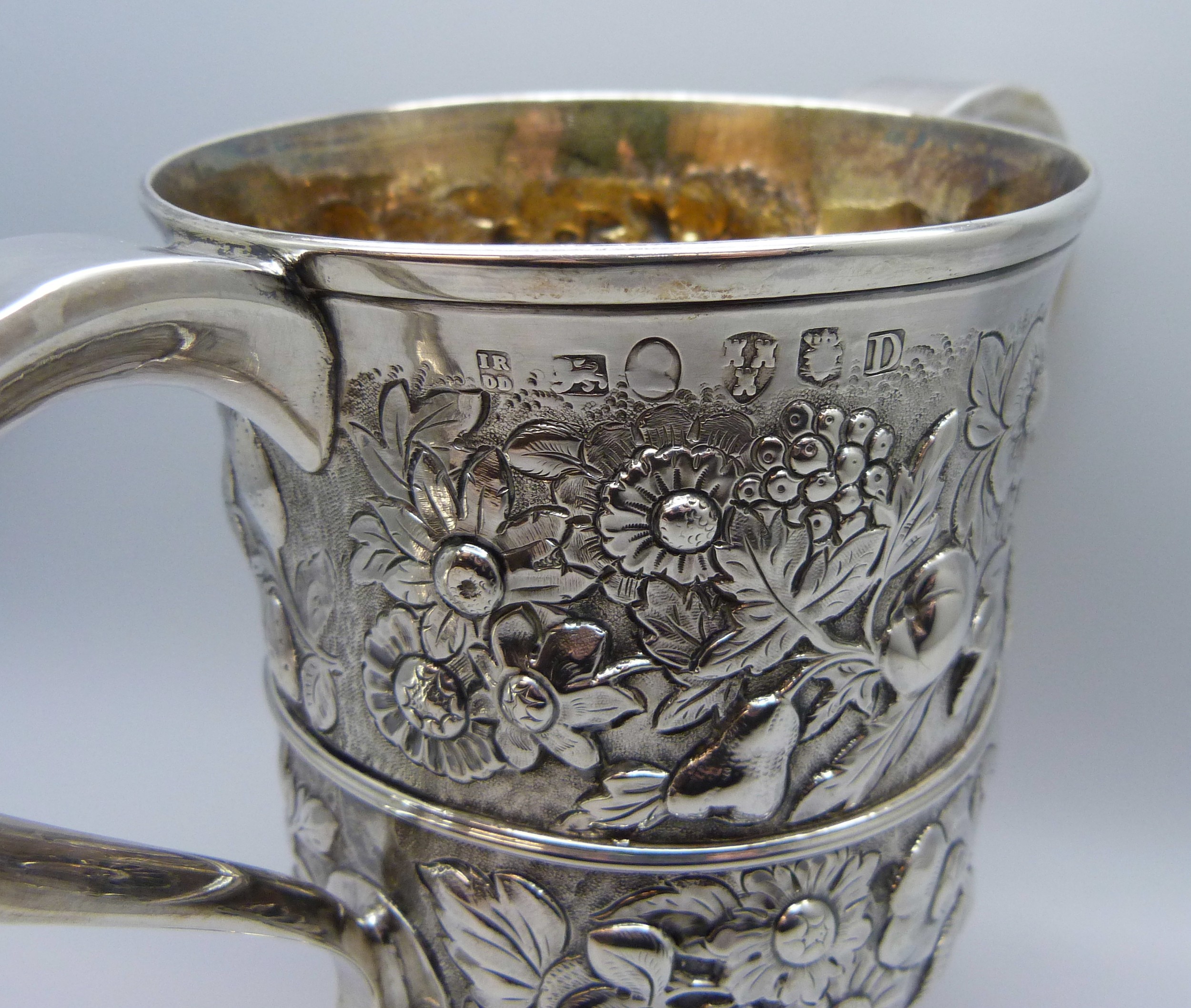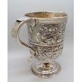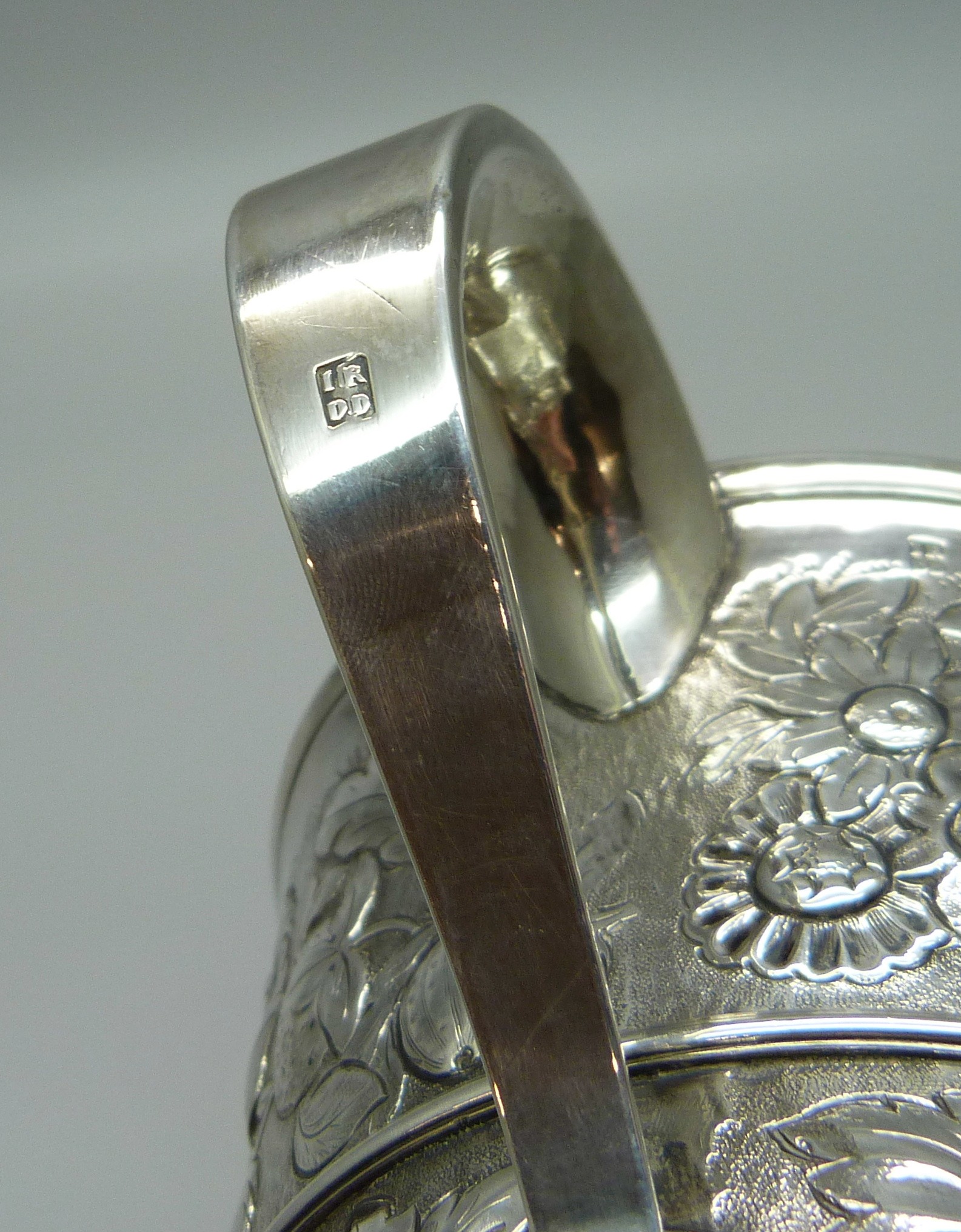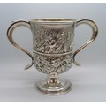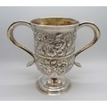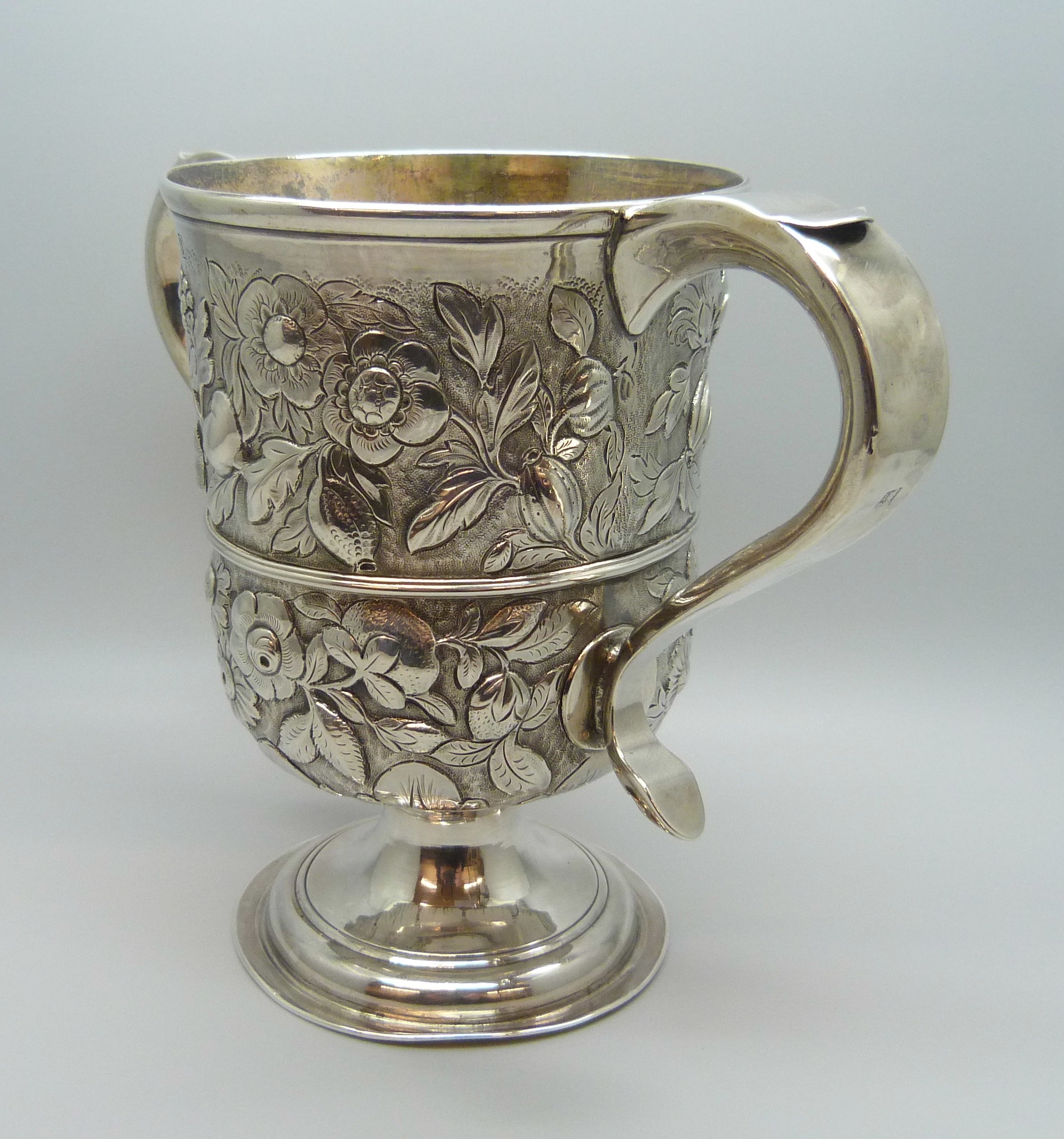 A George III silver two handled loving cup with embossed floral decoration, J Robertson & D Darling, Newcastle, 1794, 343g, 14.2cm tall