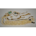A group of gold jewellery comprising a 9ct gold box link chain, 2.9g, a 10ct gold maple leaf stick pin, 0.9g and various unmarked items of jewellery, including a pearl set cross-over ring, two further rings, chains, earrings, a jade pendant and a double stranded cultured pearl choker.