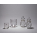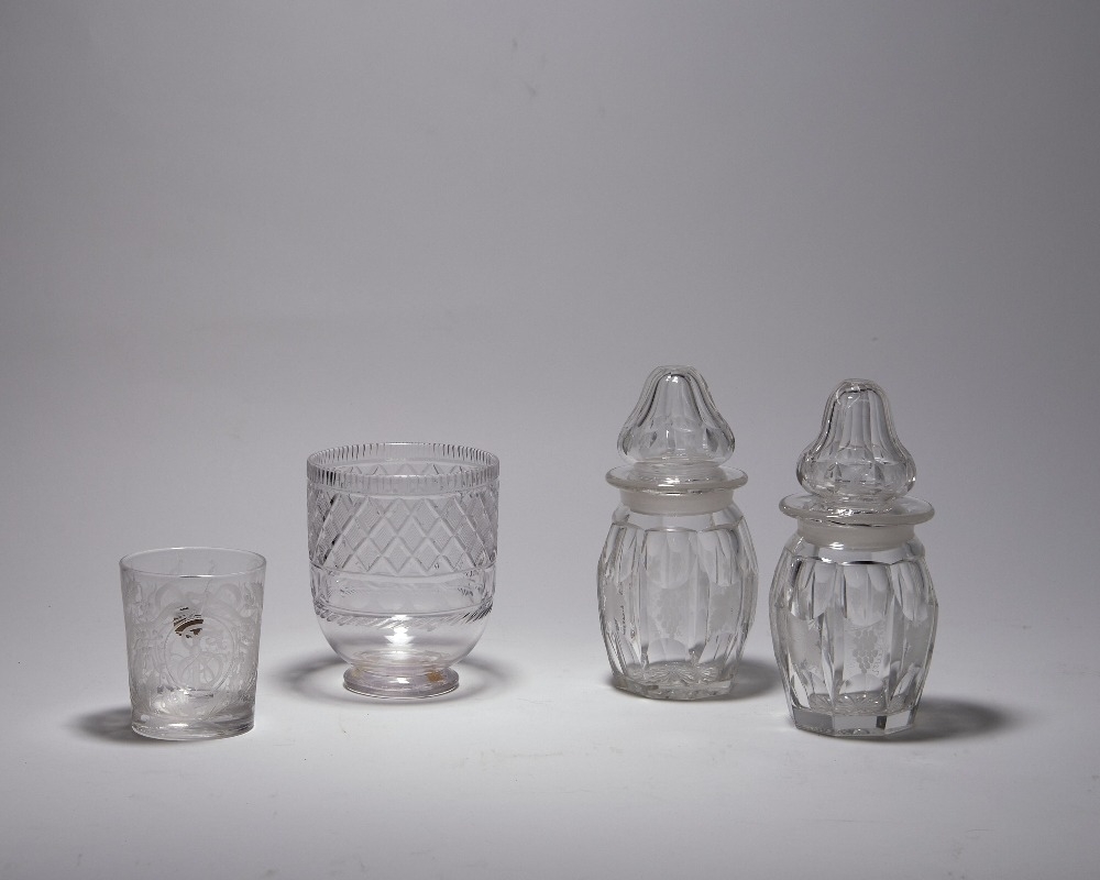A group of late Georgian and Victorian glass table wares, comprising:ÿa finely engraved Scottish glass tumbler with birds, holly and thistle, monogram, and Robert Burns verse ?health to them that?s awa? to underside, 8.7cm high; a pair of Victorian vine and leaf engraved pickle jars and covers, and a Regency cut glass tea caddy insert (4)