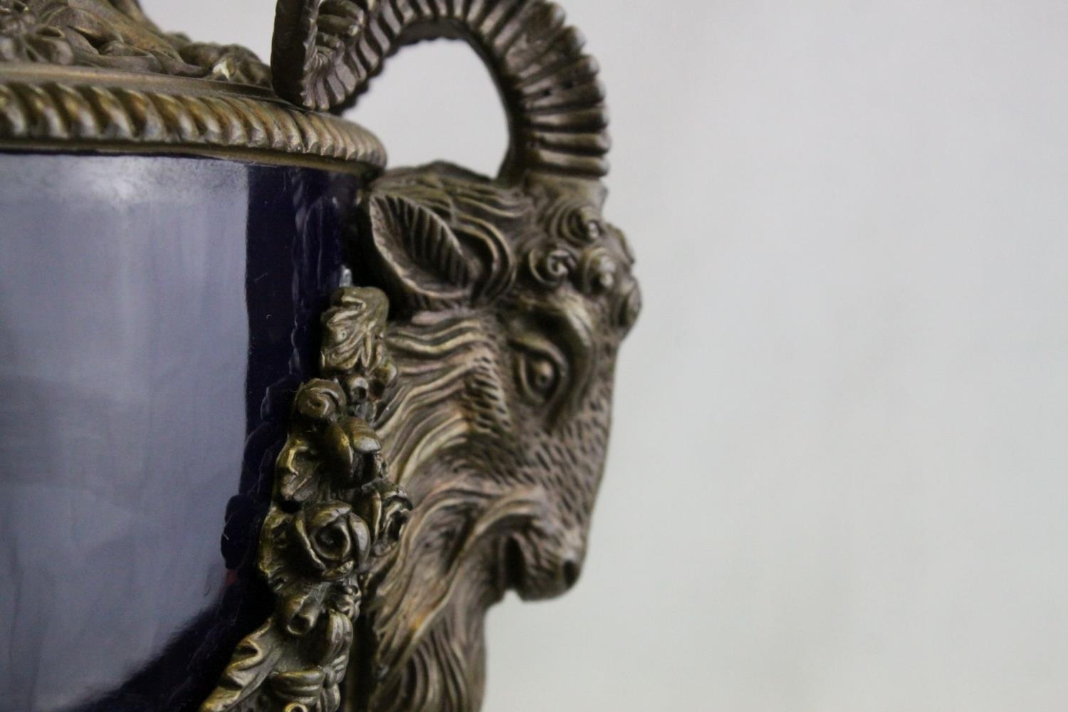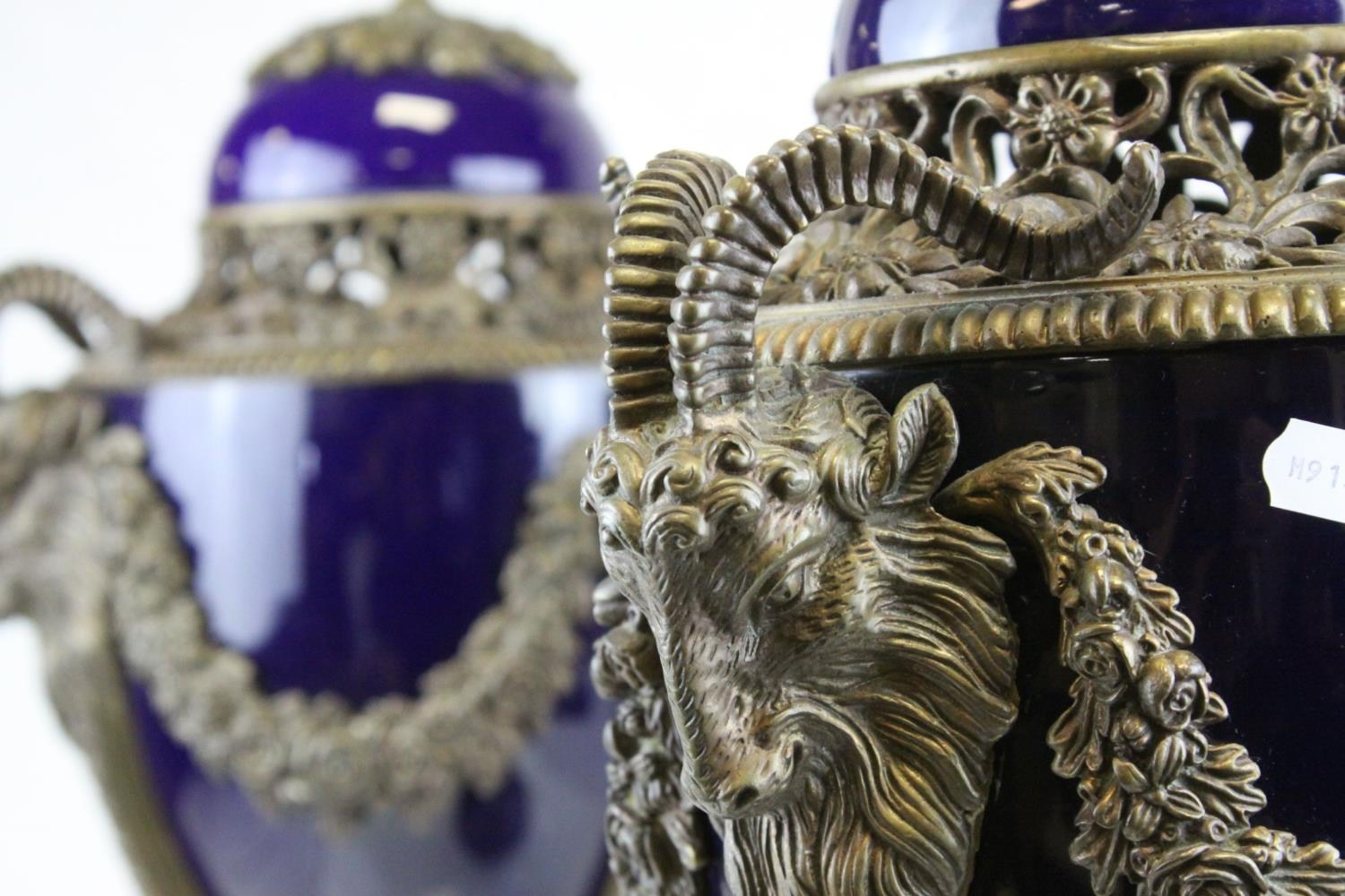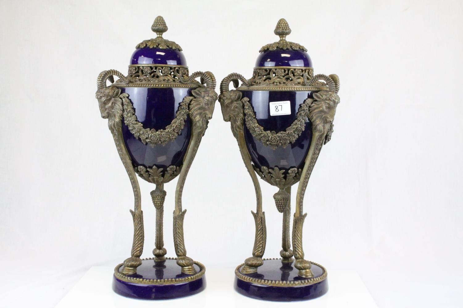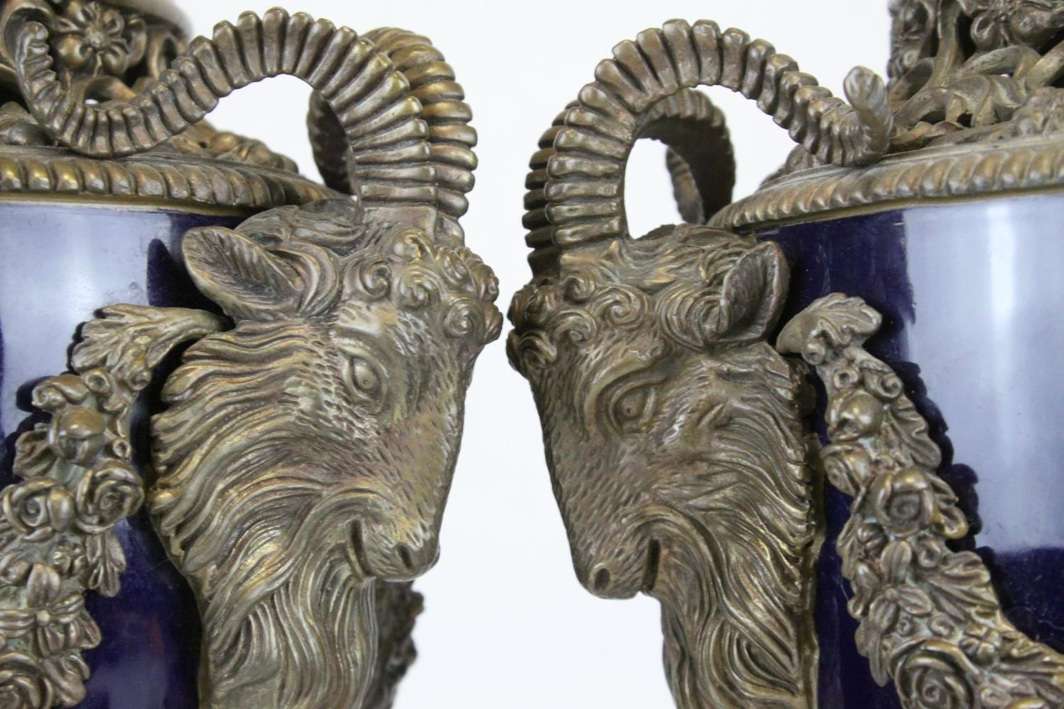 Pair of 19th century French Sevres Style Cobalt Blue Porcelain Lidded Urns, the Ormolu Mounts with Ram's Head Masks, Floral Swags and raised on Three Ram's Feet, 57cms high