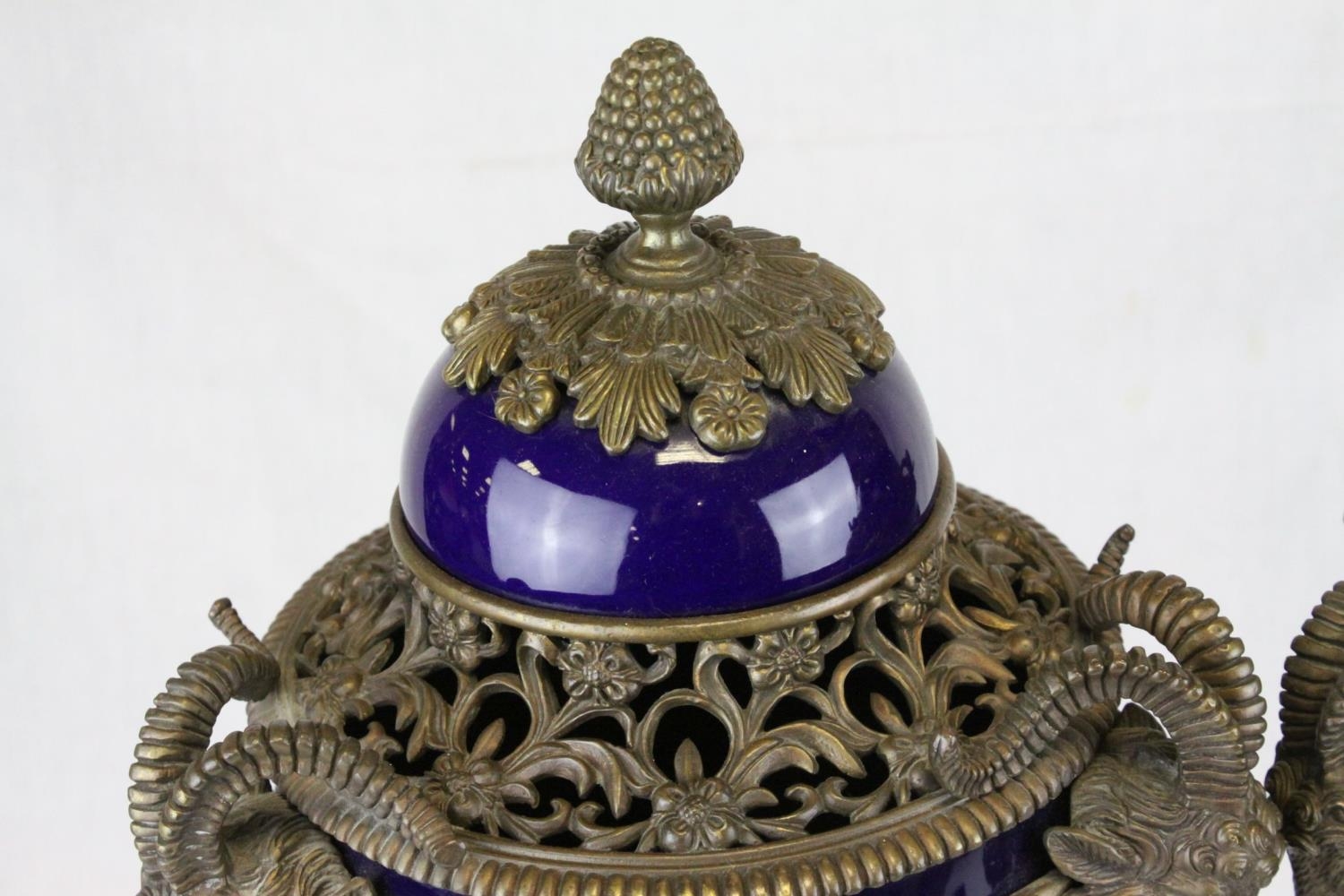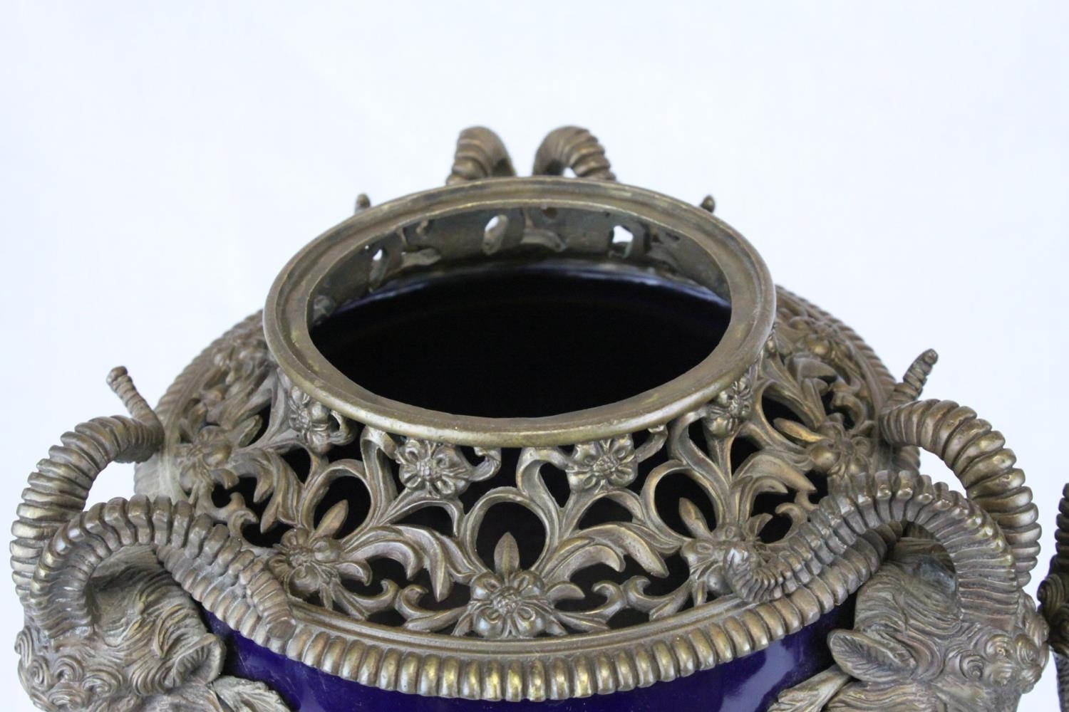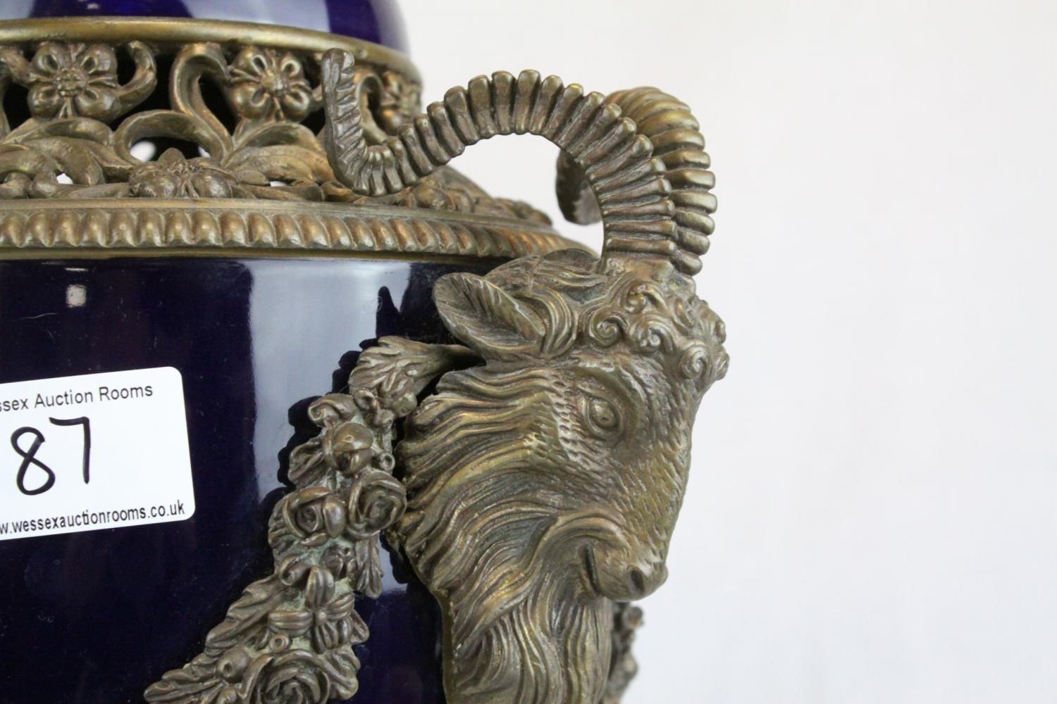 Pair of 19th century French Sevres Style Cobalt Blue Porcelain Lidded Urns, the Ormolu Mounts with Ram's Head Masks, Floral Swags and raised on Three Ram's Feet, 57cms high