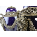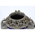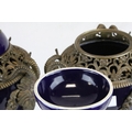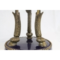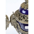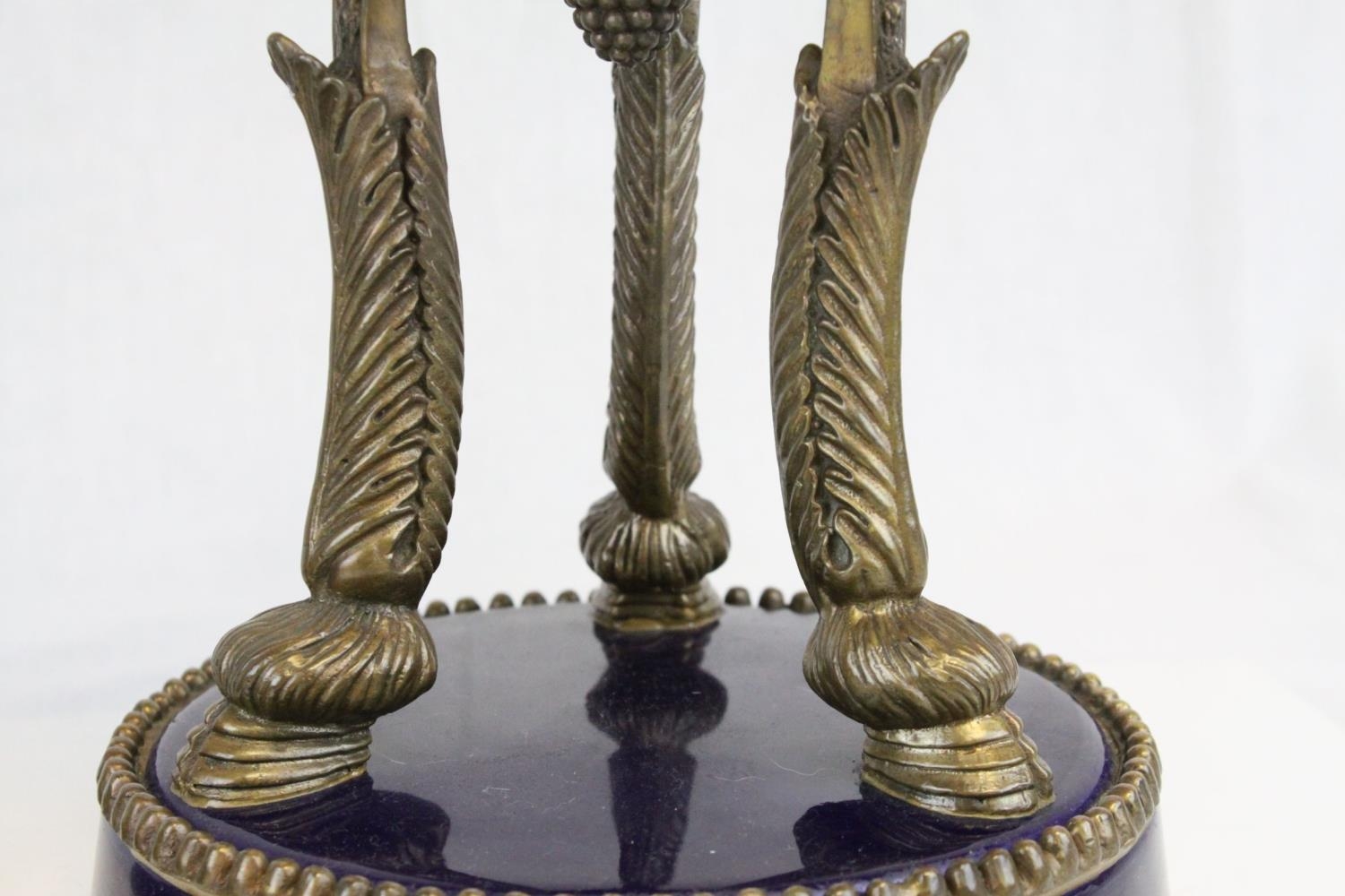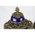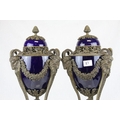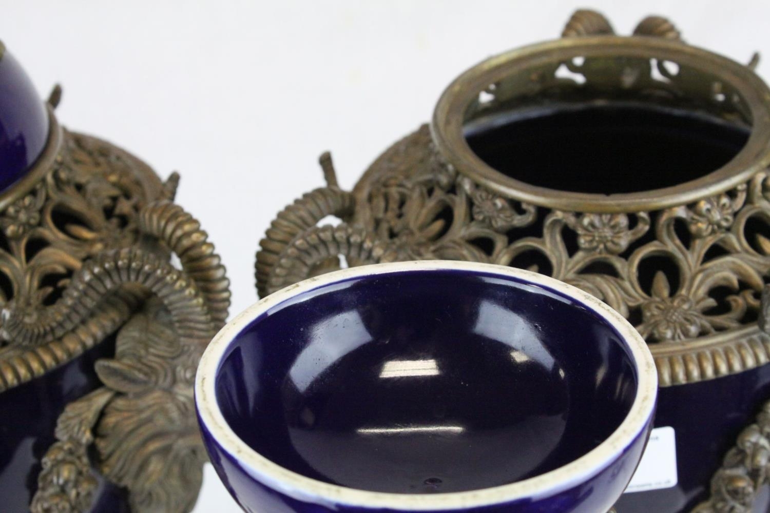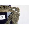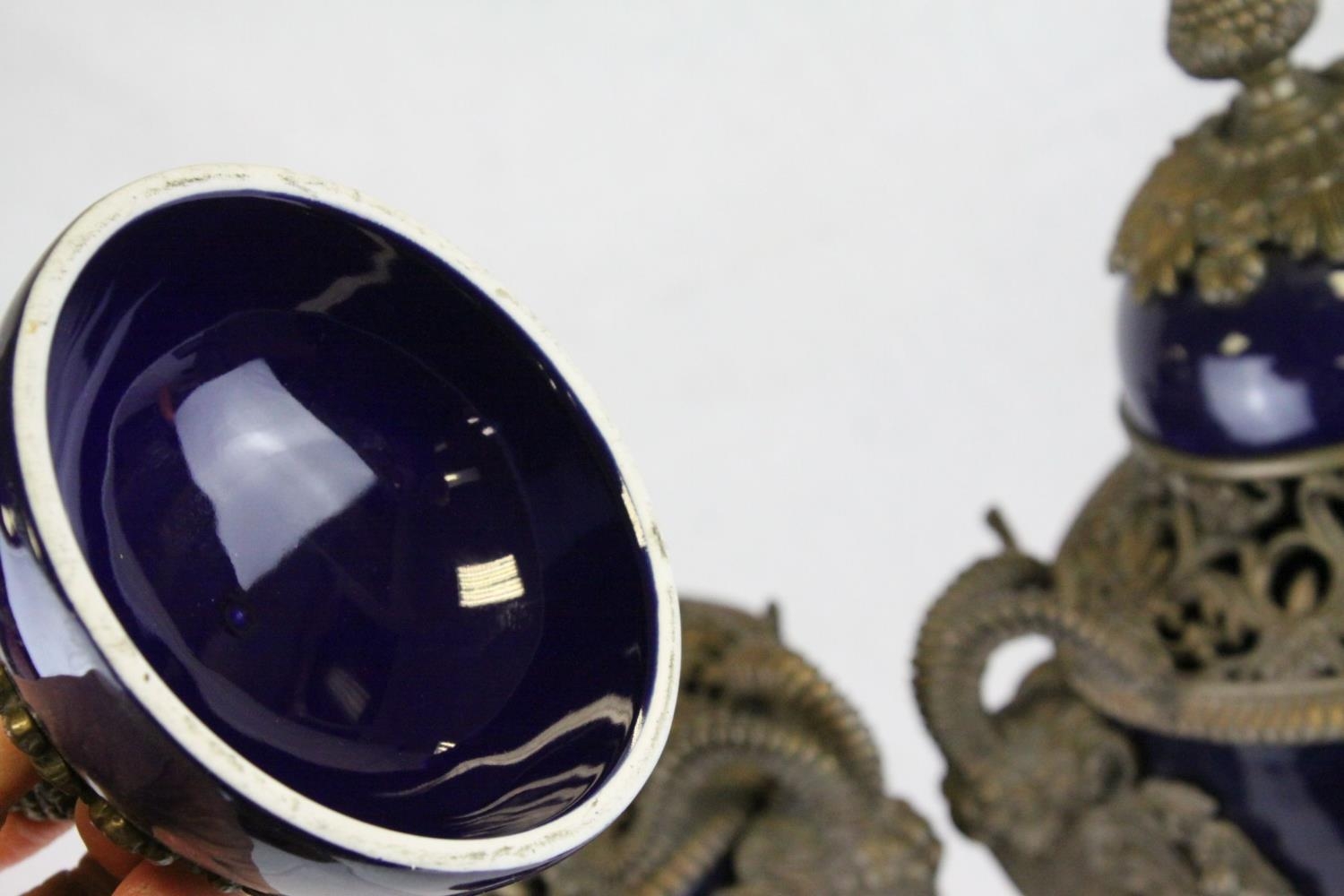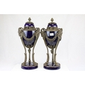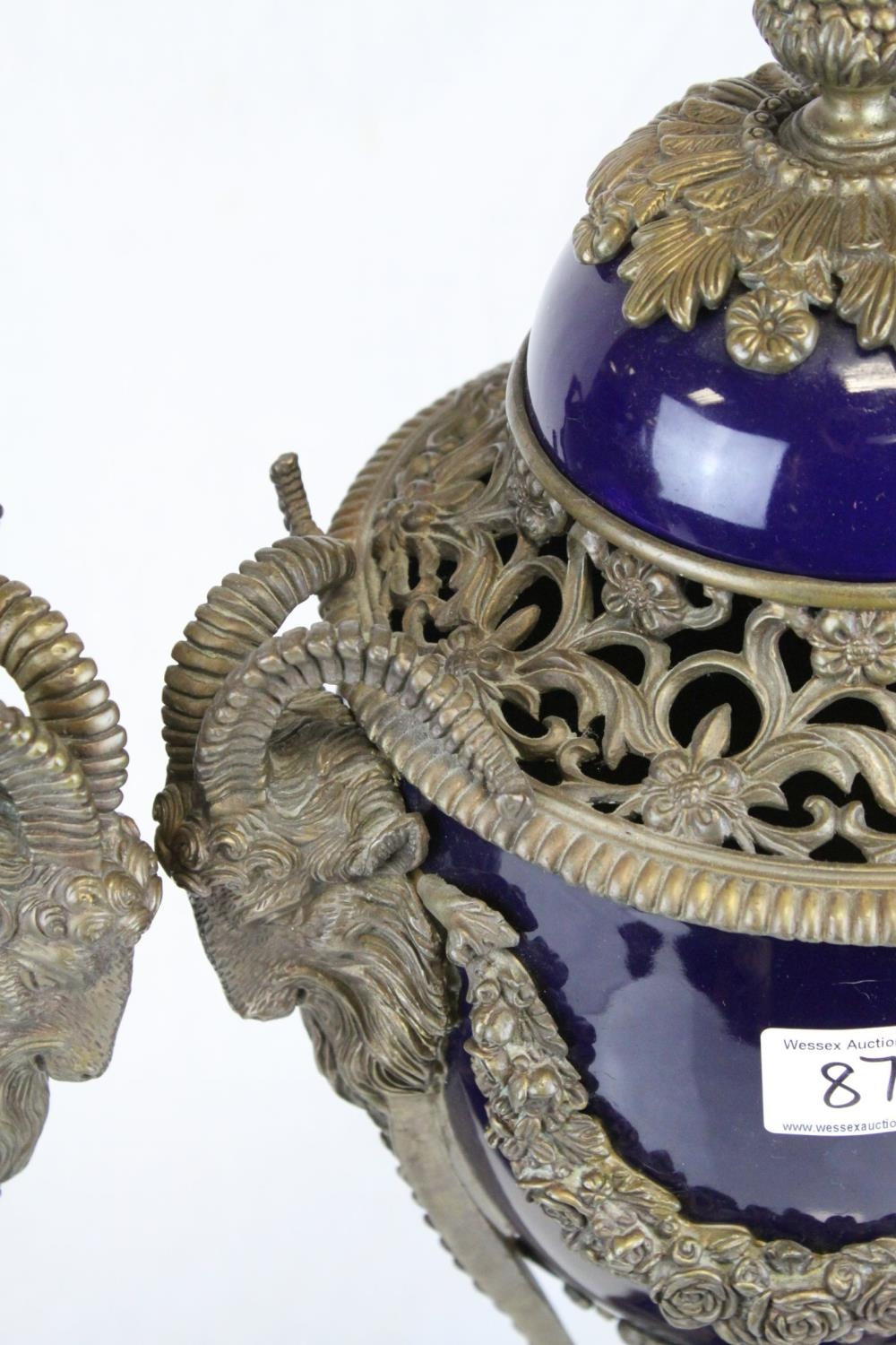 Pair of 19th century French Sevres Style Cobalt Blue Porcelain Lidded Urns, the Ormolu Mounts with Ram's Head Masks, Floral Swags and raised on Three Ram's Feet, 57cms high