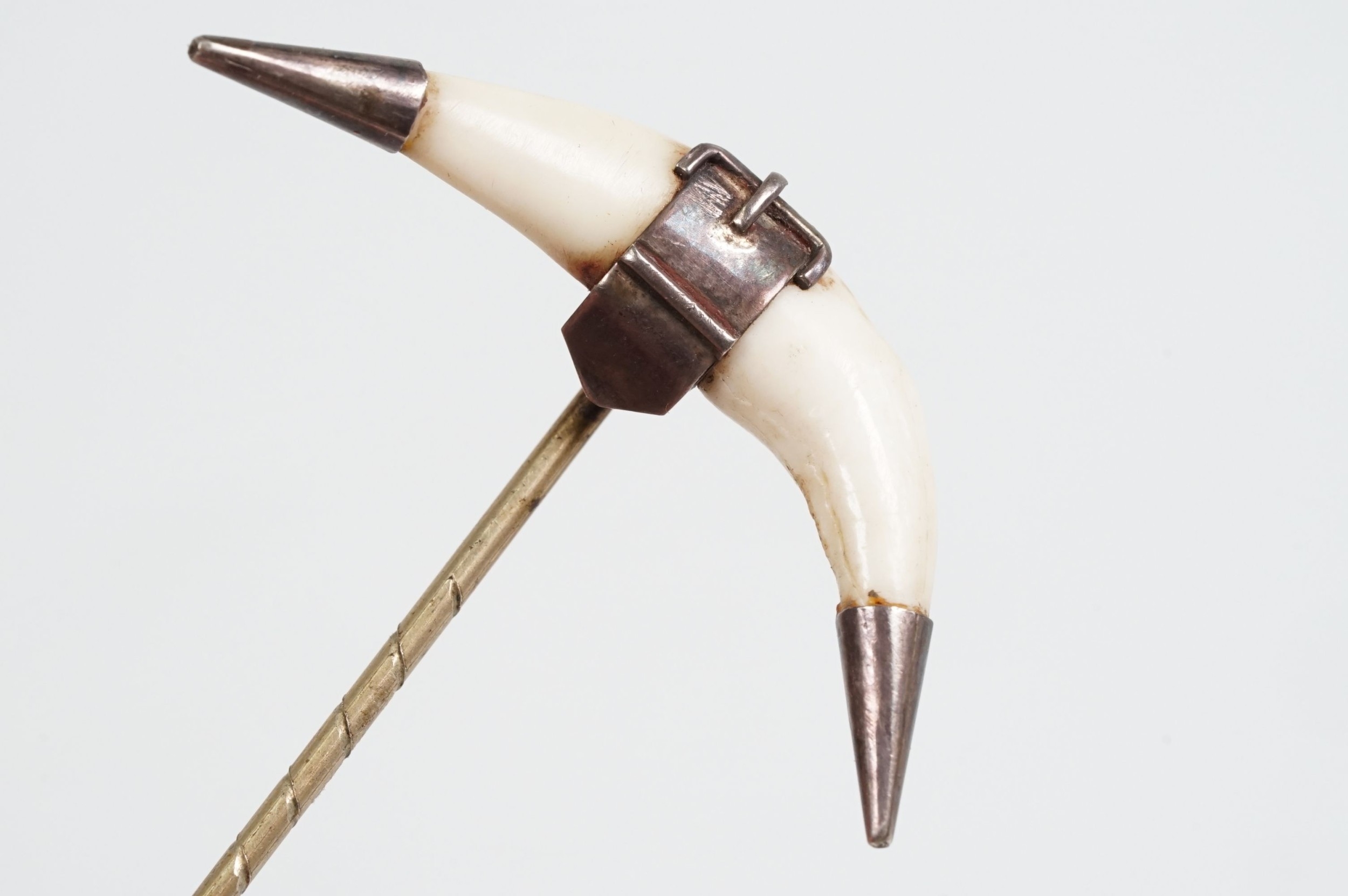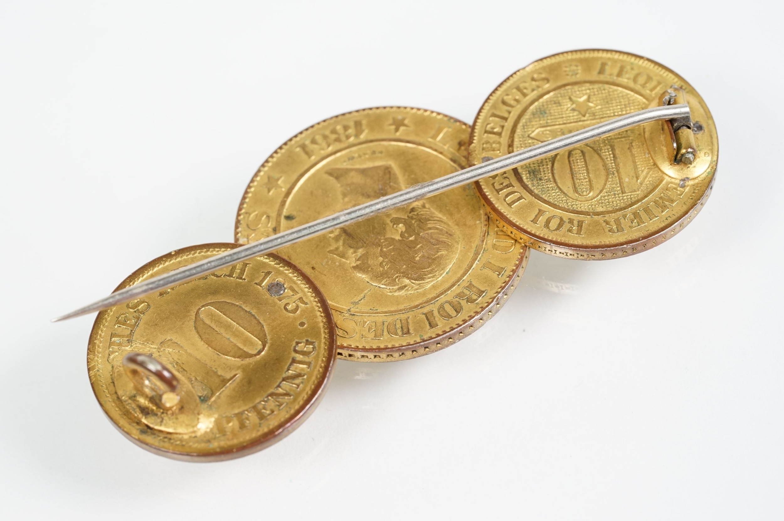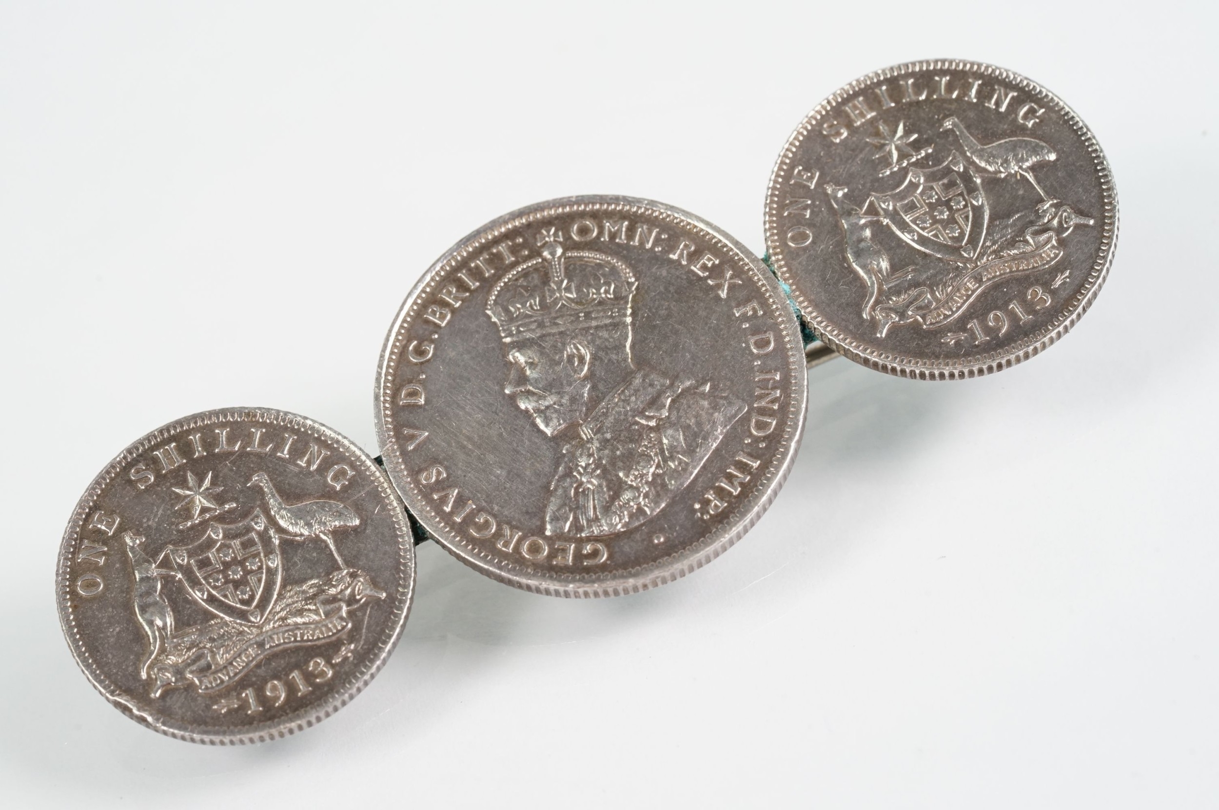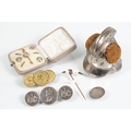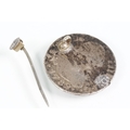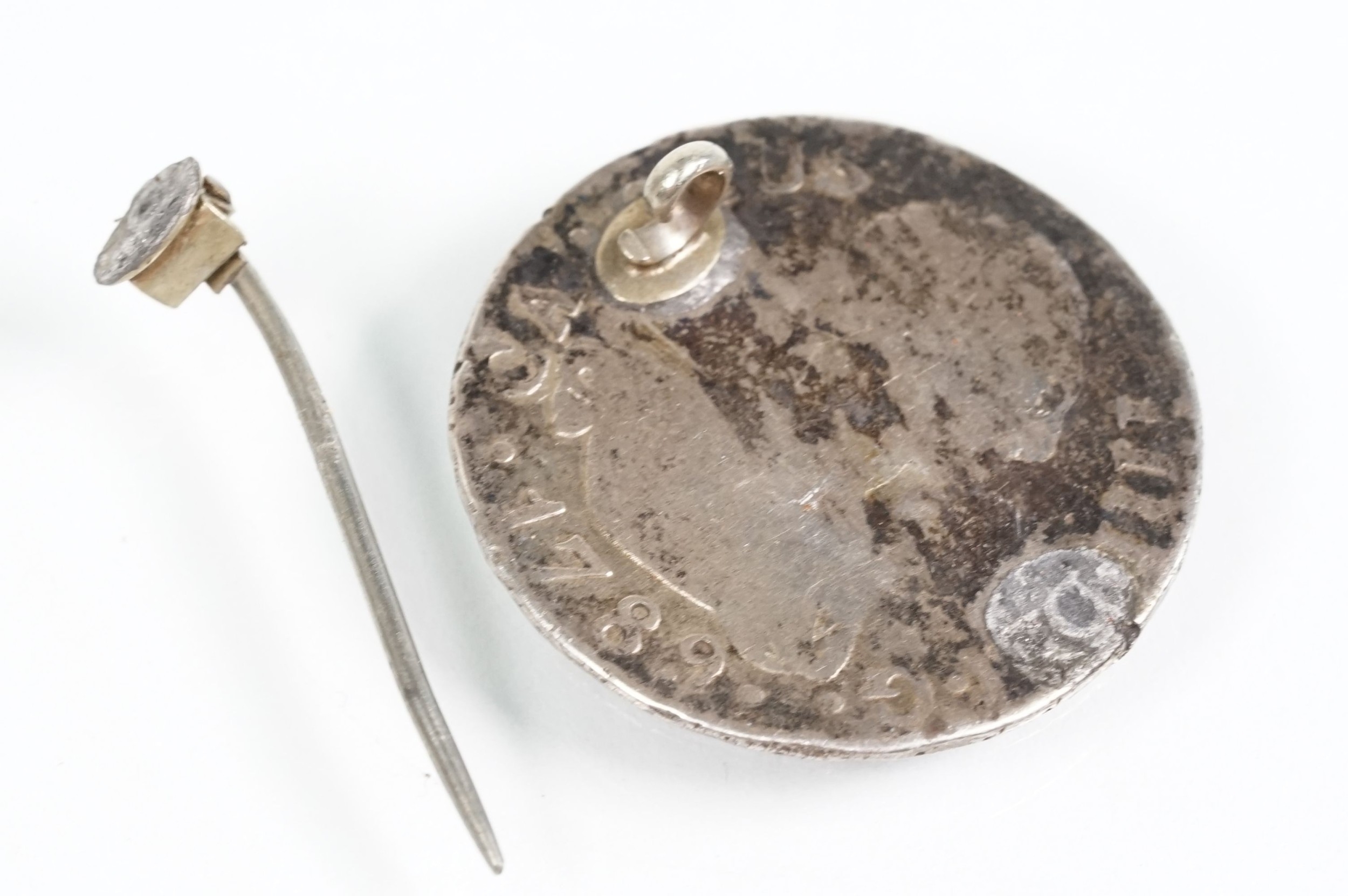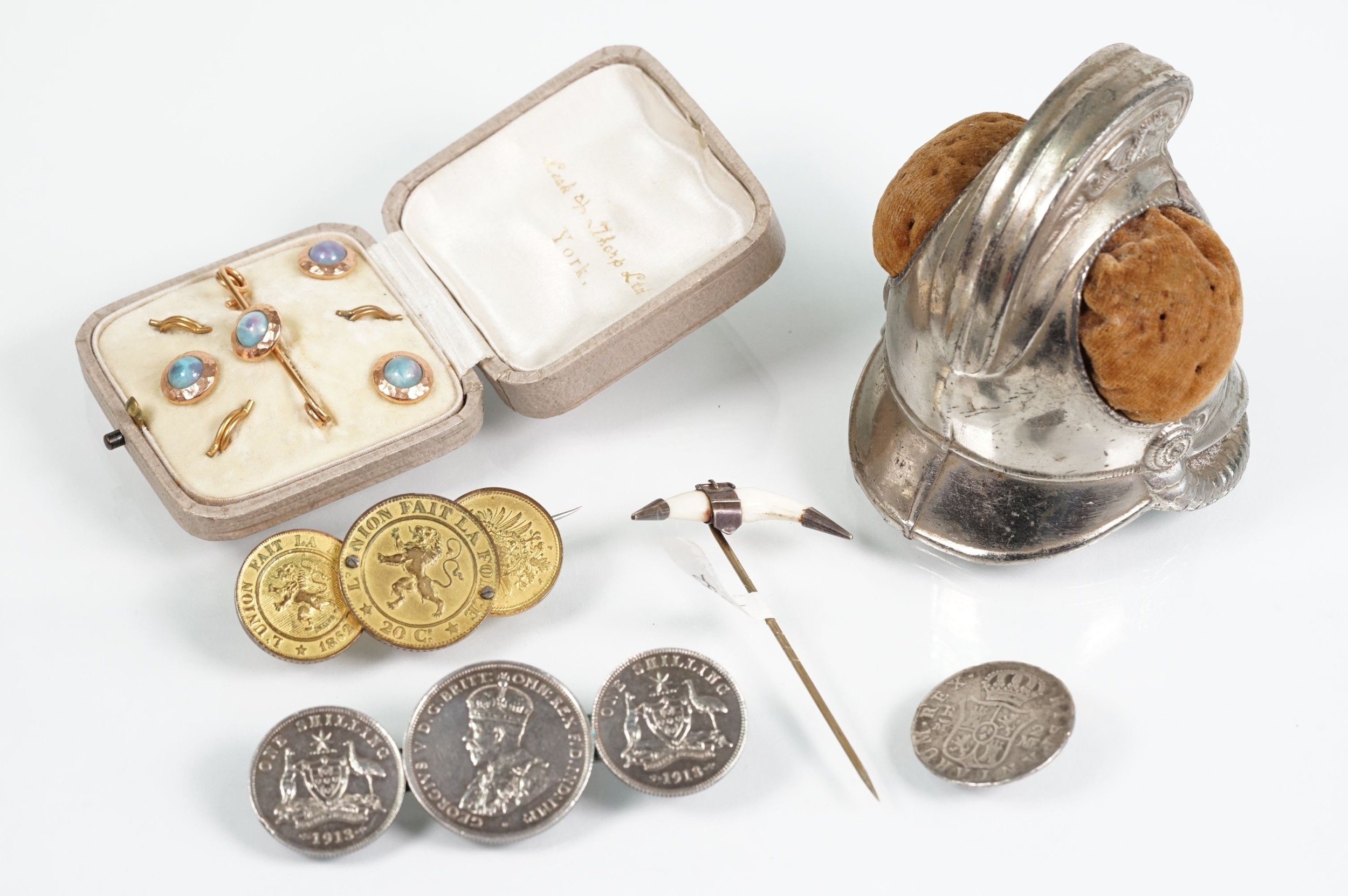 Set of Arts and Crafts dress studs being set with ceramic blue cabochons (gold plated unmarked) together with a a George V shilling brooch, George III coin brooch, one other and a tooth mounted stick pin. Together with a Victorian white meta helmet design pin cushion.
