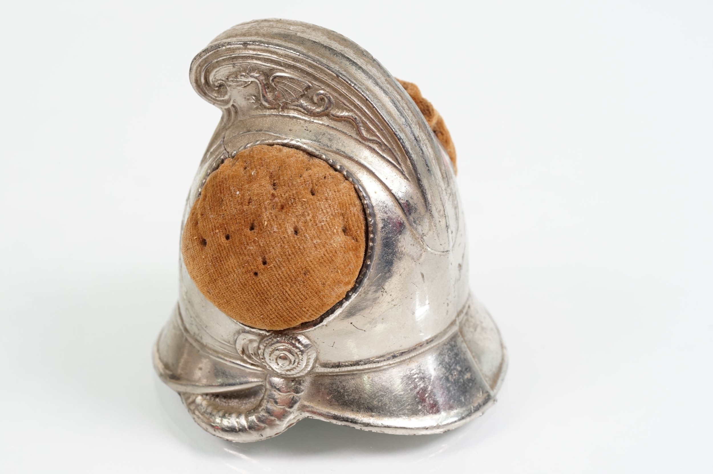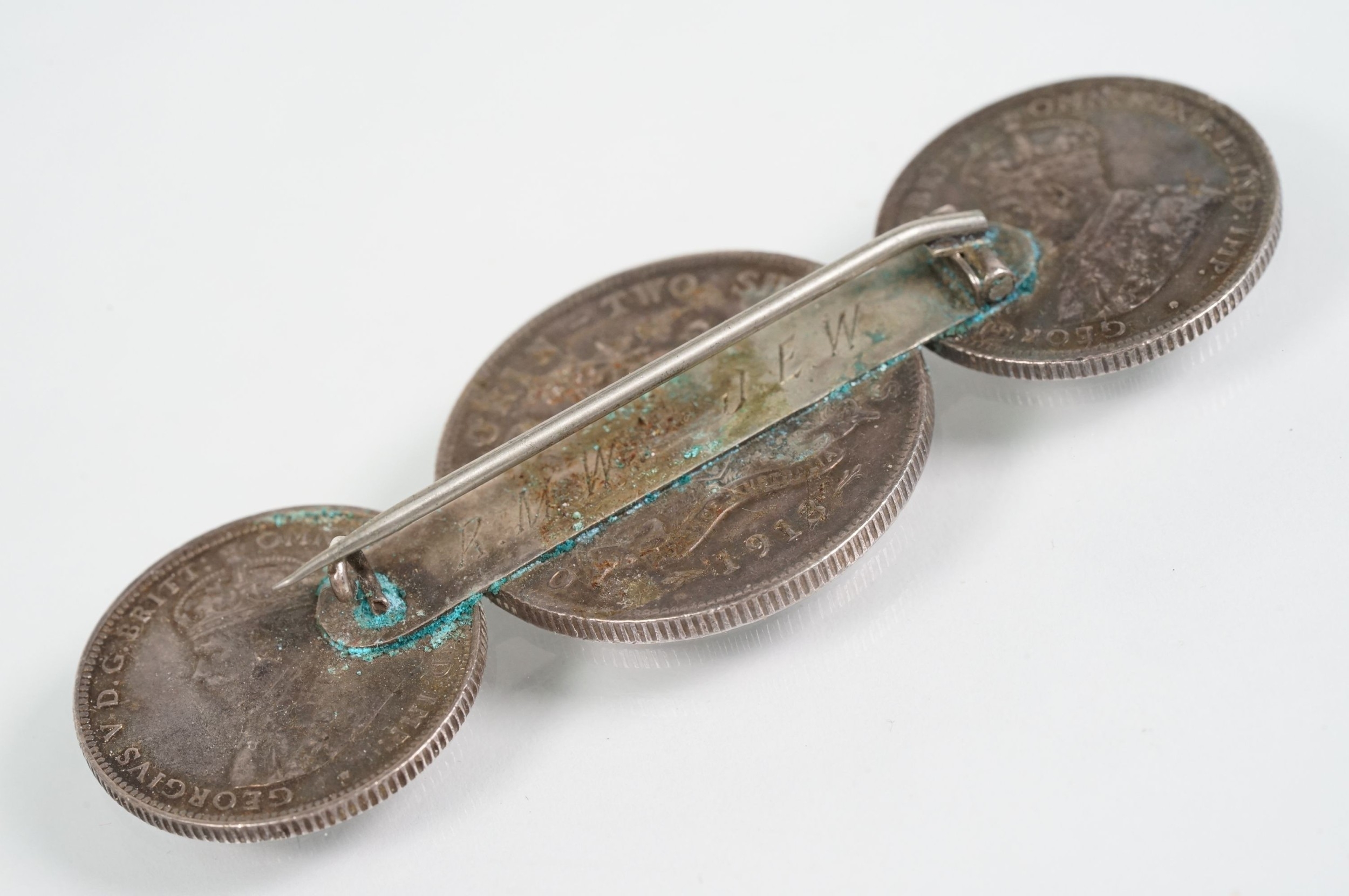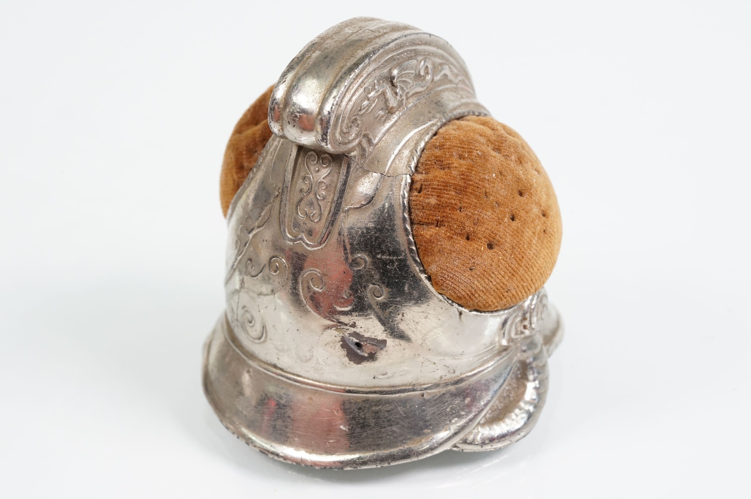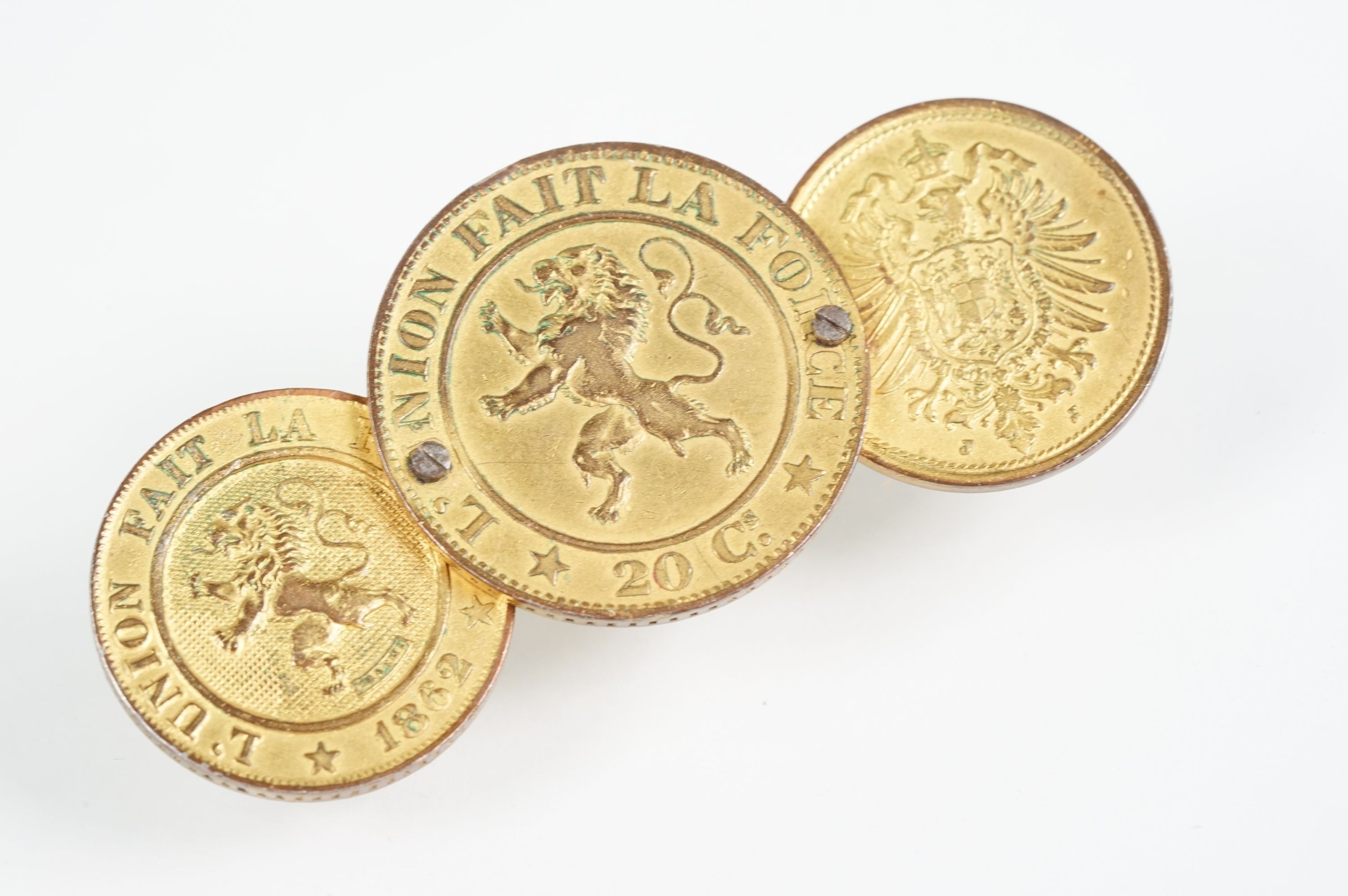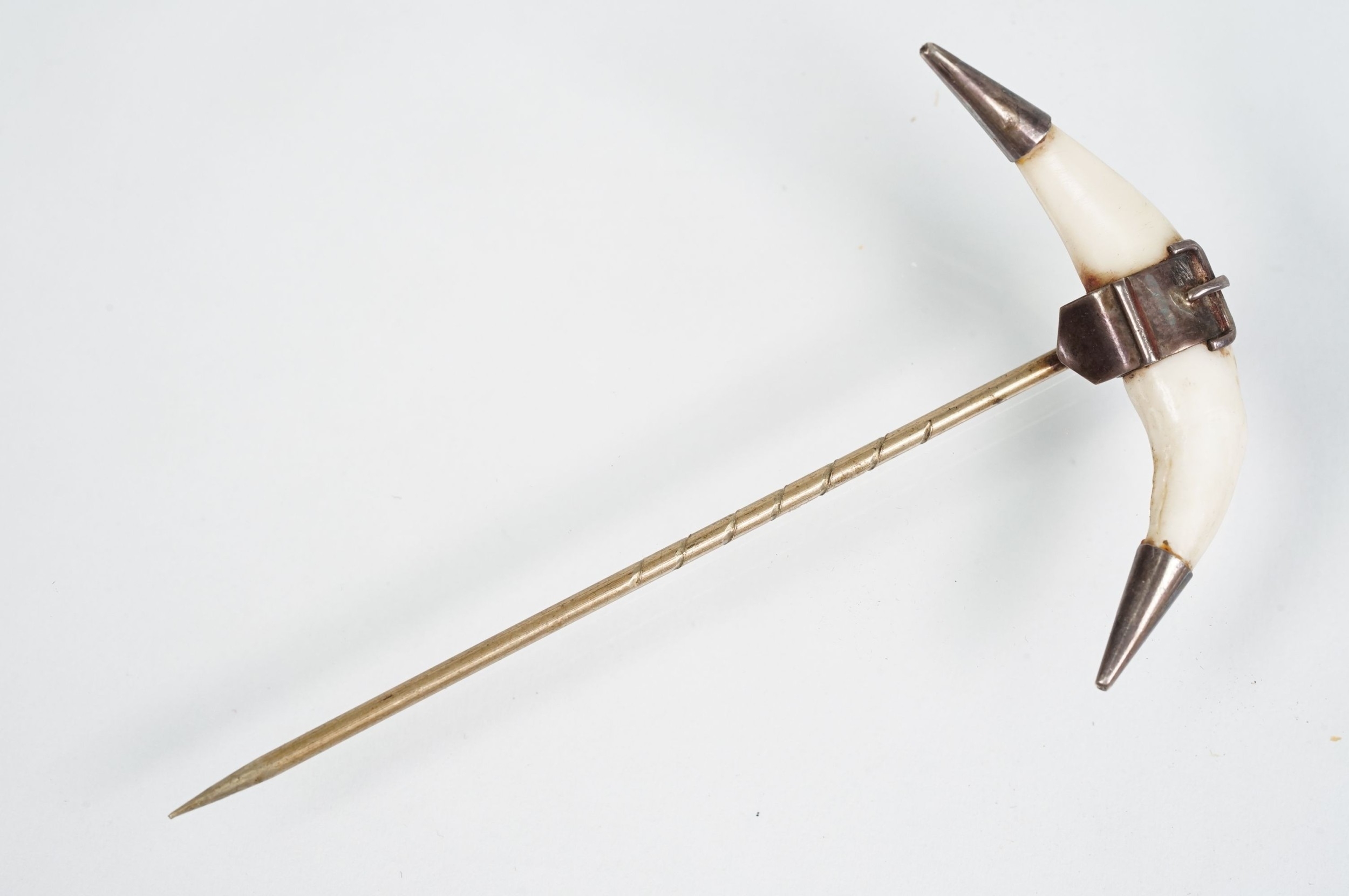 Set of Arts and Crafts dress studs being set with ceramic blue cabochons (gold plated unmarked) together with a a George V shilling brooch, George III coin brooch, one other and a tooth mounted stick pin. Together with a Victorian white meta helmet design pin cushion.