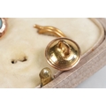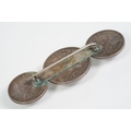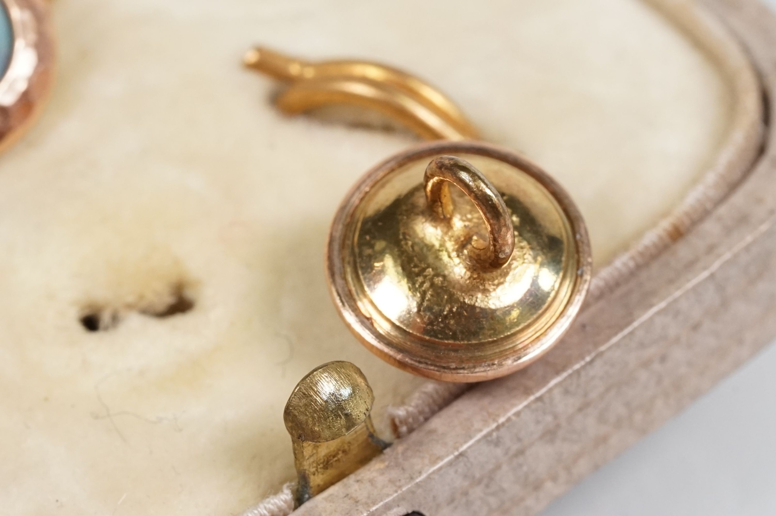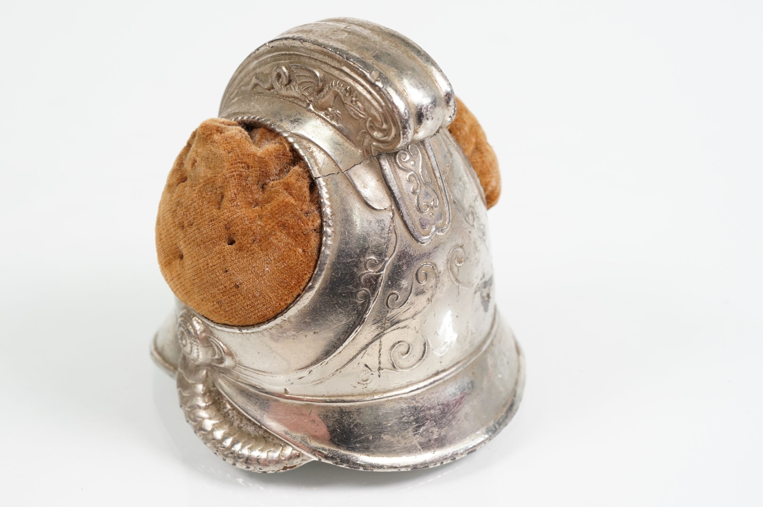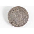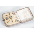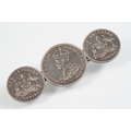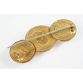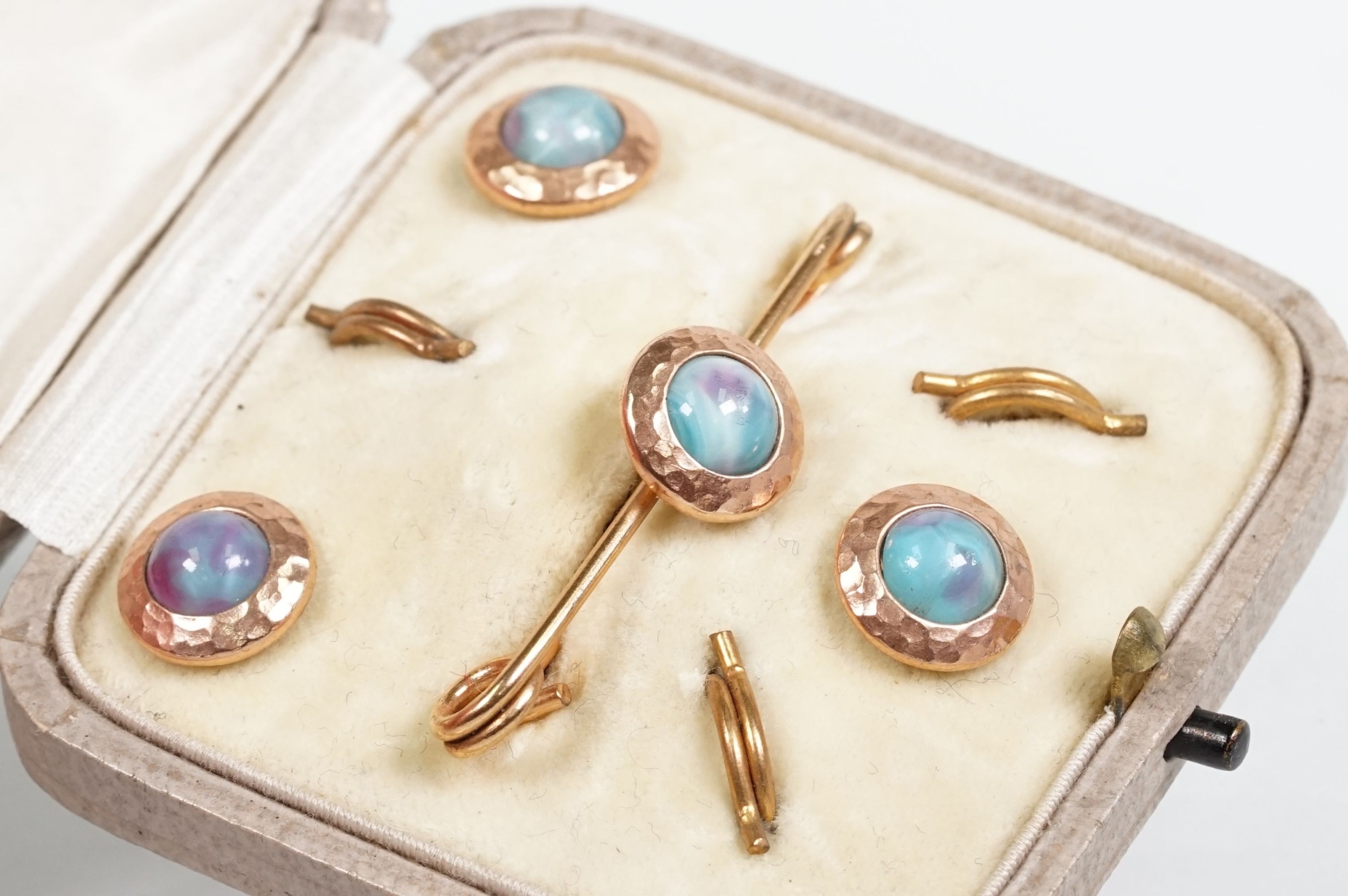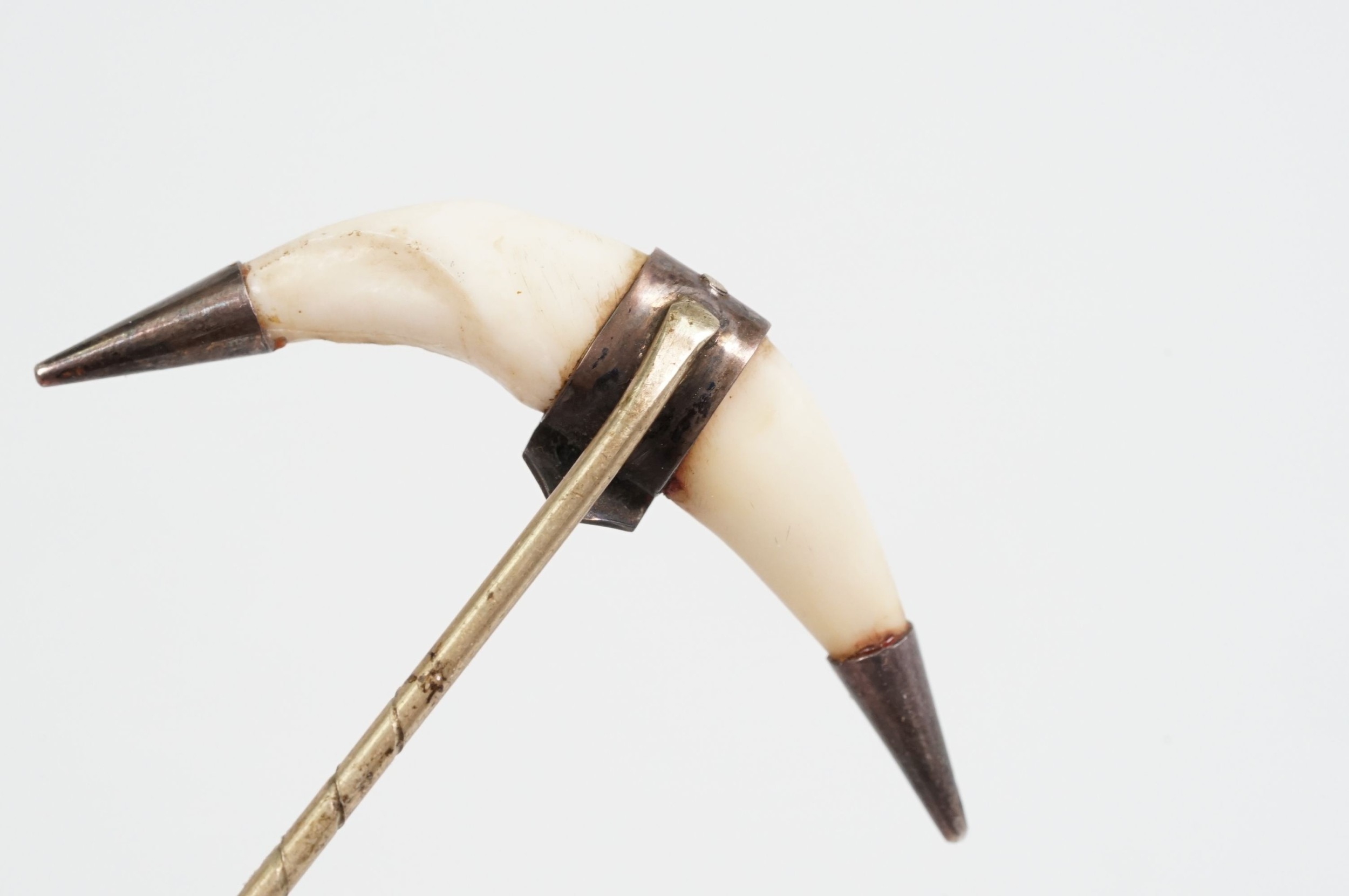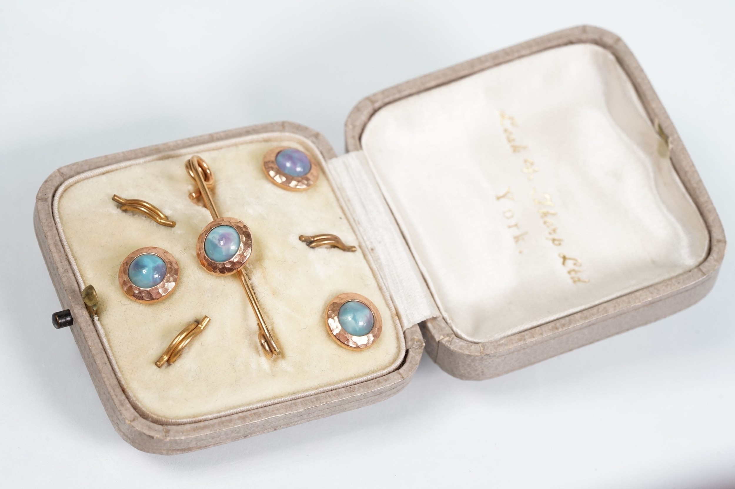 Set of Arts and Crafts dress studs being set with ceramic blue cabochons (gold plated unmarked) together with a a George V shilling brooch, George III coin brooch, one other and a tooth mounted stick pin. Together with a Victorian white meta helmet design pin cushion.
