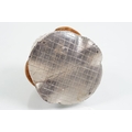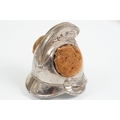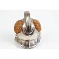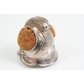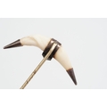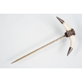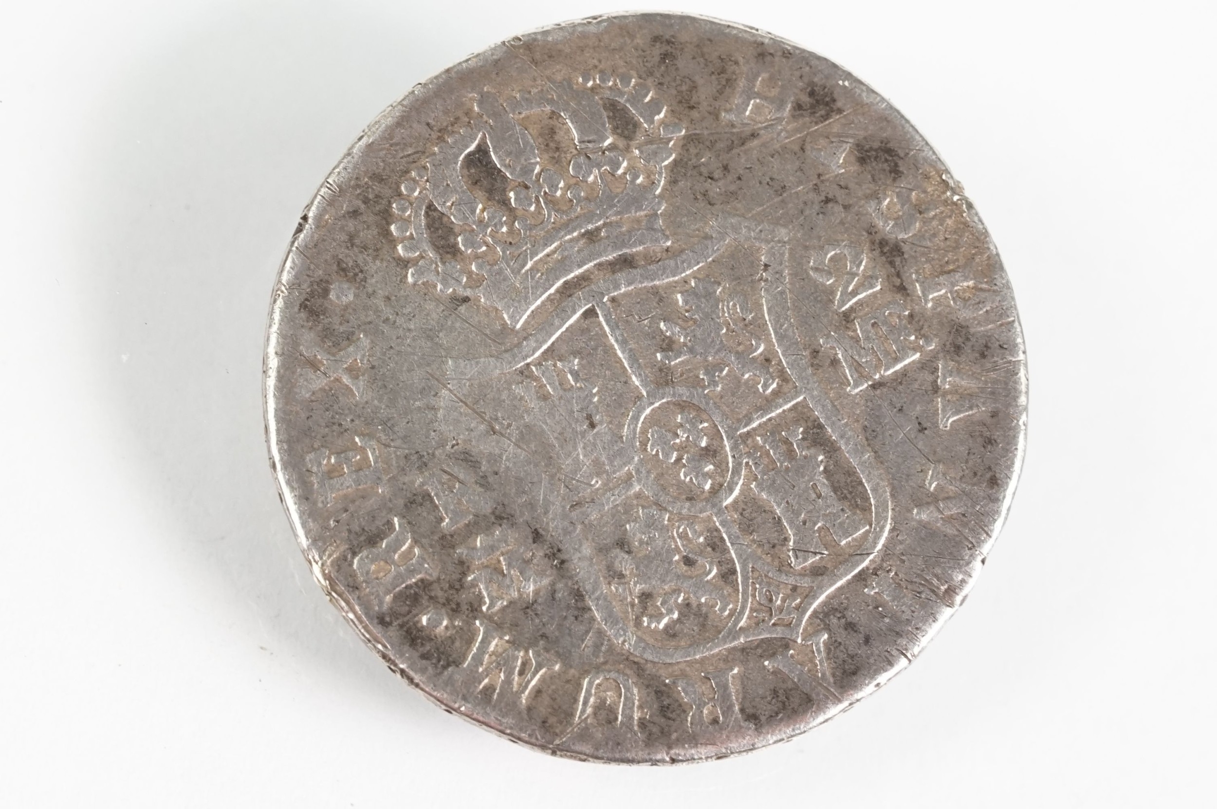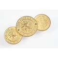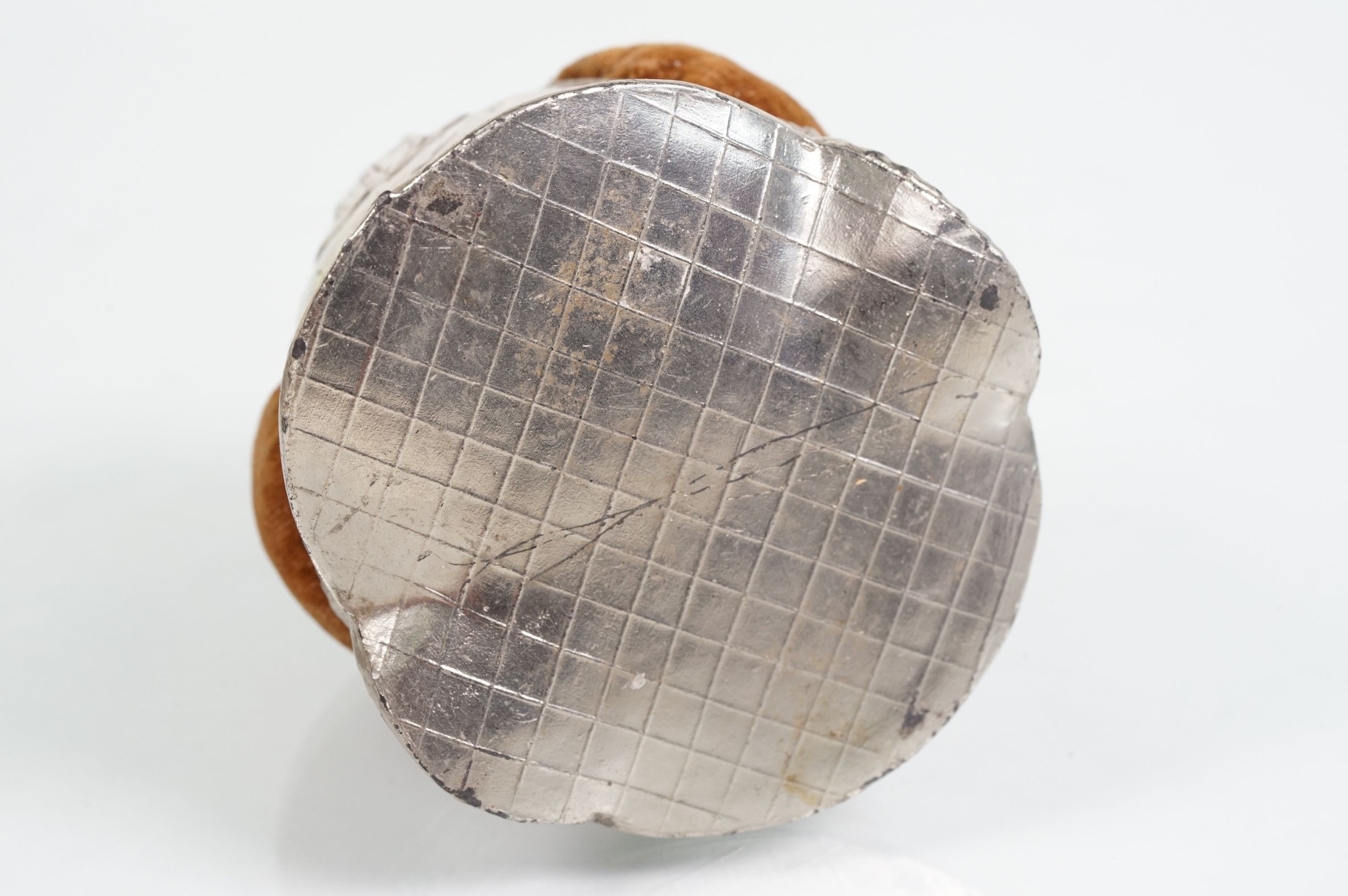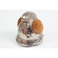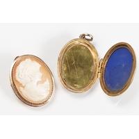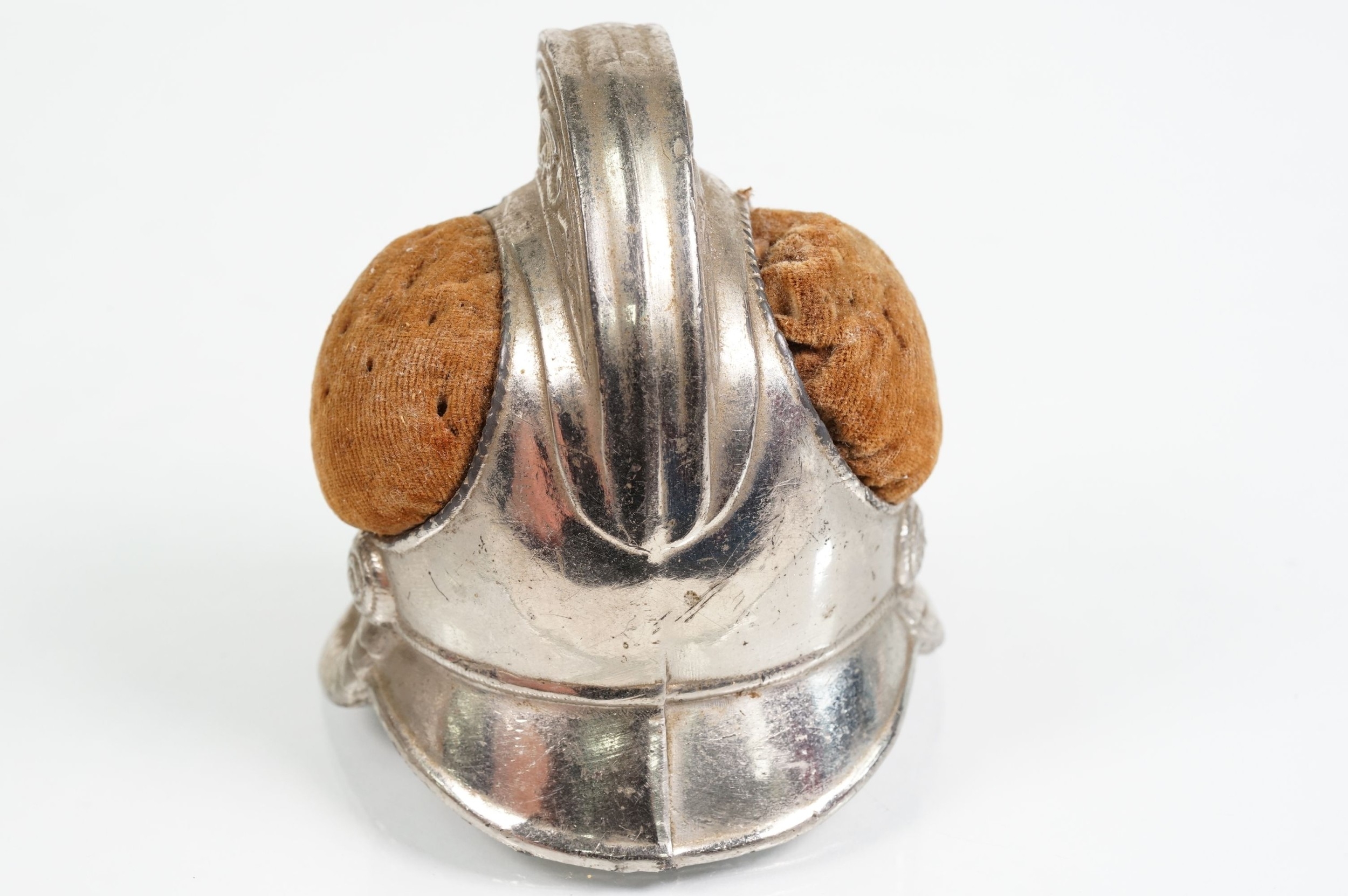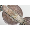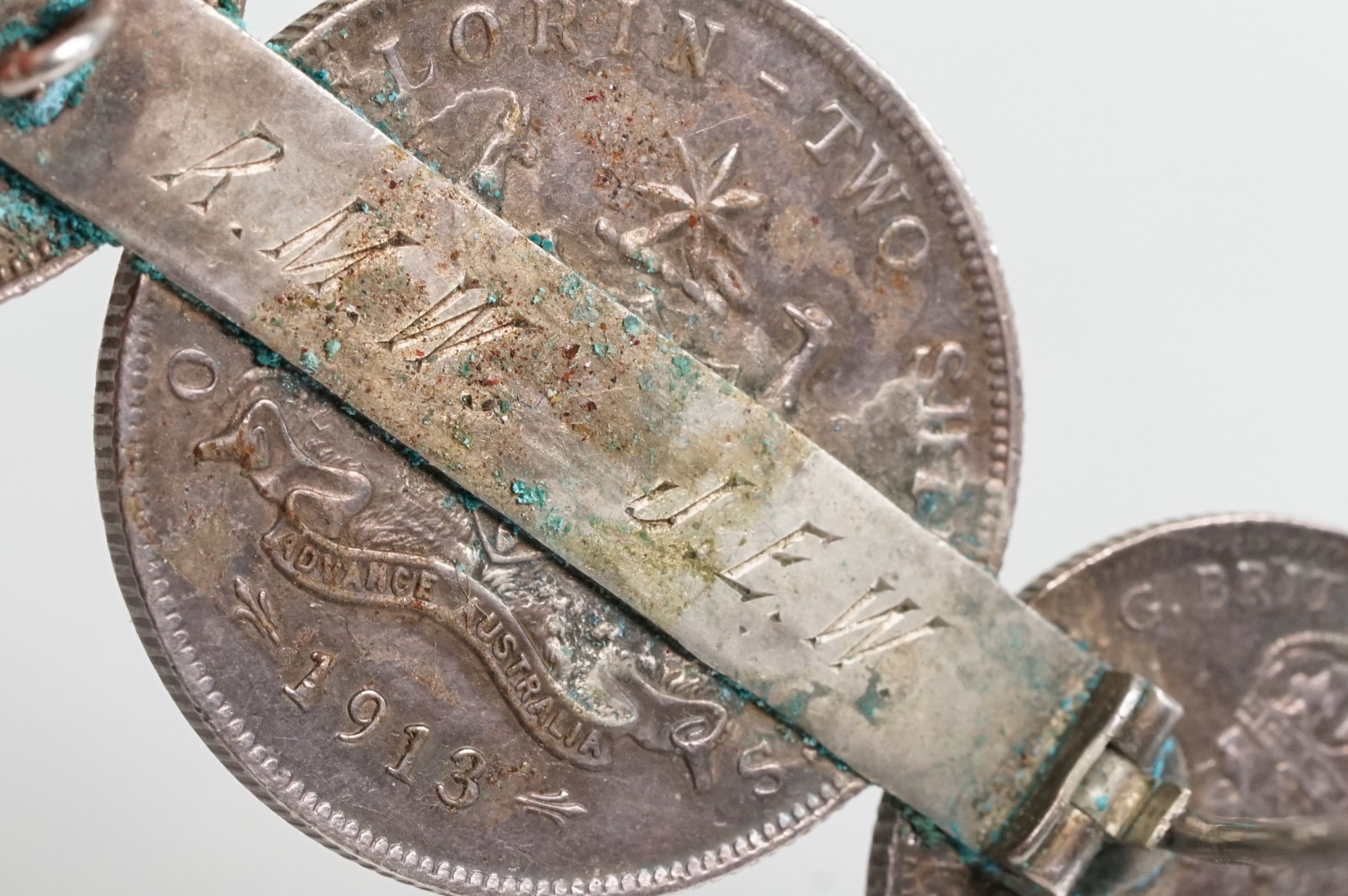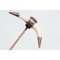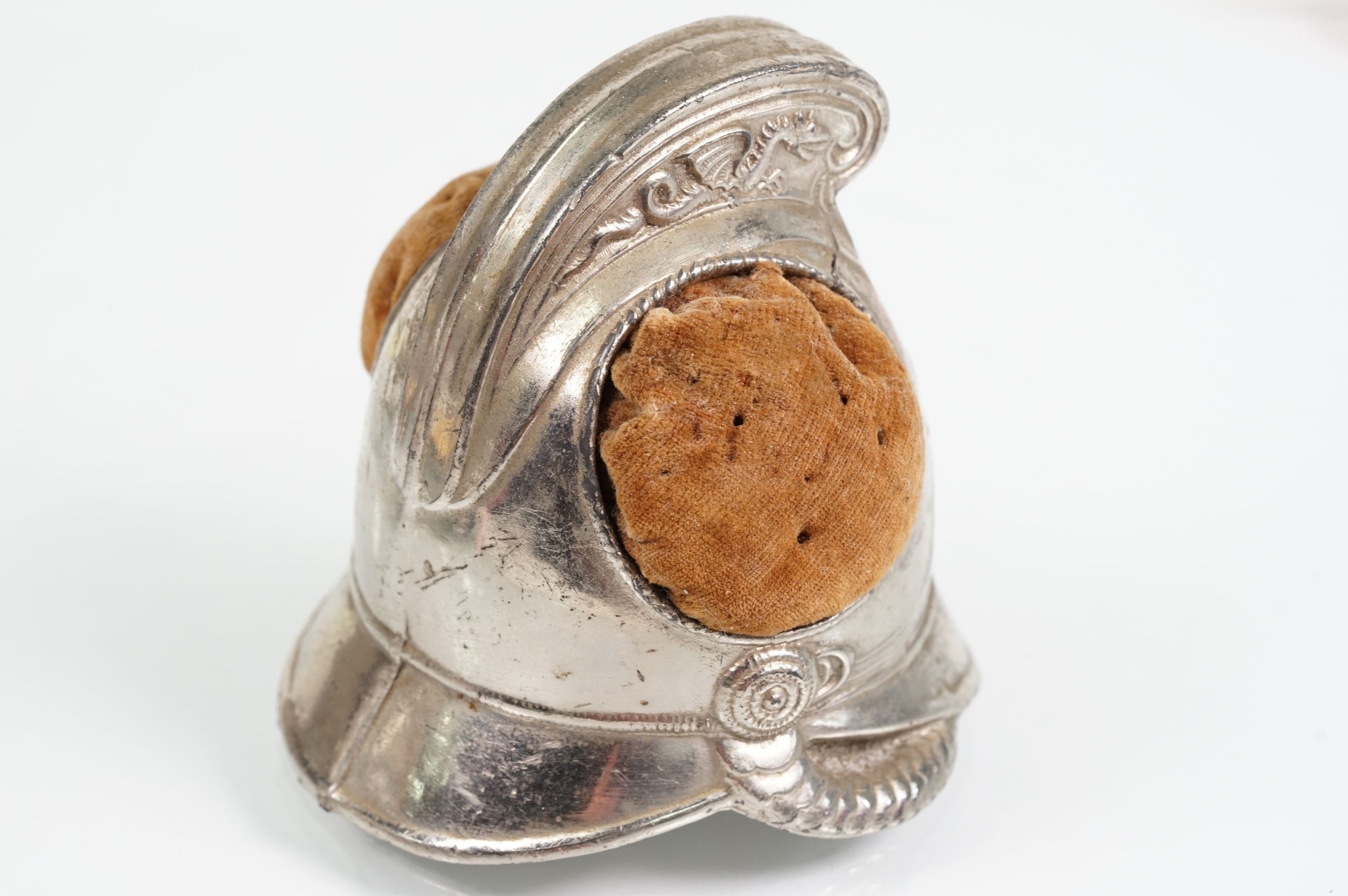 Set of Arts and Crafts dress studs being set with ceramic blue cabochons (gold plated unmarked) together with a a George V shilling brooch, George III coin brooch, one other and a tooth mounted stick pin. Together with a Victorian white meta helmet design pin cushion.