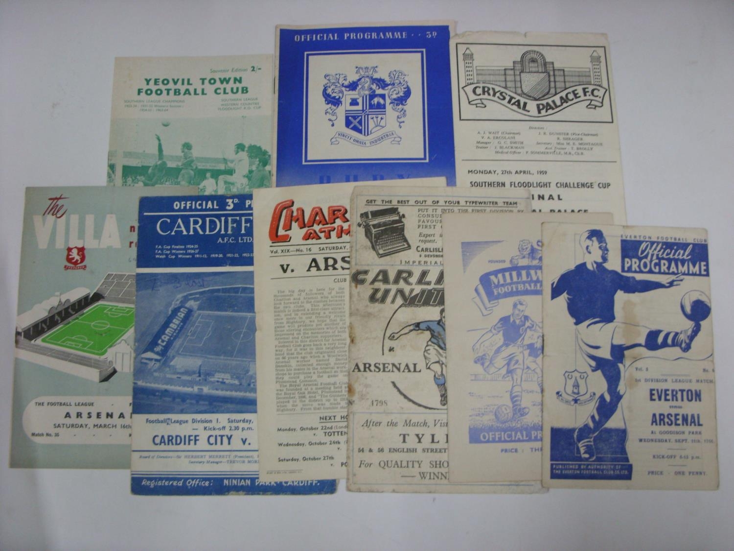 ARSENAL, 1946-1971, a collection of 9 away match football programmes, in various conditions, 1946/1947 Everton, 1950/1951 Millwall (Friendly), Carlisle United (FA Cup) poor, 1951/1952 Charlton, 1956/1957 Cardiff City, Aston Villa, 1958/1959 Crystal Palace (Southern Floodlight Challenge Cup Final), Bury (FA Cup), 1970/1971 Yeovil Town (FA Cup). Estimate: £100/£120 - Opening Bid: £90