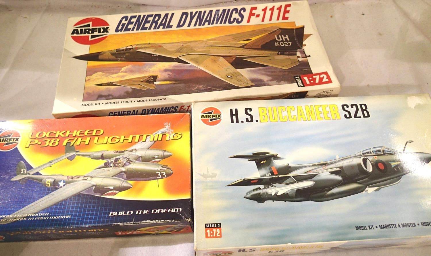 Three Airfix 1/72 scale aircraft kits; Buccaneer, F-111E and Lightning. All appear complete, unchecked. P&P Group 1 (£14+VAT for the first lot and £1+VAT for subsequent lots)