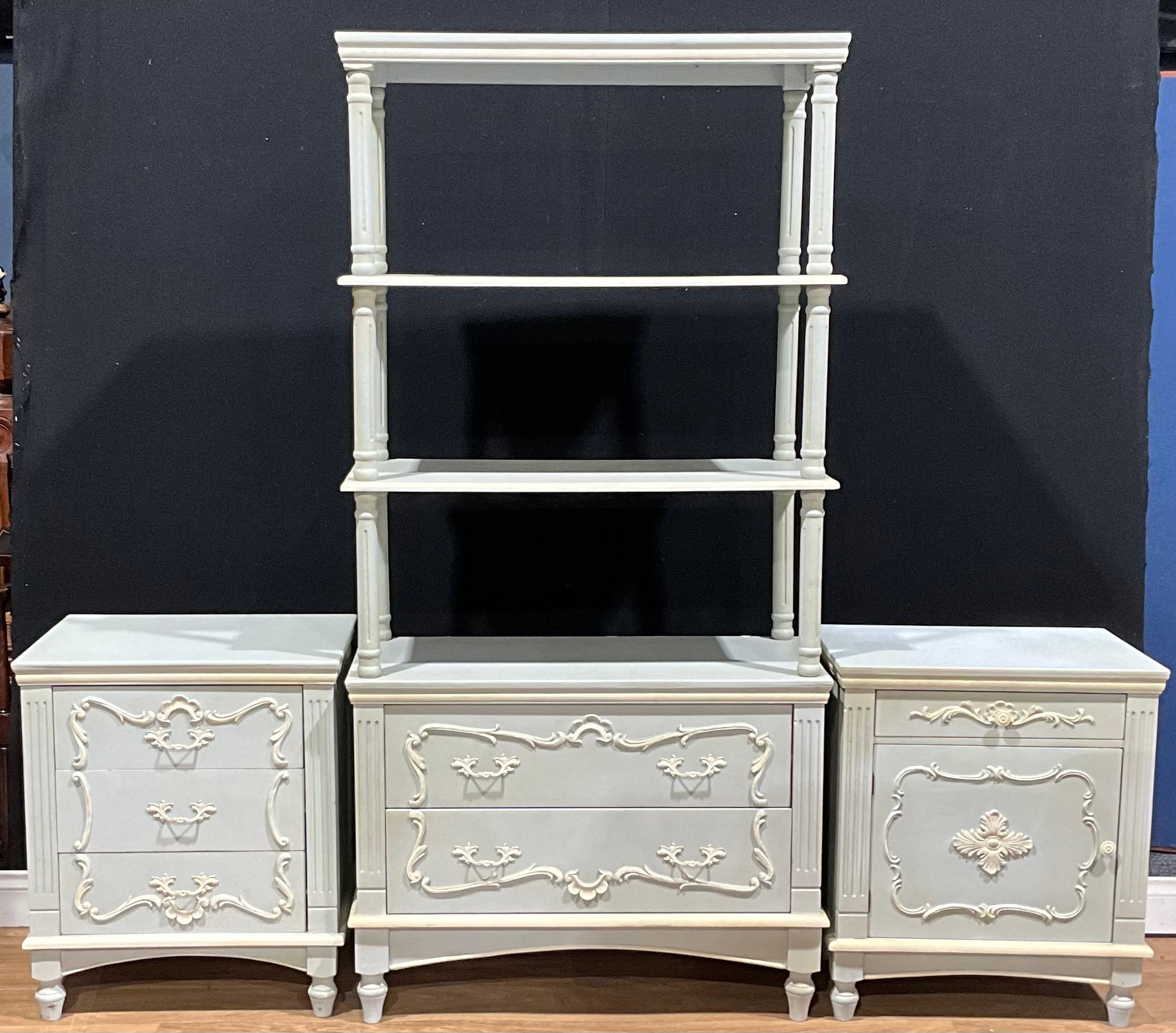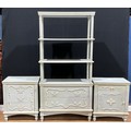 A contemporary French Rococo design open display stand or etagere, 181cm high, 89.5cm wide, 39.5cm deep; a similar commode and side cabinet (3)