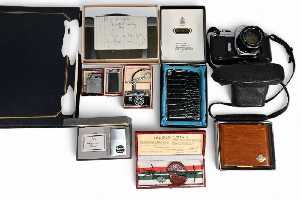 Selection of Collectables to consist of Ronson Lighters, Photo frame with Matt Busby, Wilf McGuiness autographs, Pierre Cardin Pocket Chess Set, Iron Curtain Barbwire cased, Coin/ Medallion FDC in folder, Pentax Spotmatic Camera (box)