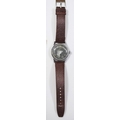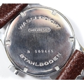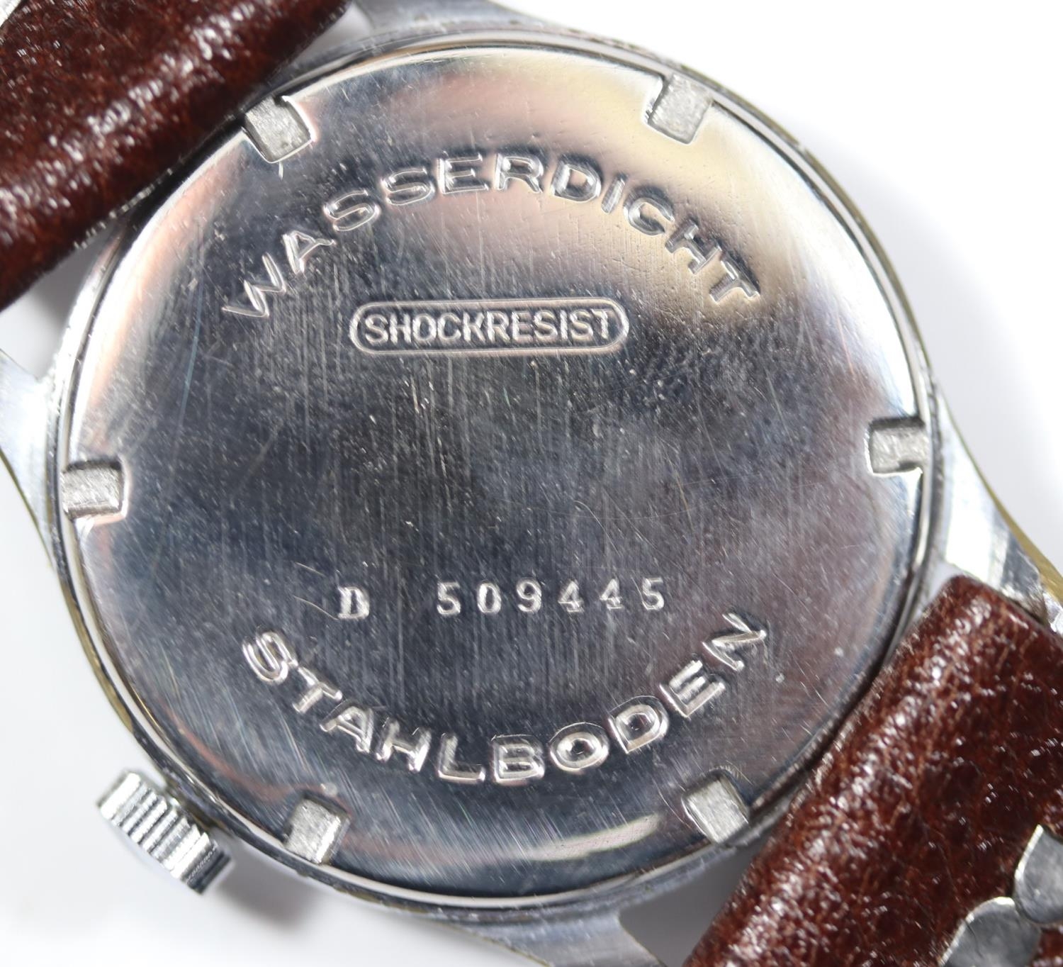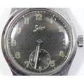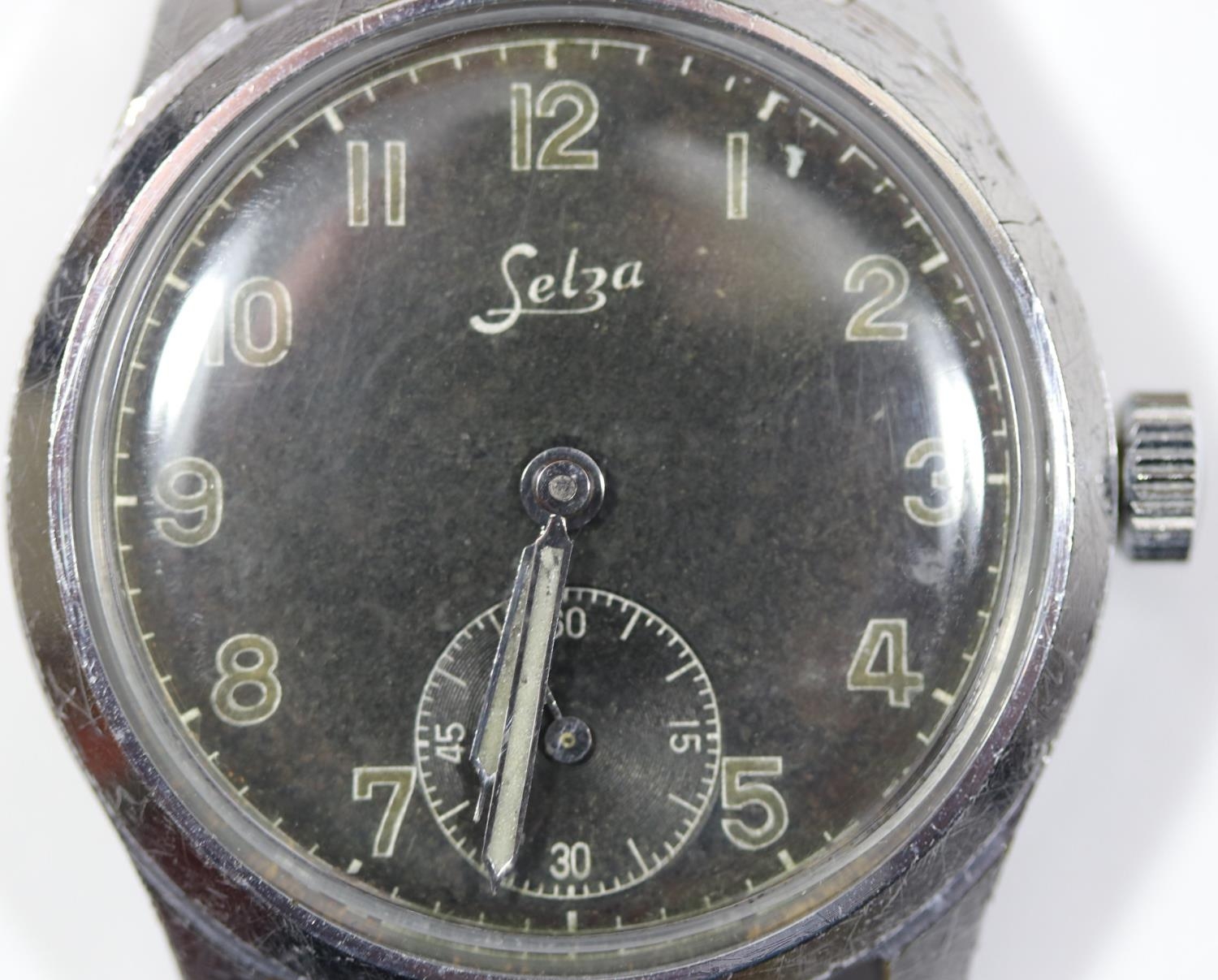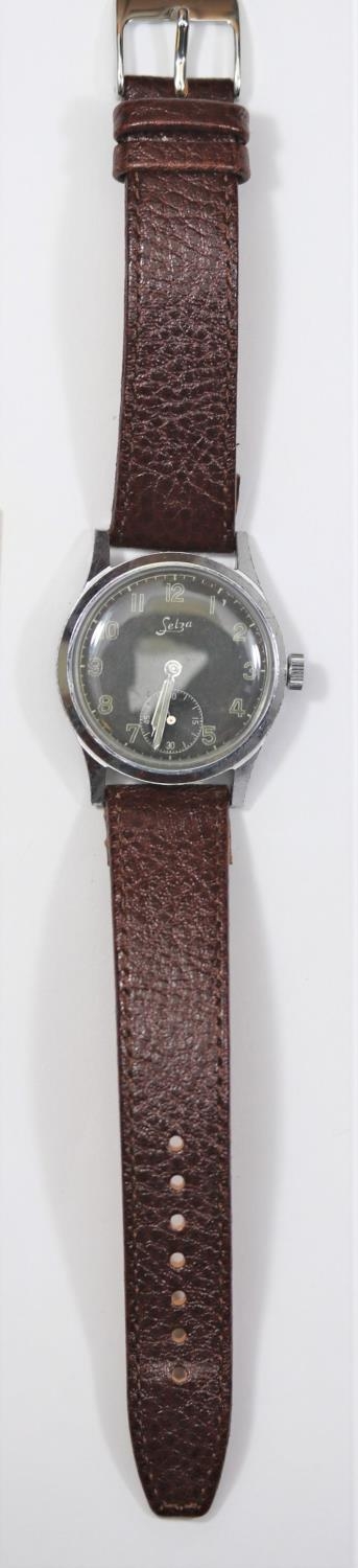 D marked Selza wristwatch. Serial D 509445. Plated case with brushed finish, light wear, 33mm without crown. Fixed bars. Screw caseback marked "Wasserdicht and Stahlboden," with "Shockresist" in centre. Black dial in excellent condition, original luminous material on markers, hands refinished. Some crazing to crystal. Selza Bienne signed AS1130, 15 jewel movement, shock protected balance, very clean, running condition. Original movement retainer ring present. VGC